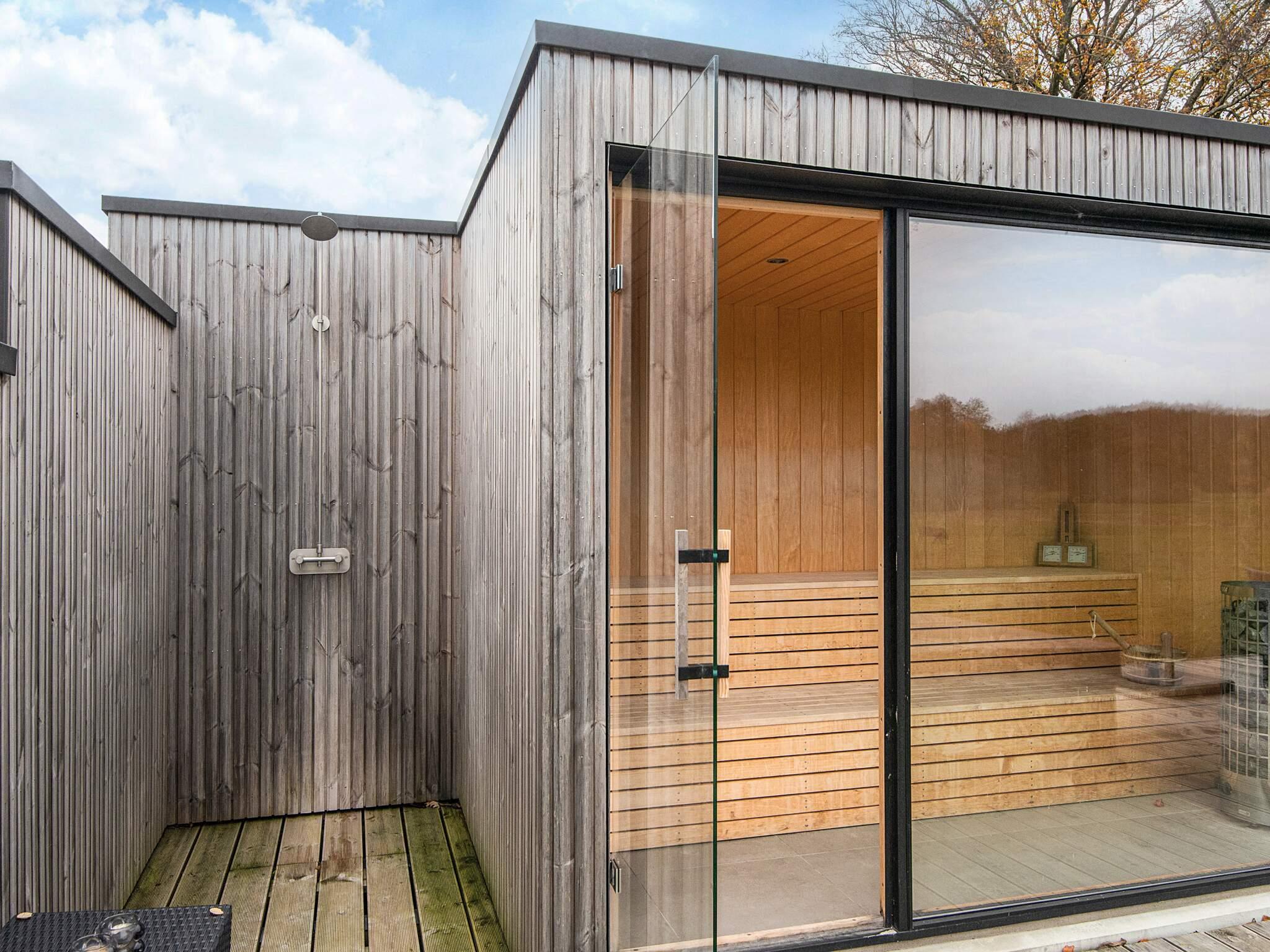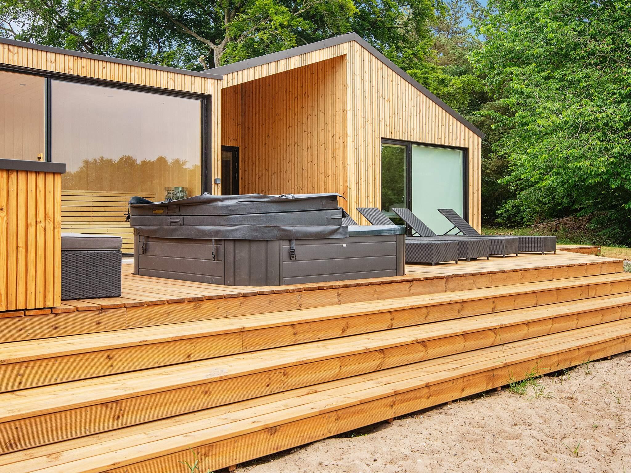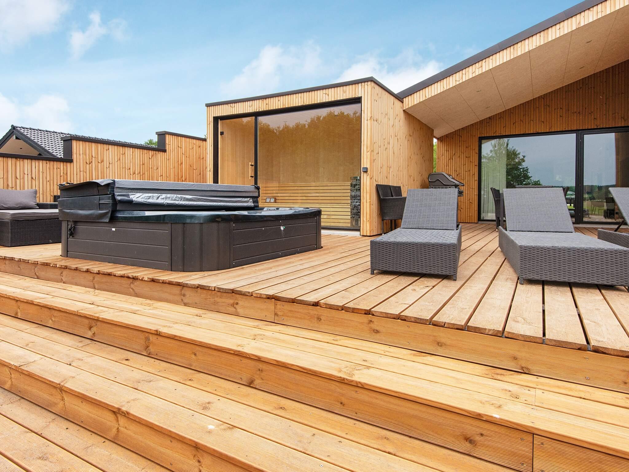 Fra stuen er der udgang til stor sydvendt terrasse med udendørs jacuzzi til op til otte personer. Her kan du nyde udsigten over det åbne landskab og, hvis du er heldig, se et rådyr løbe over marken. Der er desuden sauna (ca. 10 personer) og udendørs bruser, som også er placeret på den sydvendte terrasse, ved siden af ??spabadet. Alt i alt byder terrassen på masser af muligheder for afslapning og hygge.