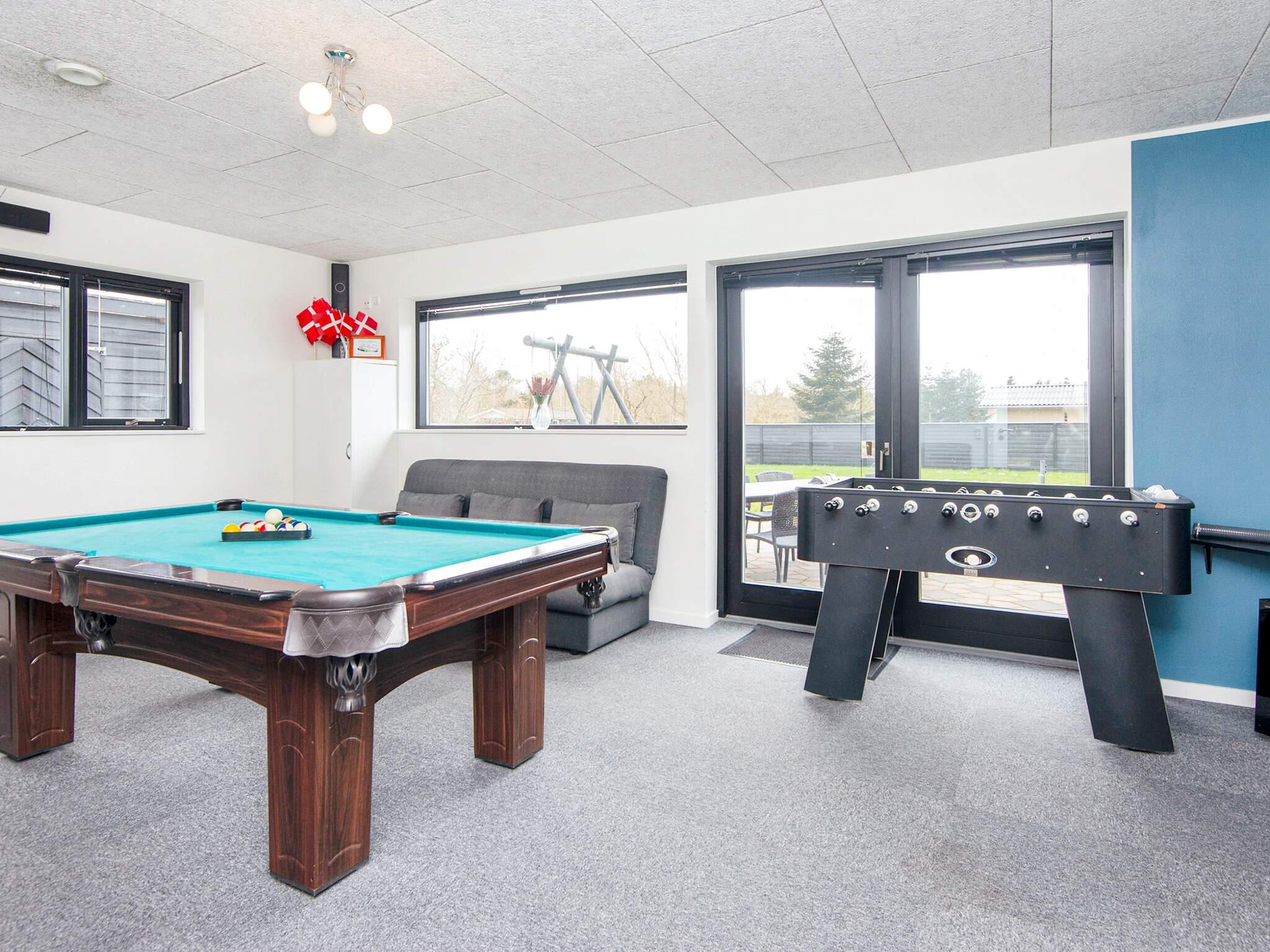 Det veludstyrede køkken har køleskab, fryseboks, mikroovn, induktionskomfur, kaffemaskine, opvaskemaskine, vaskemaskine og tørretumbler. Der er to badeværelser, begge med toilet, håndvask og bruser. Husets store trækplaster er den private, indendørs swimmingpool på 7,0 x 3,6 m med en dybde på 1,6 m. Der er desuden billardbord og legeredskaber til børnene, så underholdningen er sikret året rundt.