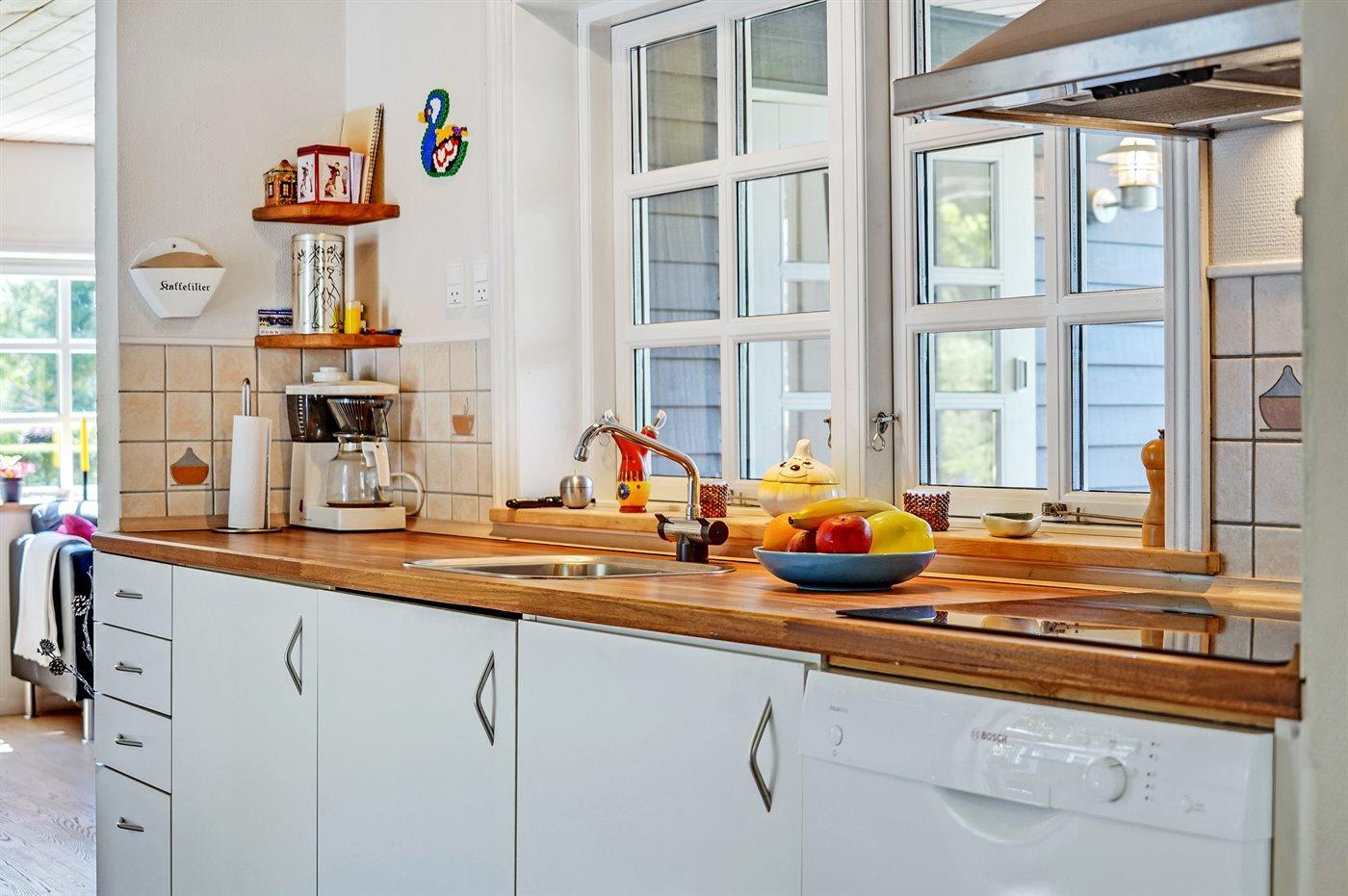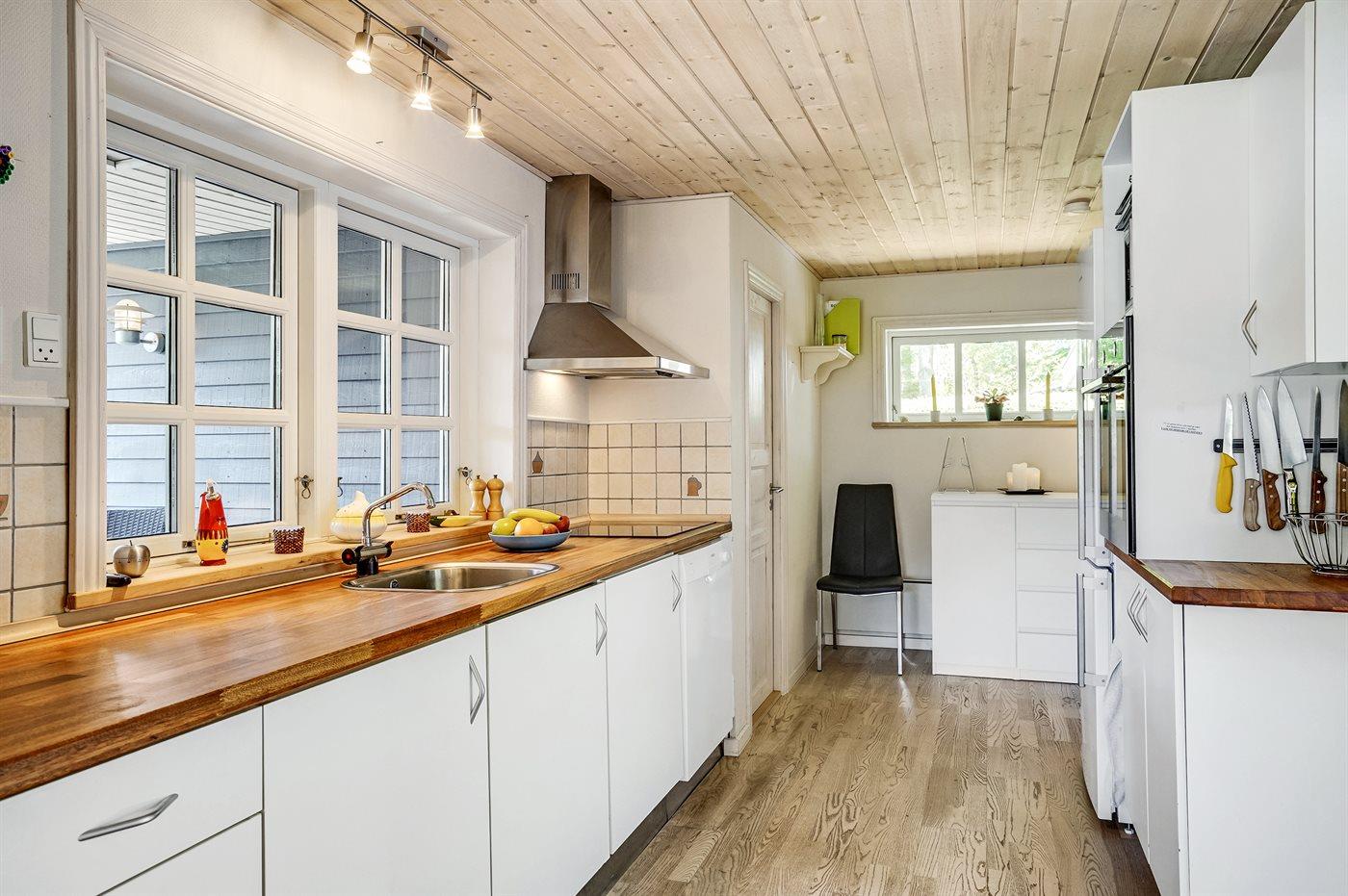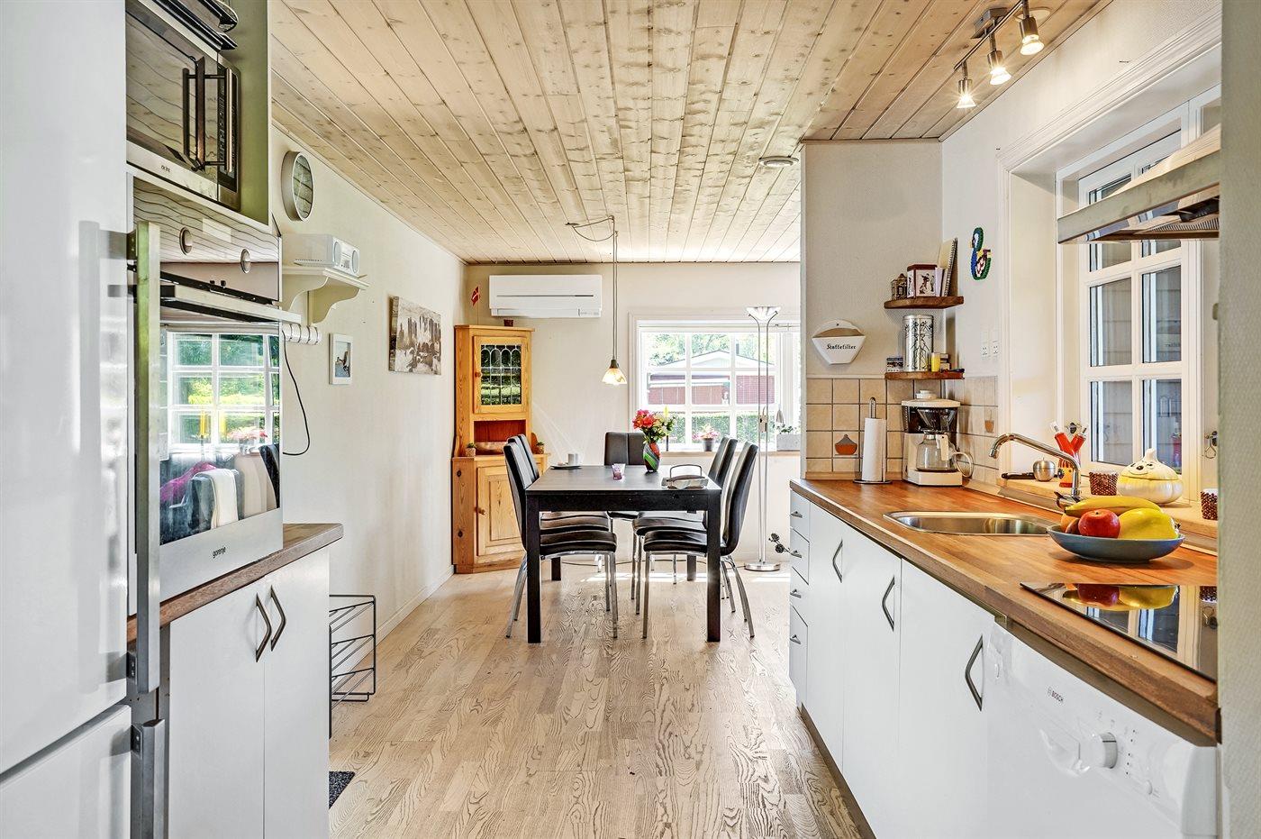 Køkkenet er udstyret med 1 køleskab. Der er 4 keramiske kogeplader, varmluftovn, mikrobølgeovn samt opvaskemaskine.