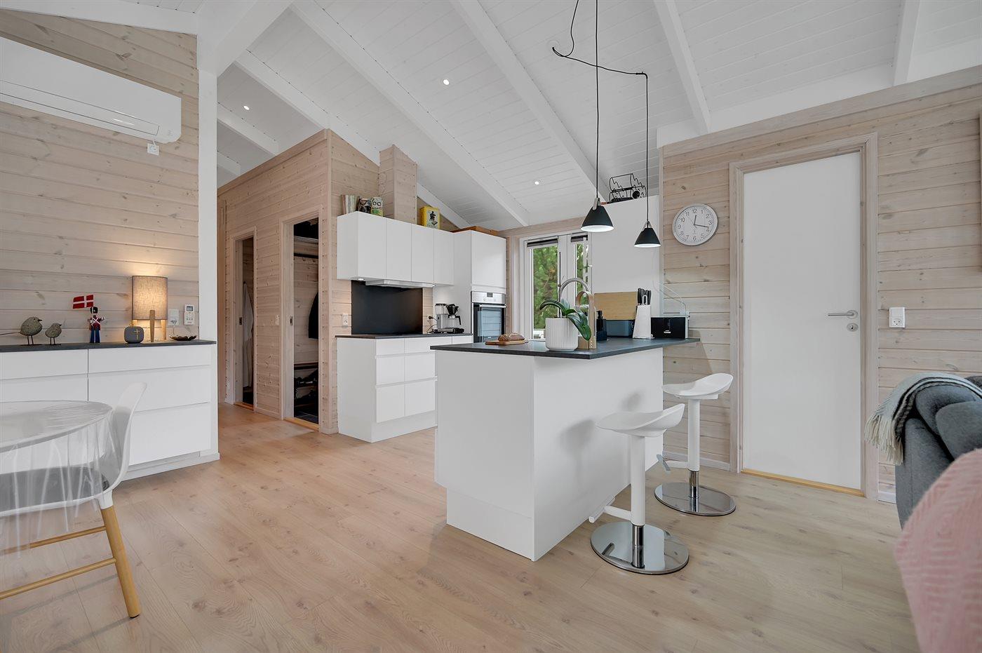 Køkkenet er udstyret med 1 køleskab. Der er 4 induktionskogeplader, varmluftovn samt opvaskemaskine.