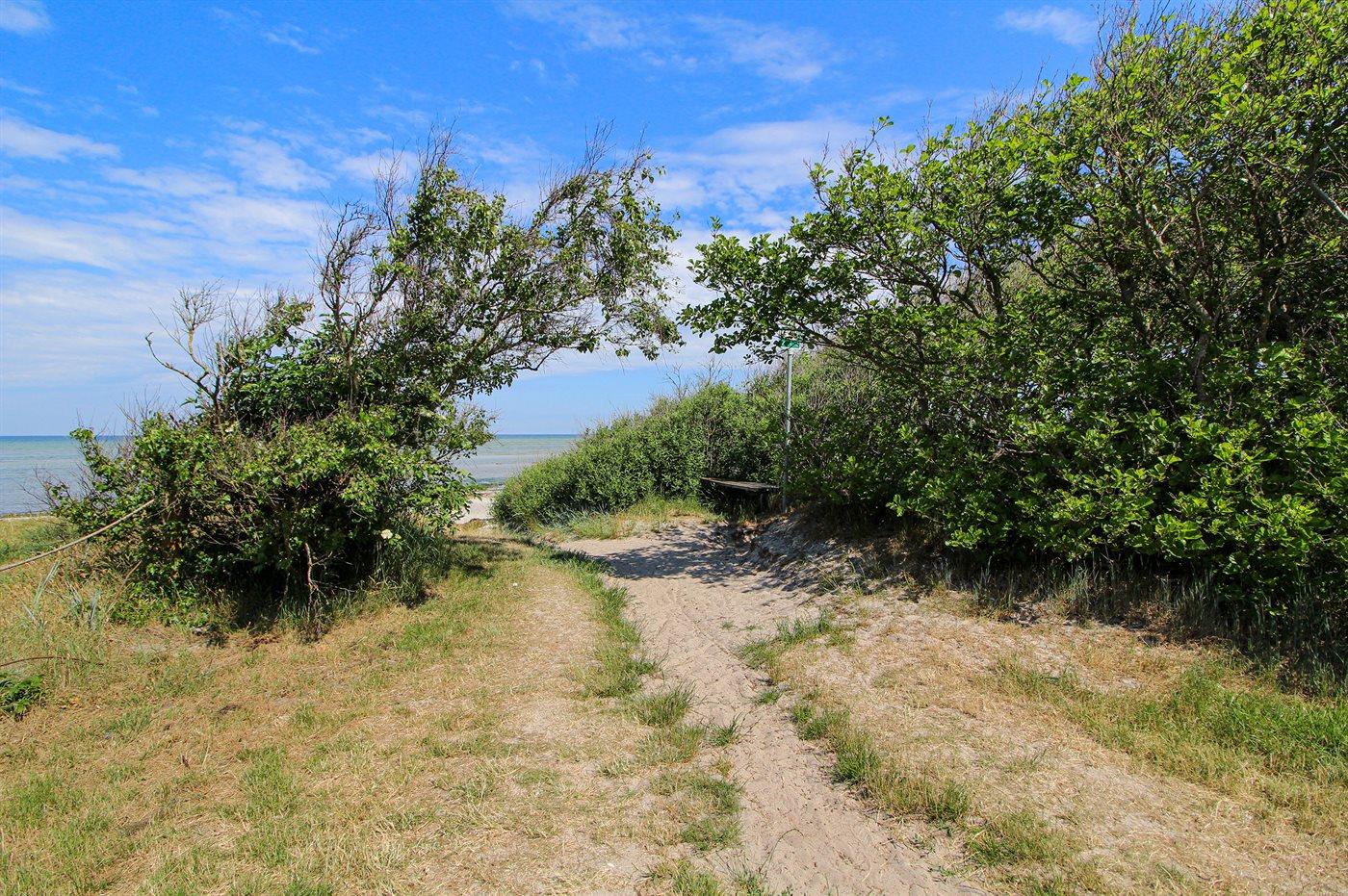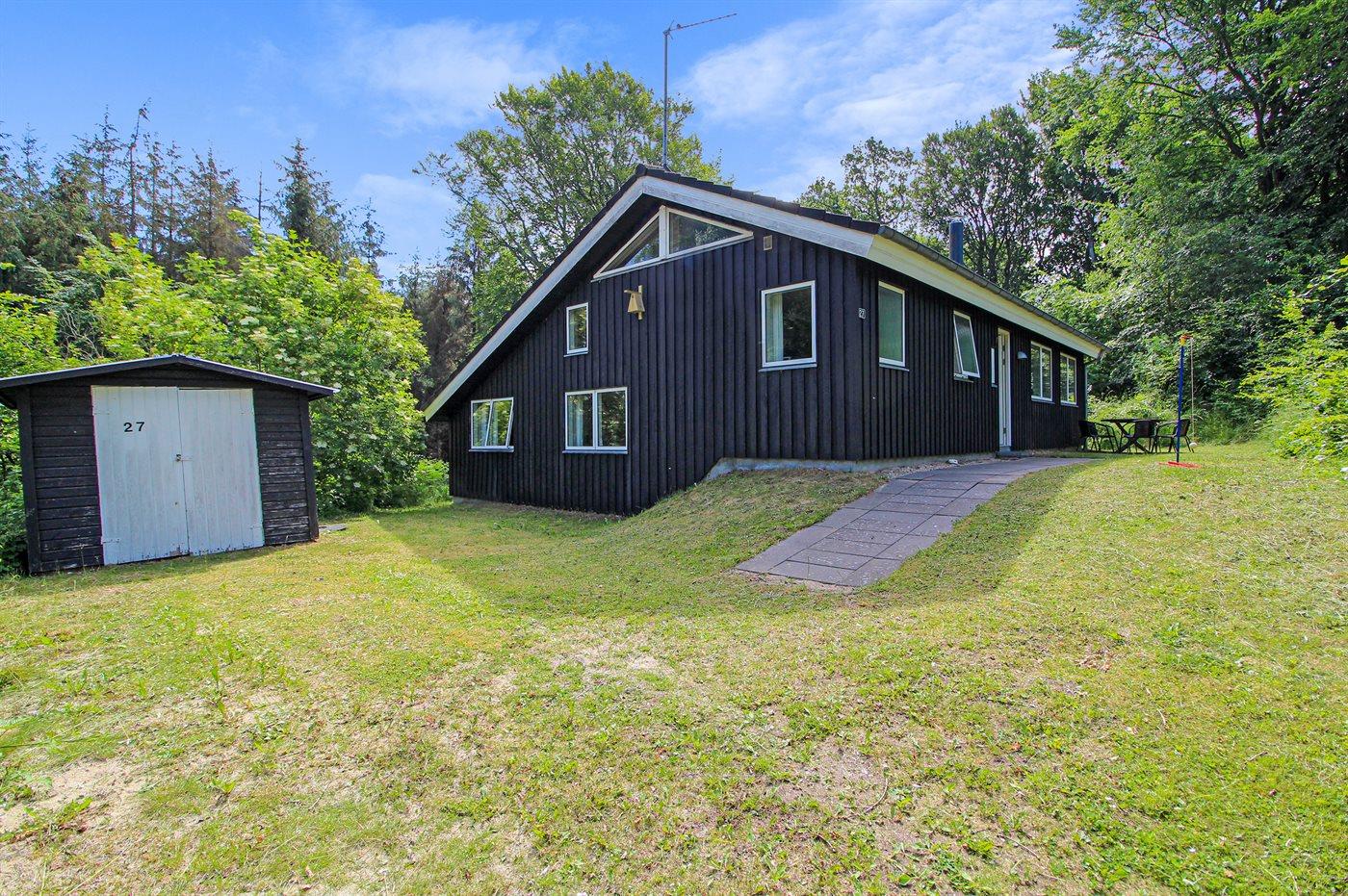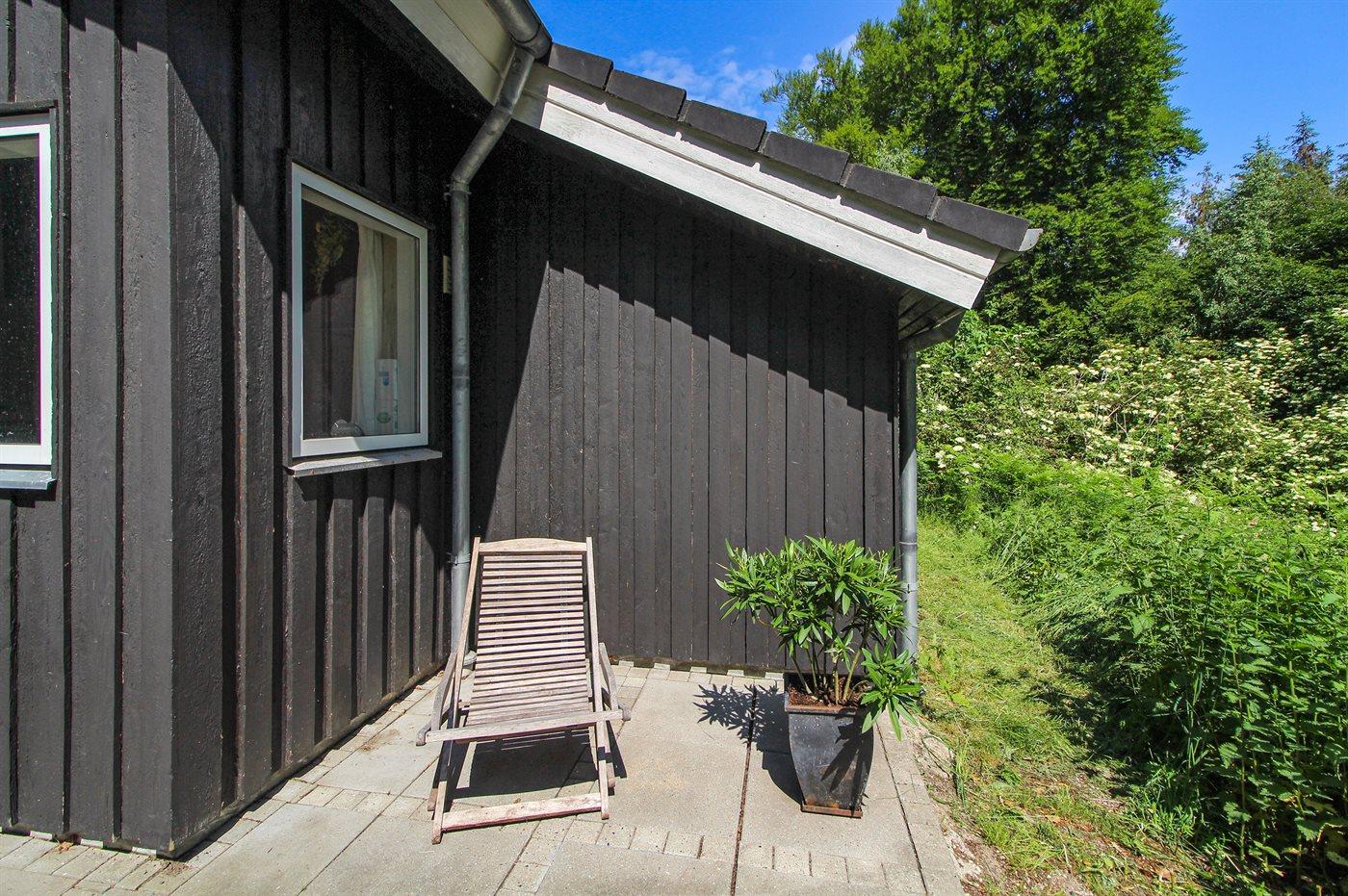 Sommerhus med god plads beliggende i naturskønne omgivelser på en ugeneret grund omgive af høje træer. Huset ligger i udkanten af sommerhusområdet, på en lukket sidevej, hvor en bakke bag huset fører direkte mod store skovarealer. I nærheden ligger god badestrand.