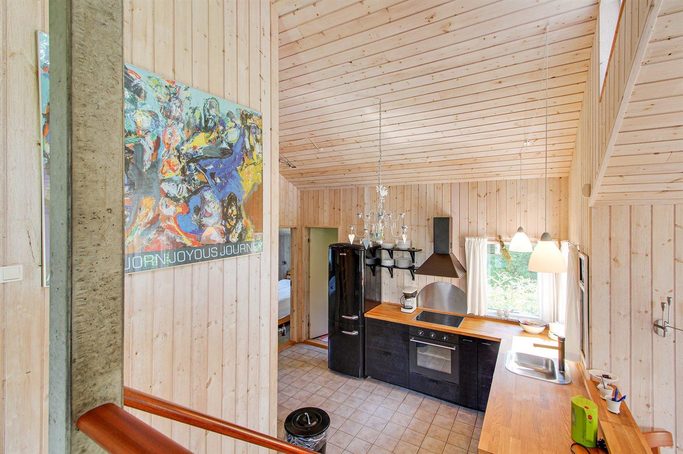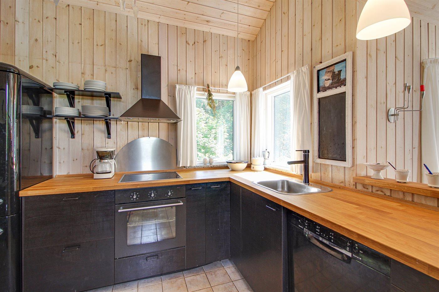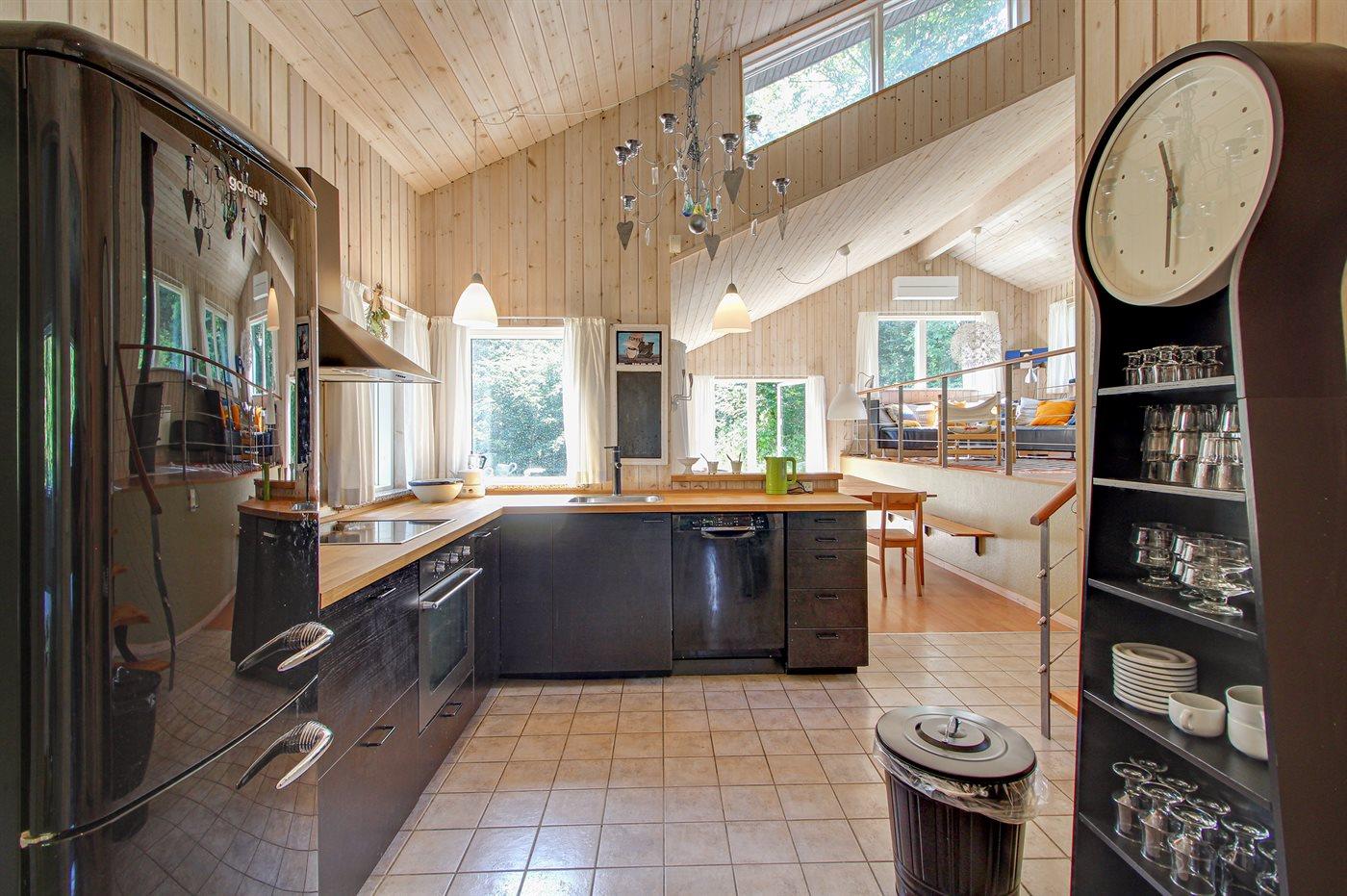 Køkkenet er udstyret med 1 køleskab. Der er 4 keramiske kogeplader, varmluftovn samt opvaskemaskine.