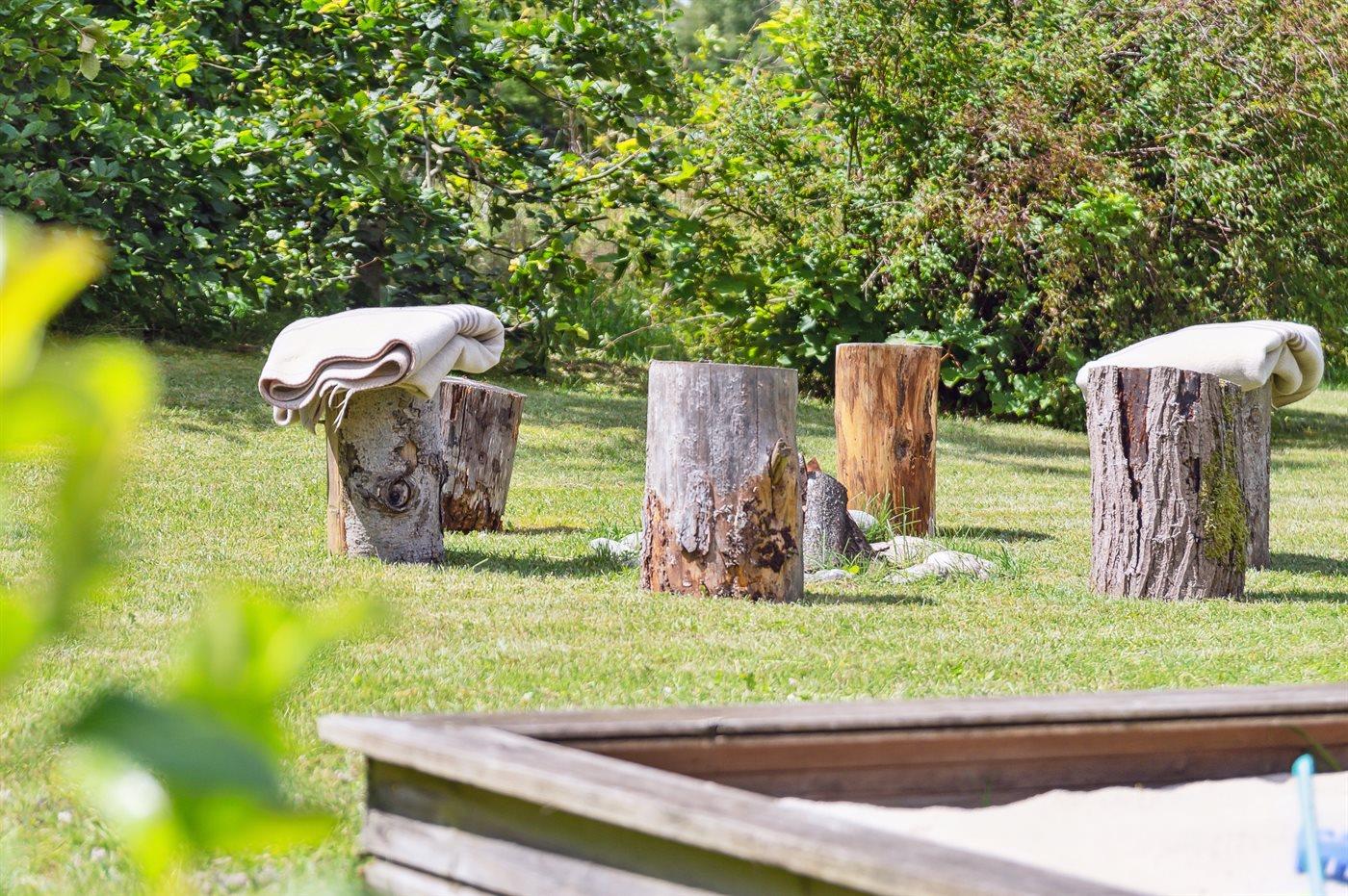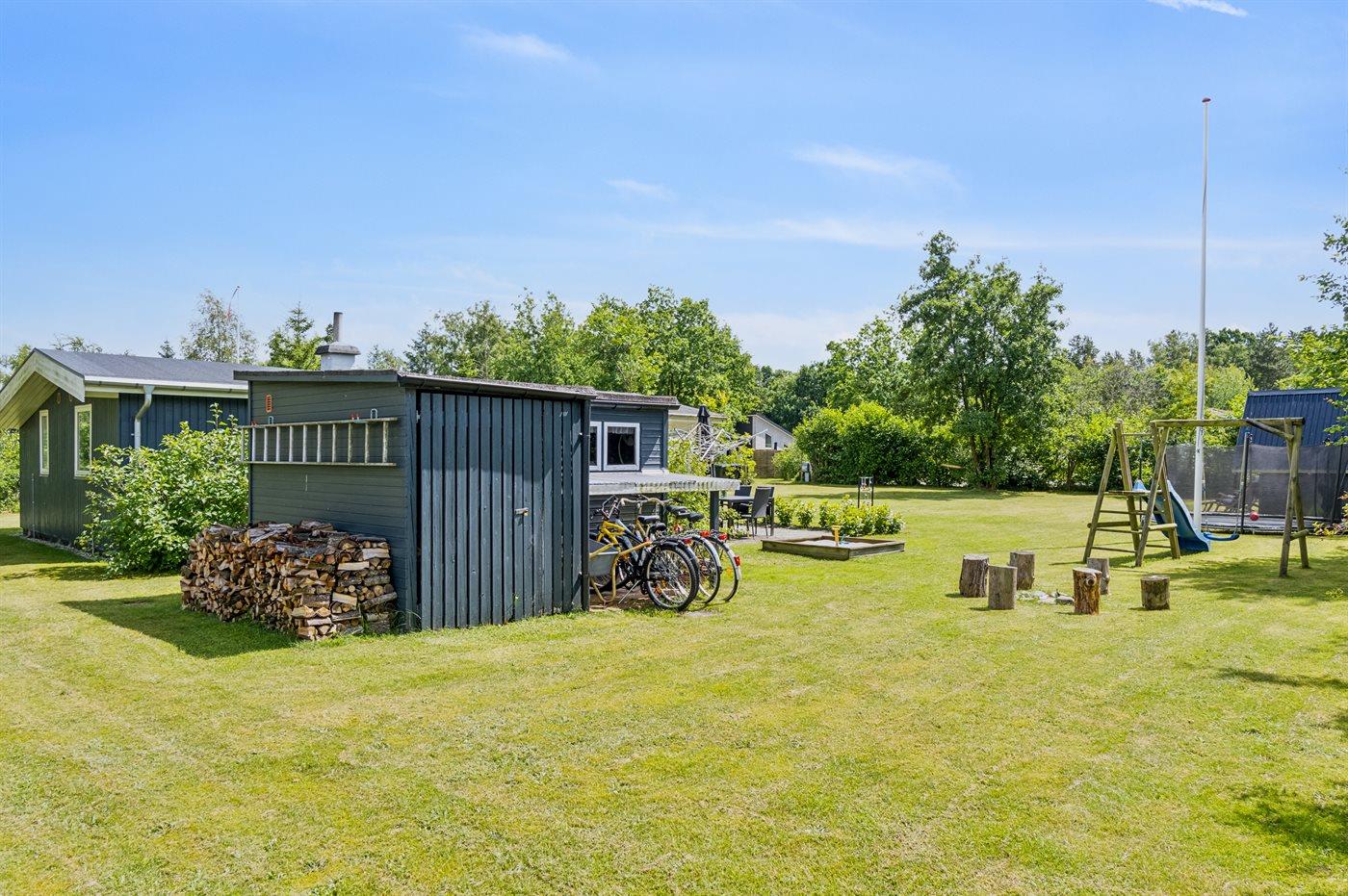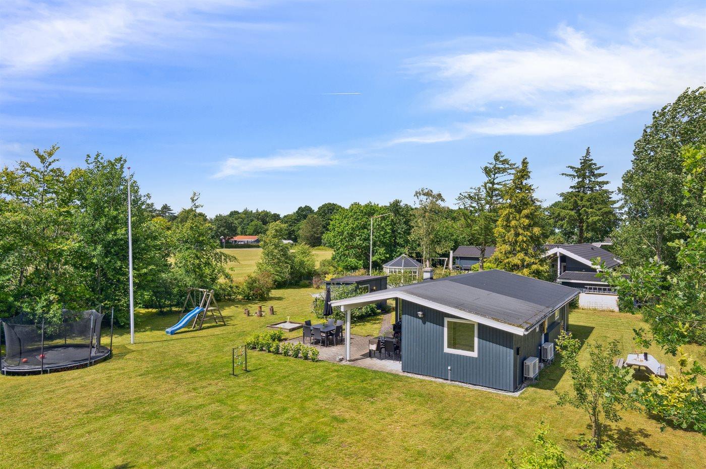 Ferieboligen er beliggende på en 1200 m² stor naturgrund. Der er 300 m til havet. Nærmeste forretning er beliggende i en afstand af 500 m. Til ferieboligen hører 24 m² terrasseareal. Desuden er der 14 m² overdækket terrasse. Der er redskabsrum. Gynge. Sandkasse. Trampolin. Rutchebane. Bålsted. Grill til rådighed. Der er installeret stik til opladning af elbil. Type 2 stik. Med 11 kW ladeeffekt. Parkering ved ferieboligen.