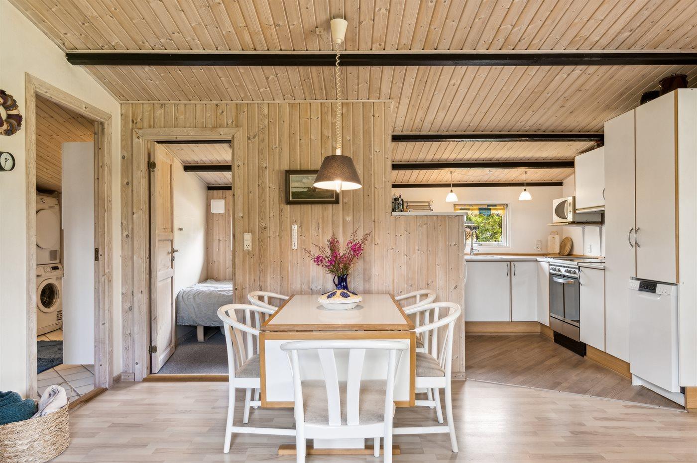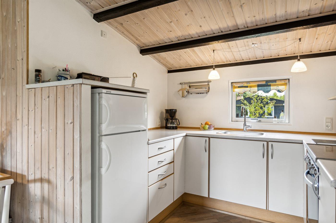 Køkkenet er udstyret med 1 køleskab. Der er 4 elkogeplader, varmluftovn, mikrobølgeovn samt opvaskemaskine.
