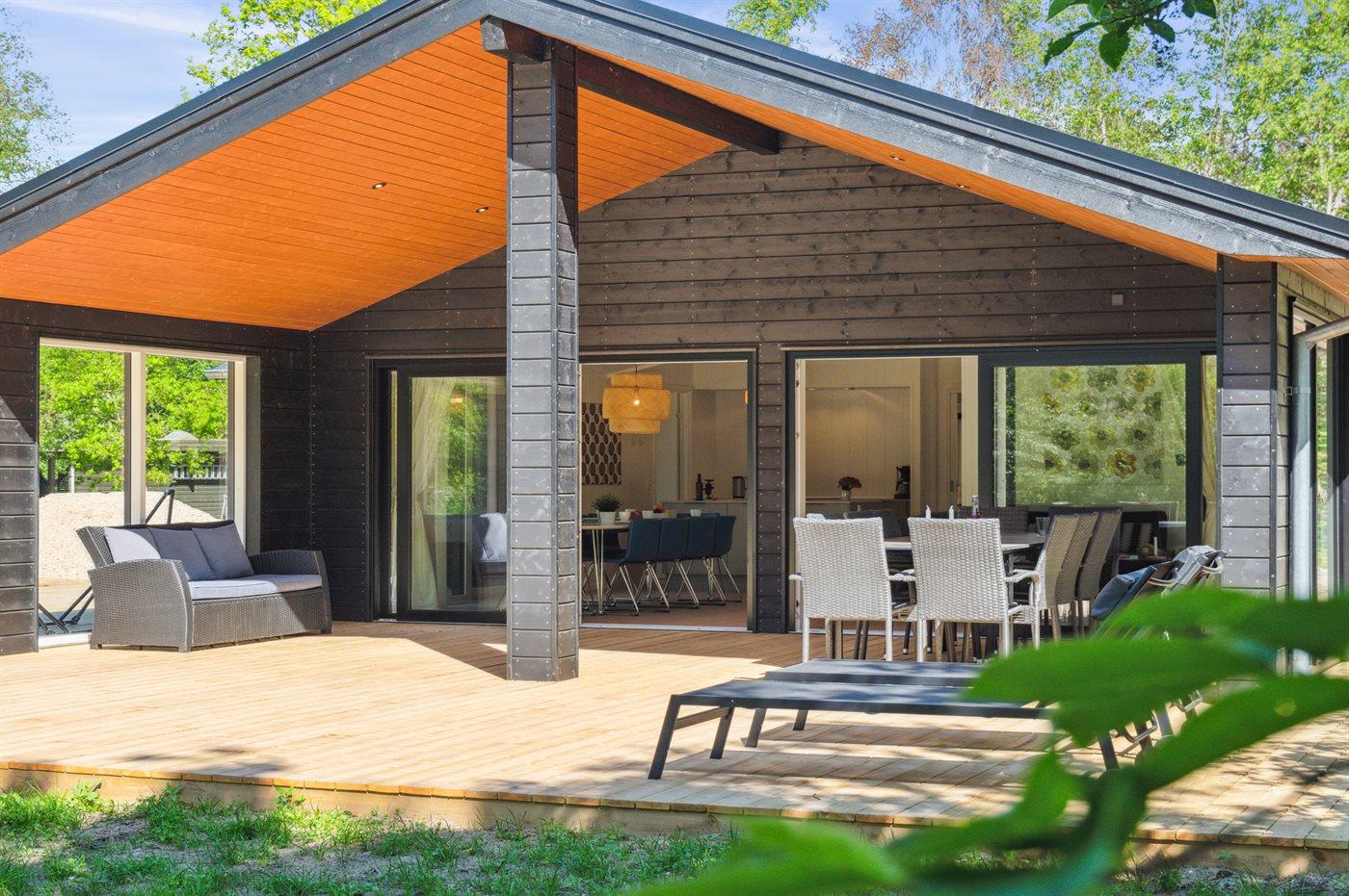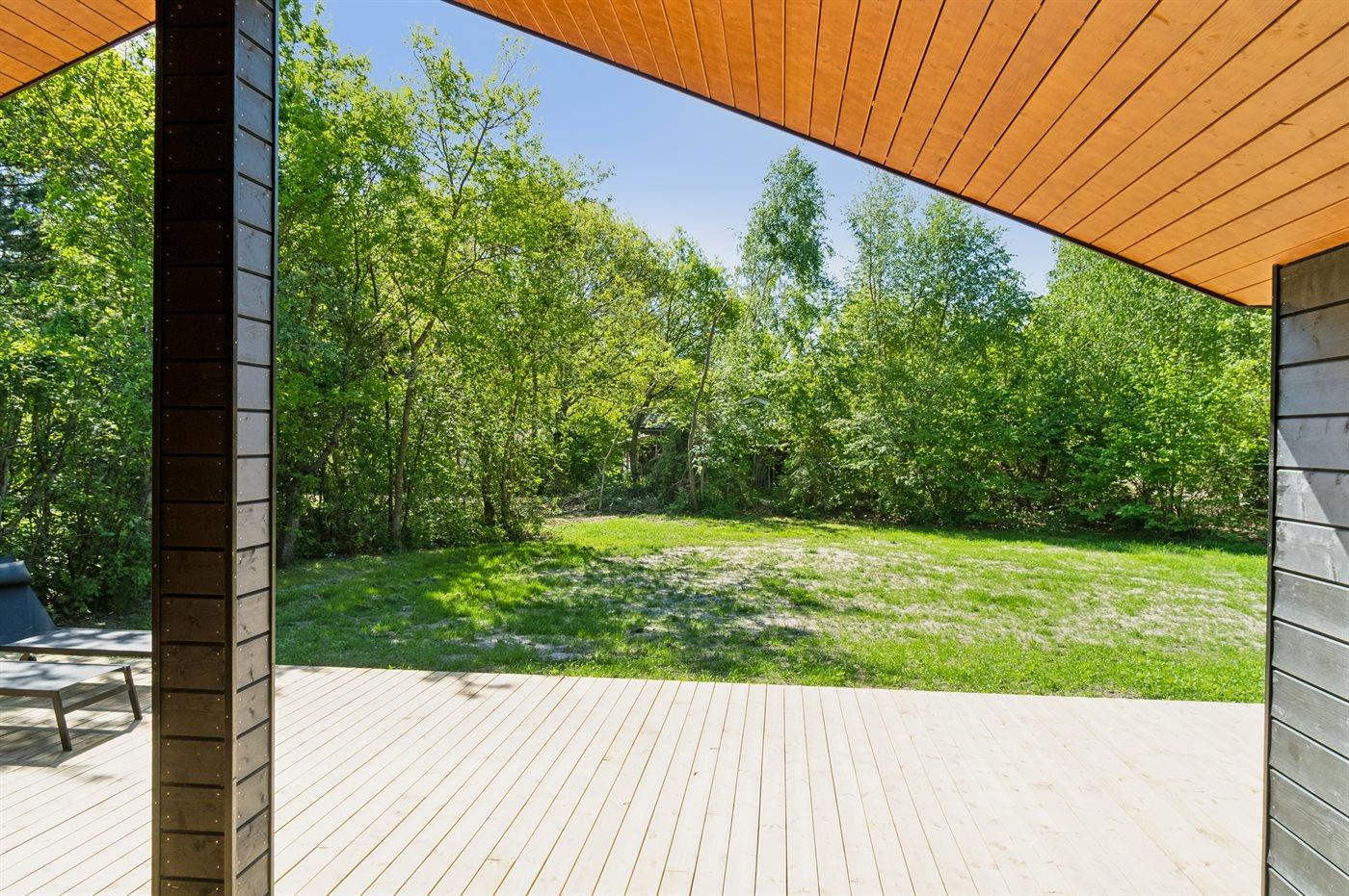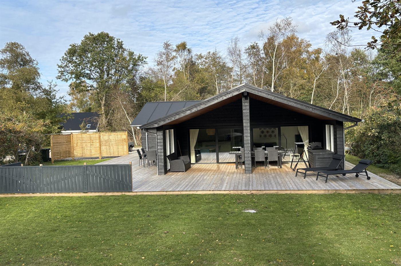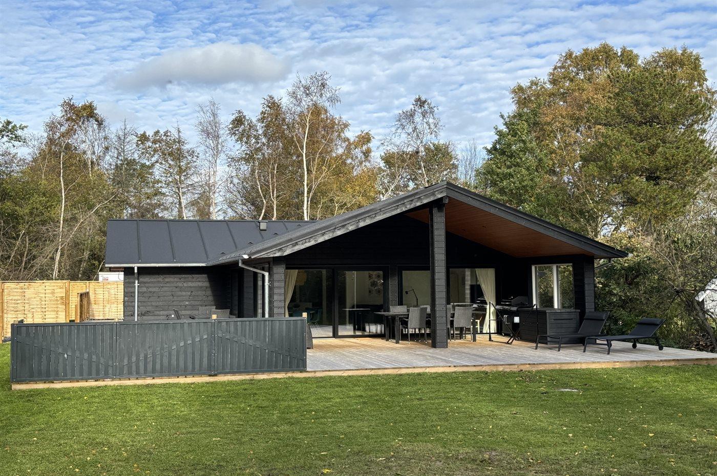 Nybygget sommerhus i Fjellerup med aktivitetsrum, stor terrasse og nær strand.