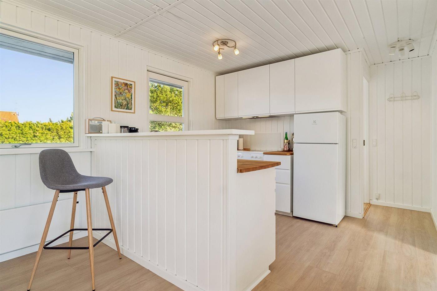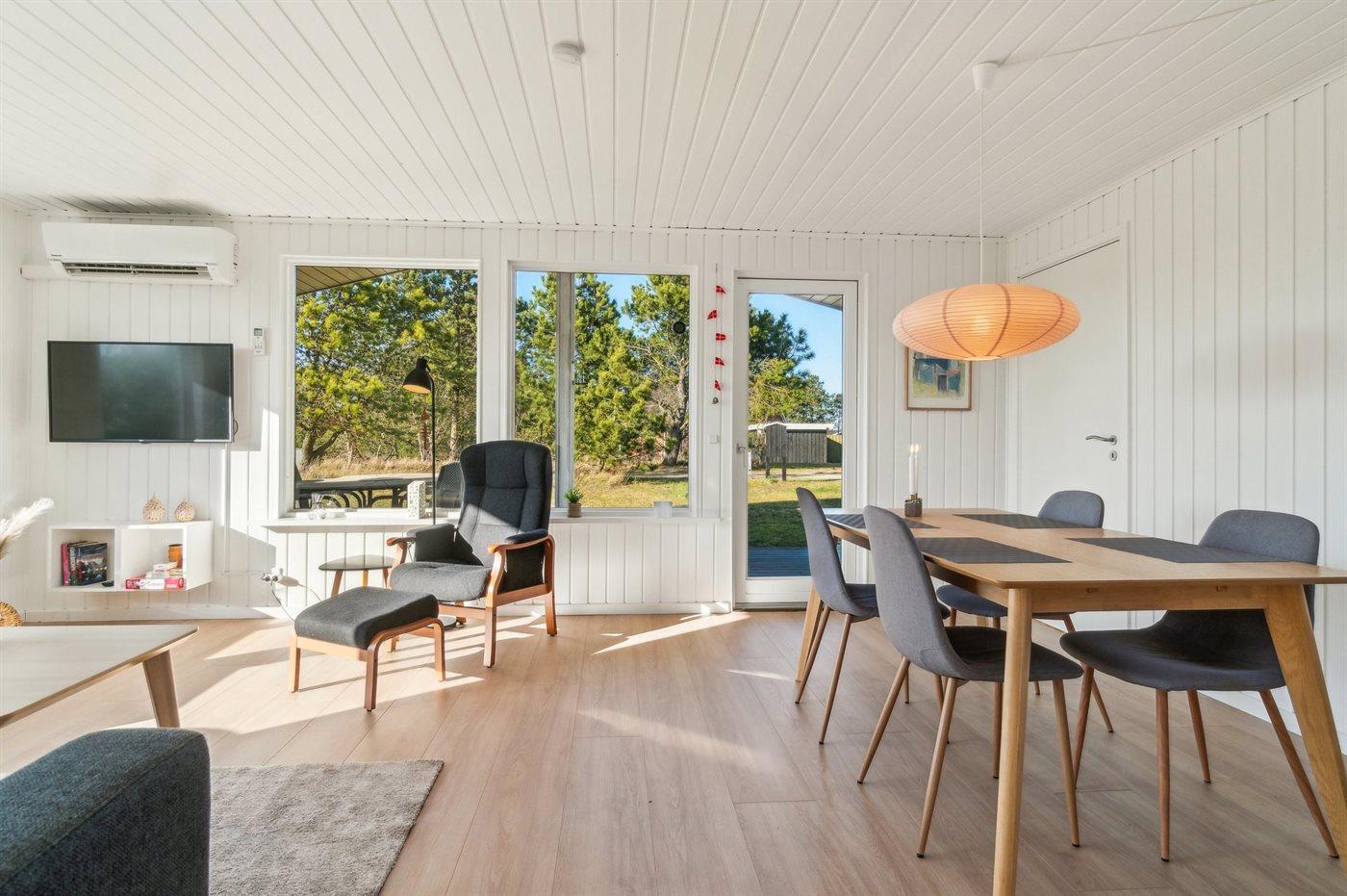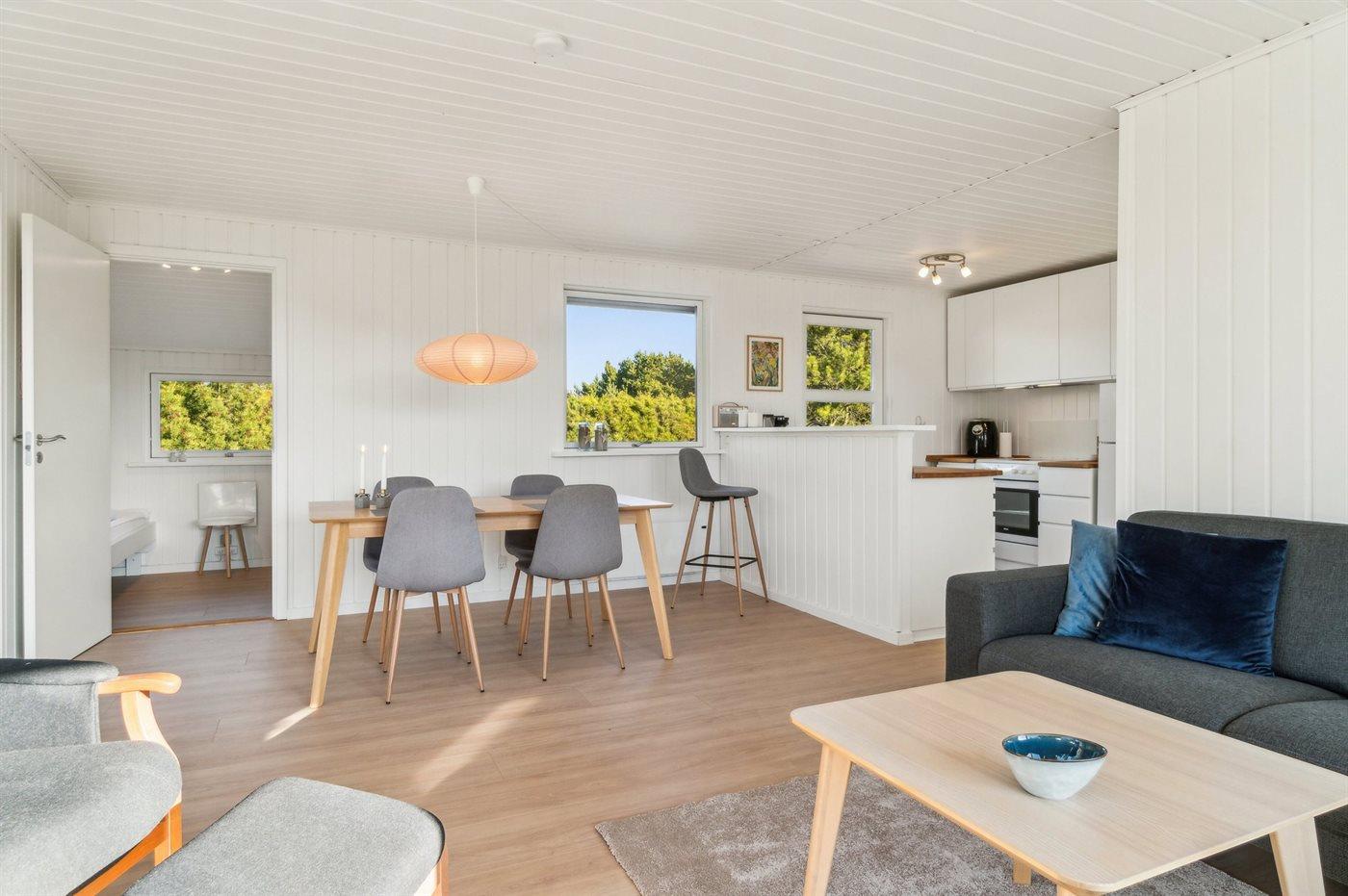 Indvendig fremstår sommerhuset lyst og moderne med en god indretning, som passer rigtig fint til f.eks. en familie med børn, og her er mulighed for at invitere bedsteforældrene med på ferie. Husets midtpunkt er det skønne køkken-alrum, som er kombineret med opholdsstuen, hvor de mange vinduer giver et virkelig godt lysindfald. Der er fra stuen direkte adgang til terrassen.