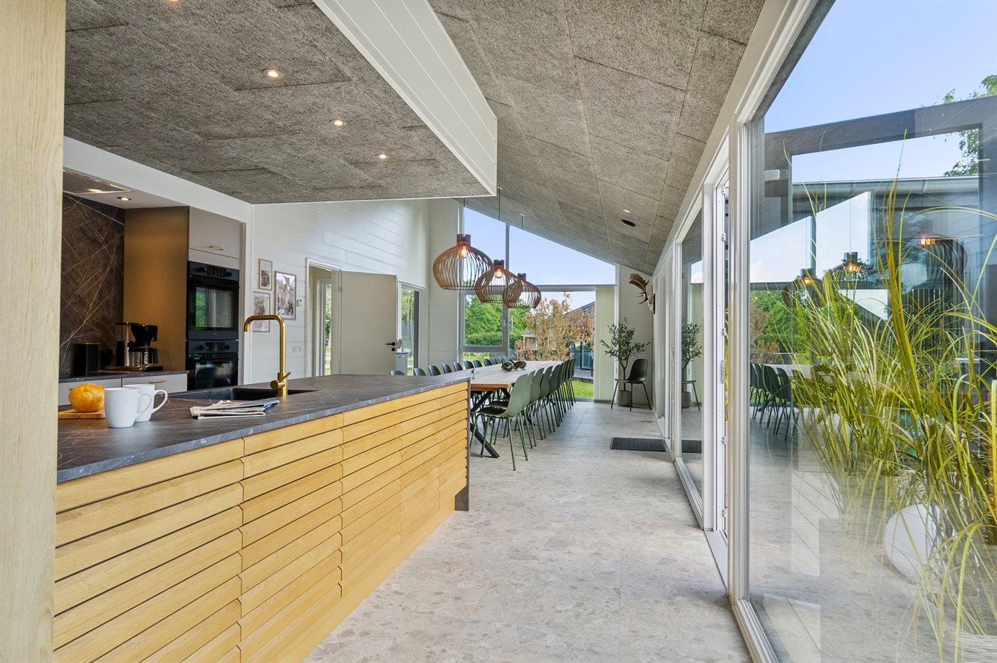 Køkkenet er udstyret med 3 køleskabe. Der er 4 induktionskogeplader, 2 varmluftovne, mikrobølgeovn samt 2 opvaskemaskiner.