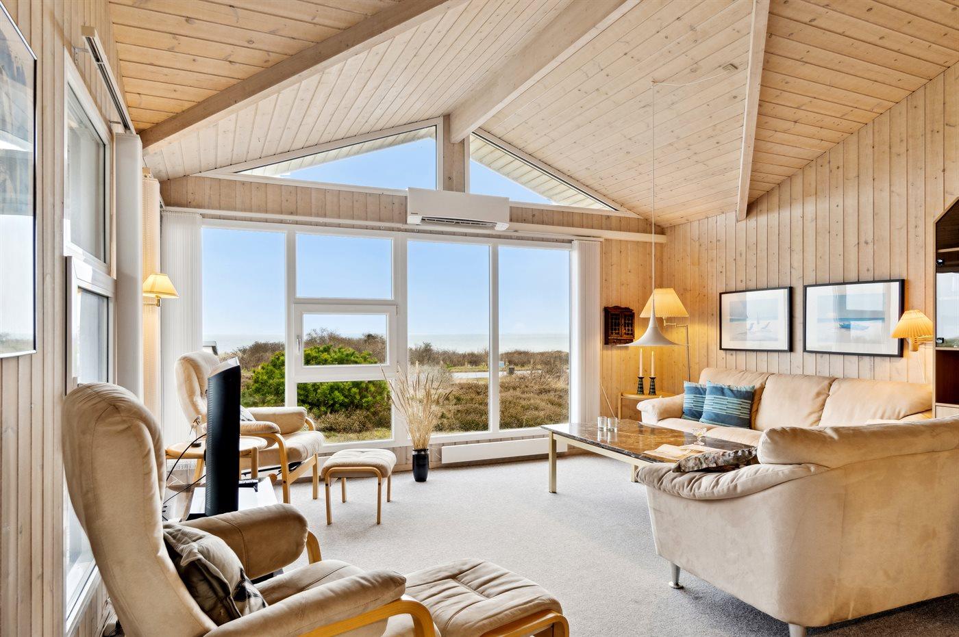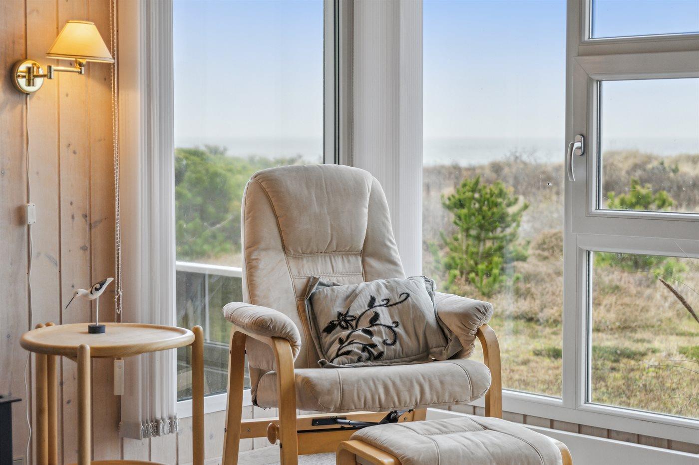 Indvendig fremstår sommerhuset lyst med en god indretning, som passer rigtig fint til f.eks. en familie med børn. Der er også mulighed for at invitere bedsteforældrene med på ferie, da der findes et anneks, som er oplagt til større børn eller netop bedsteforældre. Dette betyder at huset faktisk kan rumme op til to familier, som ønsker at holde en fælles ferie i disse fantastiske omgivelser. Husets midtpunkt er den store opholdsstue, hvor de store vinduespartier giver et virkelig godt lysindfald og hvor den smukke udsigt kan nydes. Der er fra stuen direkte adgang til den skønne terrasse.