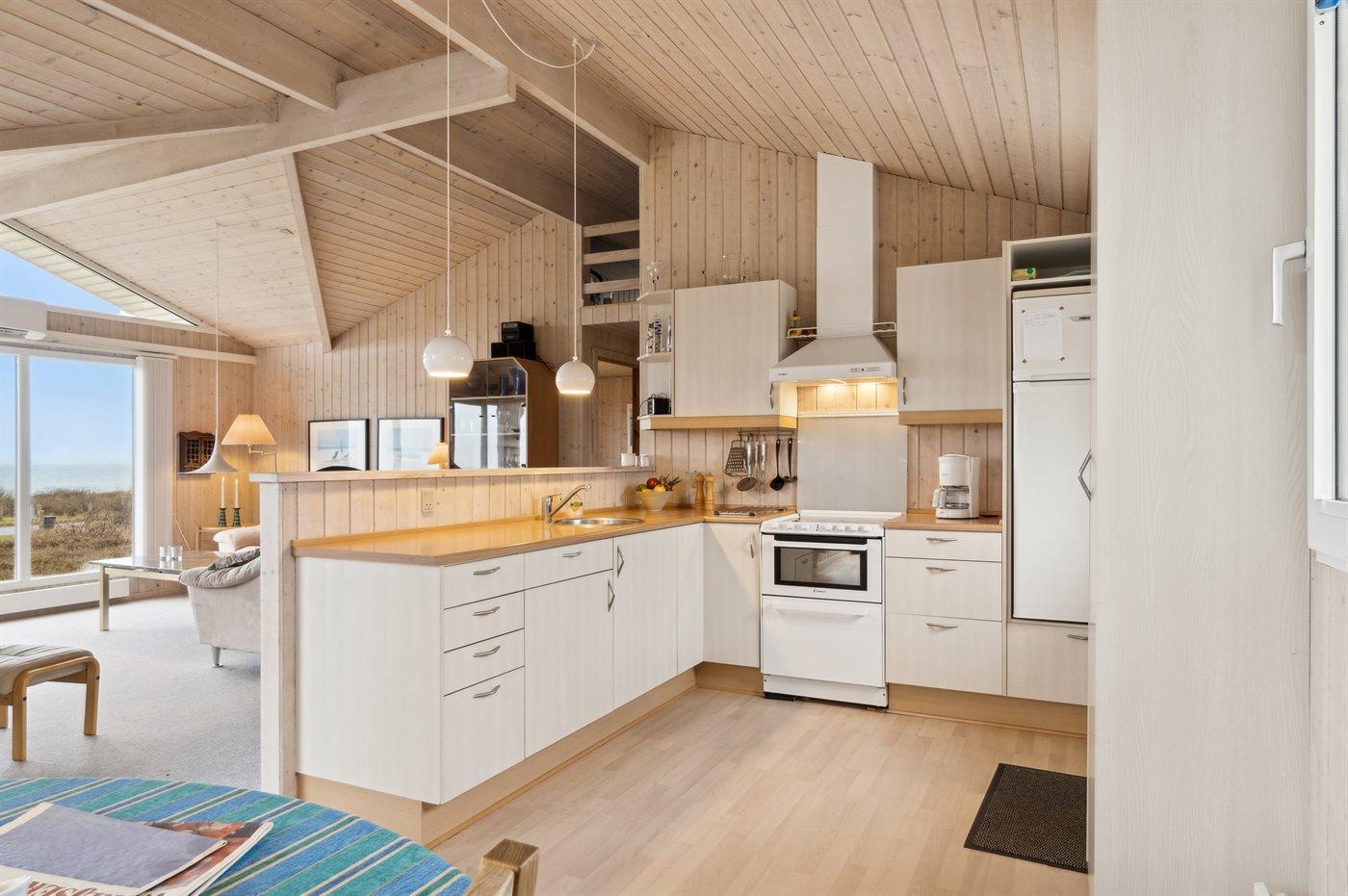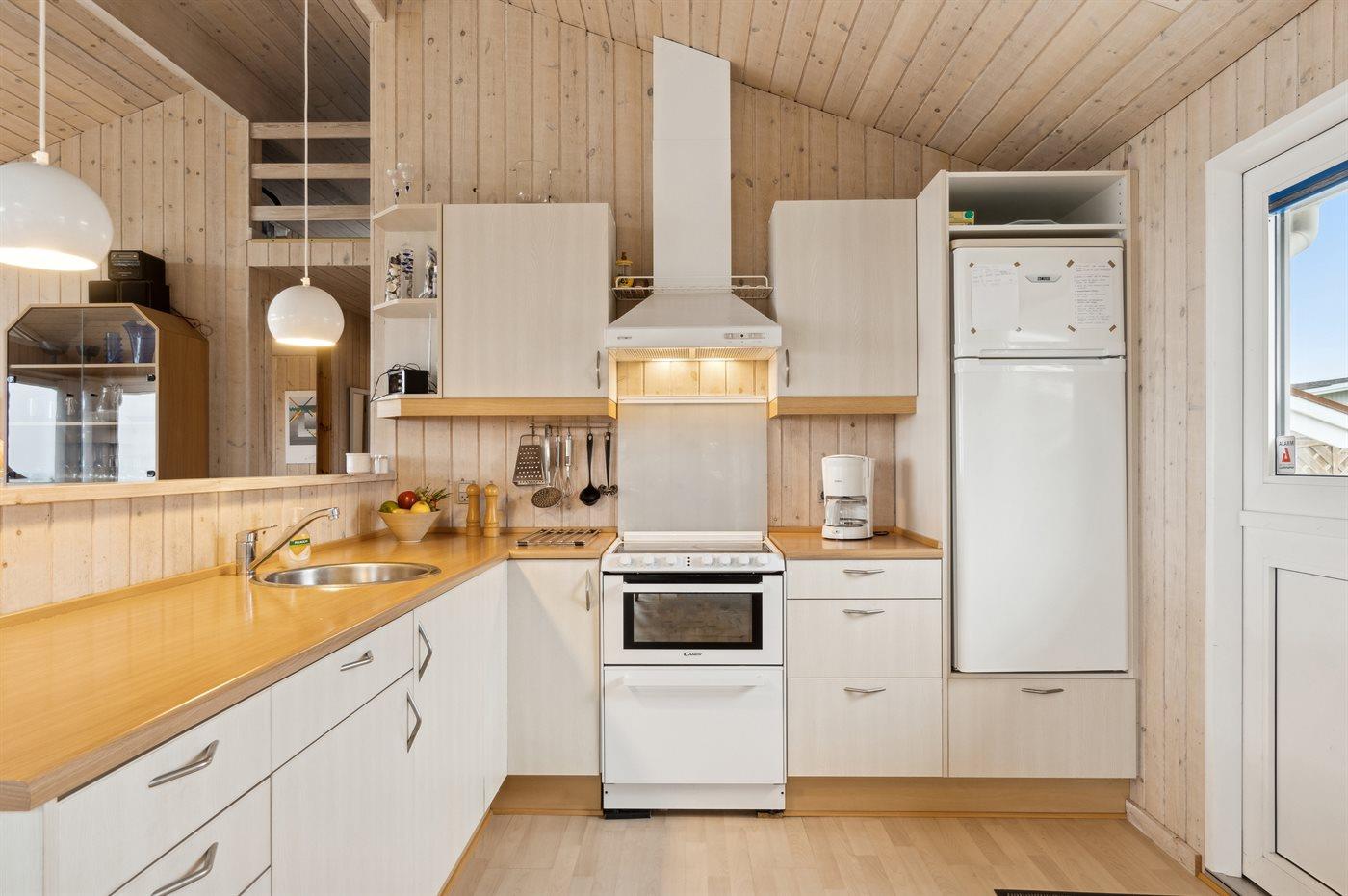 Køkkenet er udstyret med 1 køleskab. Der er 4 keramiske kogeplader, varmluftovn samt opvaskemaskine.