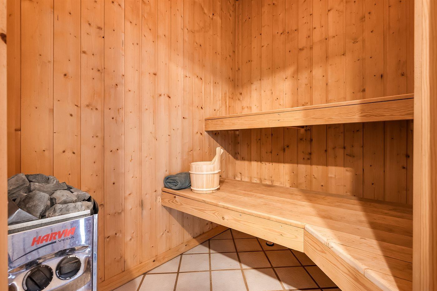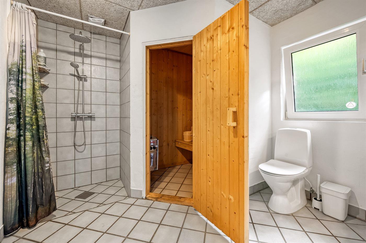 Der er 2 badeværelser med bruser og 2 toiletter. Der er gulvvarme på 1 badeværelse. I saunaen er der mulighed for afslapning.