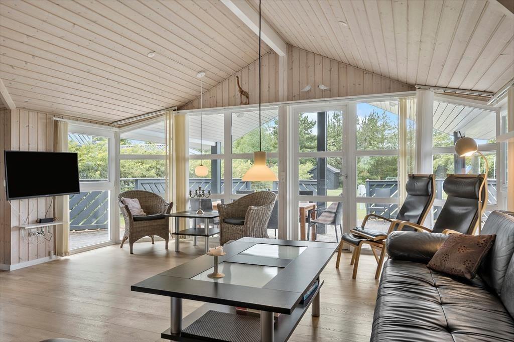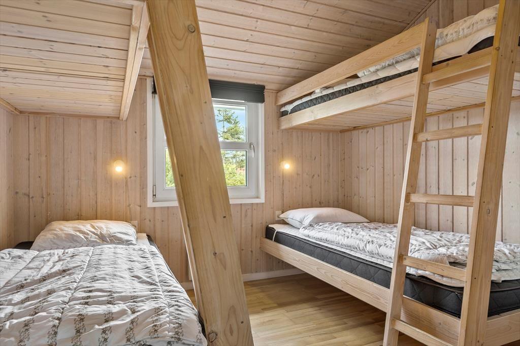 Velkommen indenfor Forestil dig at vågne op i et velholdt sommerhus fra 2011 med højt til loftet og store vinduespartier, der lader morgensolen strømme ind. Huset er en oase af komfort og hygge, skabt til at danne rammen om mindeværdige stunder. Gå ud gennem terrassedøren til en vidunderlig sydvestvendt terrasse, hvor du kan nyde morgenkaffen med udsigt over den smukke have. Her kan både børn og voksne lege og slappe af i fredelige omgivelser. Indenfor byder opholdsrummet på et åbent køkken, der smelter sammen med alrummet og stuen - et samlingspunkt, hvor familien kan samles om madlavning, brætspil eller bare afslapning foran fjernsynet. Efter en dag fyldt med oplevelser kan du trække dig tilbage til et af de fire soveværelser. Fire med dobbeltsenge og èt med fire gode køjesenge. To badeværelser sikrer, hvor der er mulighed for en boblende og afslappende spa eller en hed tur i saunaen. Bryggerset er praktisk indrettet med plads til overtøj og barnevogn, og både vaskemaskine og tørretumbler står klar til brug. Har du brug for flere sengepladser, så tjek om naboen hus nr. 8841 er ledigt.