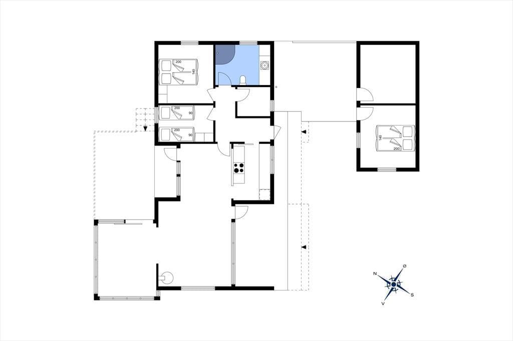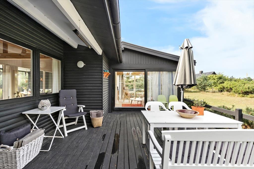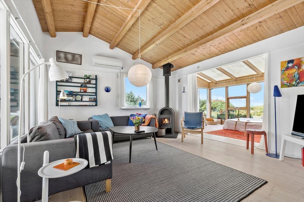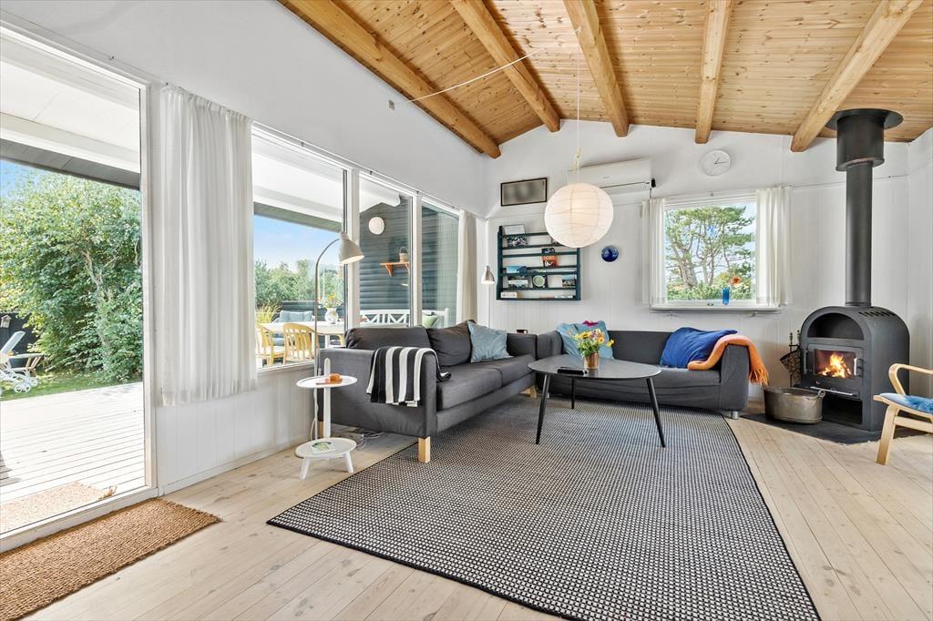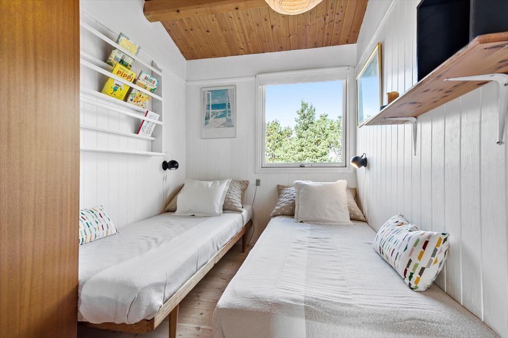 Huset har to soveværelser – et med dobbeltseng og et med 2 enkeltsenge samt et ekstra soveværelse i det hyggelige anneks, der er perfekt til gæster eller teenageren, der ønsker lidt privatliv. Den lyse stue er i åben forbindelse med køkkenet og spiseafdelingen, hvilket skaber et dejligt samlingspunkt for familien og overblik. Fra stuen er der adgang til en skøn udestue med sovesofa, hvor du kan slappe af og nyde udsigten, Åbner du en af terrassedørene, vil du sandsynligvis kunne høre bølgernes brugsen fra havet. Det er oplagt at starte feriedagene med en morgendukkert og hvorfor ikke også slutte af med én, når nu muligheden blot er 100 meter væk.