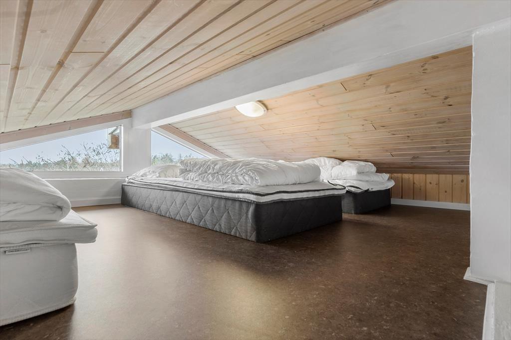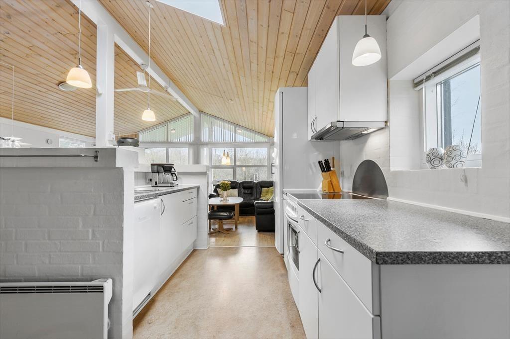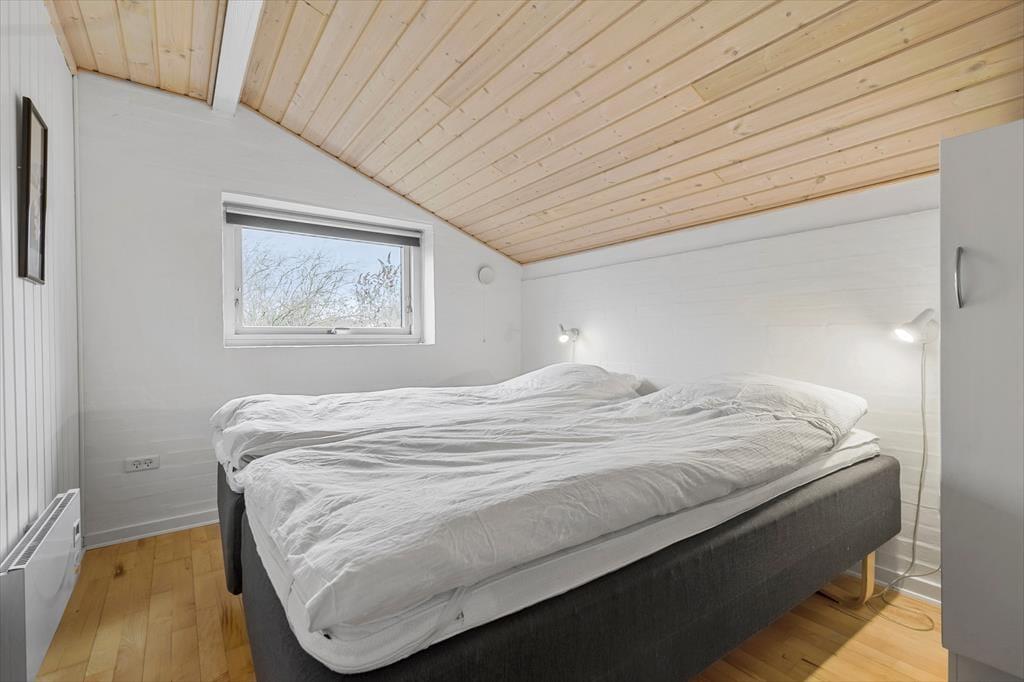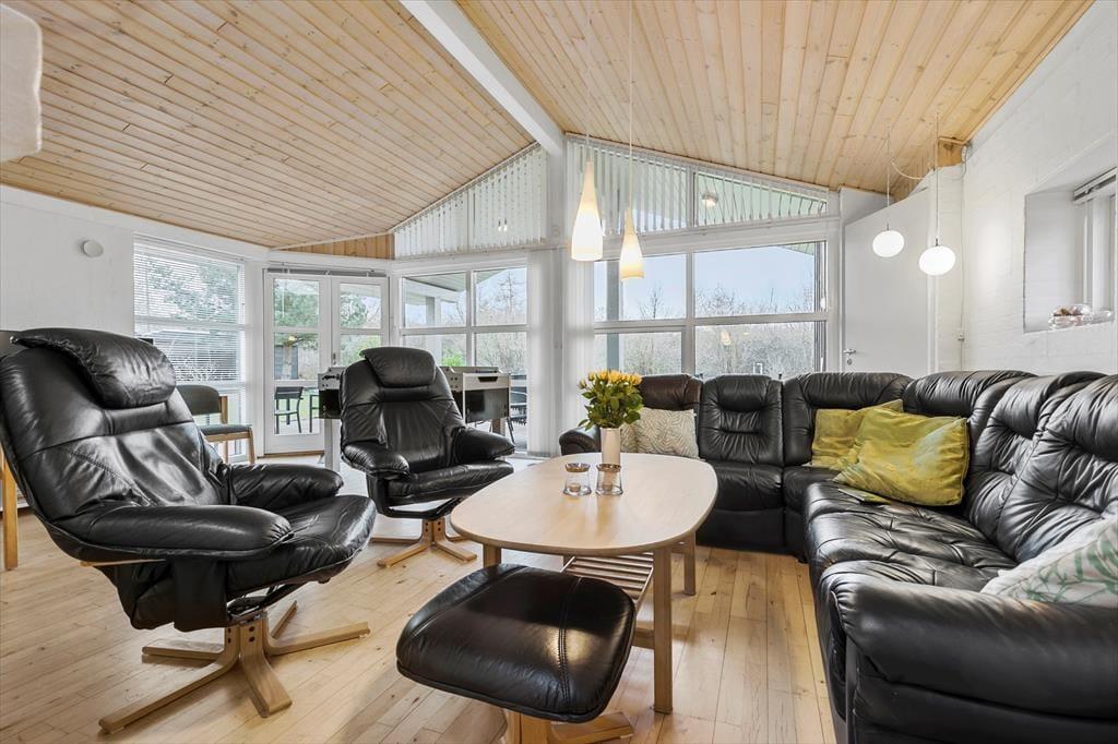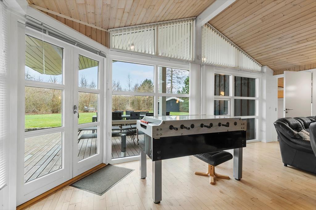 Et lyst og afslappende sommerhus, hvor der er højt til loftet og som er en god base for en ferie i nærværets tegn. Åbent køkken med halvmur til stue og spiseafdeling giver dig mulighed for at have hyggelige samtaler med familien, mens du laver lækker feriemad og nyder et godt glas vin. Du kan også følge med og heppe med dem som spiller bordfodbold i stuen. Når aftenen falder på, er det tid til en god bog eller et spil med børnene alt imens brændeovnen knitrer hyggeligt, Der er gitter til brændeovnen, så de små gæster ikke brænder sig. Fra stuen kan du gå direkte ud på den dejlige terrasse og til den dejlige have. 4 soveværelser - tre med dobbeltsenge og et med 2 enkeltsenge. De sidste sengepladser er på hemsen. 2 dejlige badeværelser - det ene med spa og sauna samt rum med vaskemaskine.