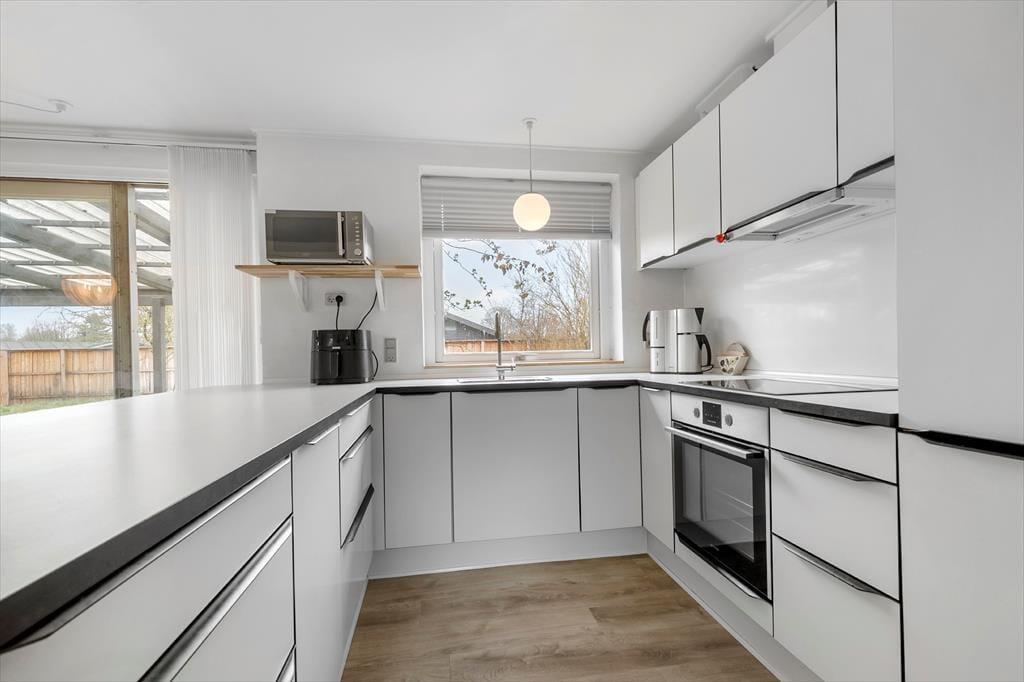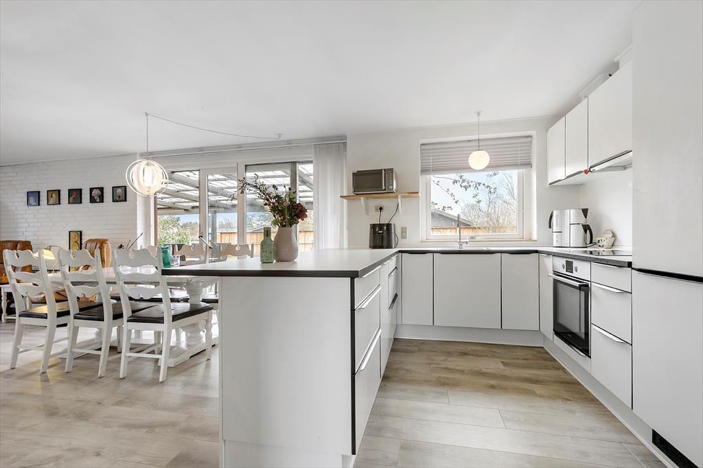 Velkommen til et charmerende murstenshus fra 70’erne, hvor fortidens varme hygge møder nutidens afslappede feriestemning. Her træder du ind i et lyst og åbent køkken, der flyder naturligt sammen med alrummet og den hyggelige stue – et perfekt samlingspunkt for gode samtaler og tid sammen. Brændeovnen knitrer blidt og fylder rummet med varme og den velkendte, hjemlige duft af brændt træ. Når du åbner døren ud til den overdækkede terrasse, mærker du den friske luft og ser på den hyggelige udepejs – et dejligt sted til lange og dugfrie aftener.