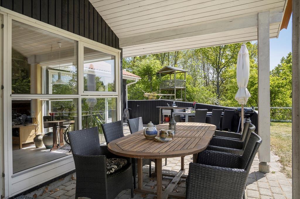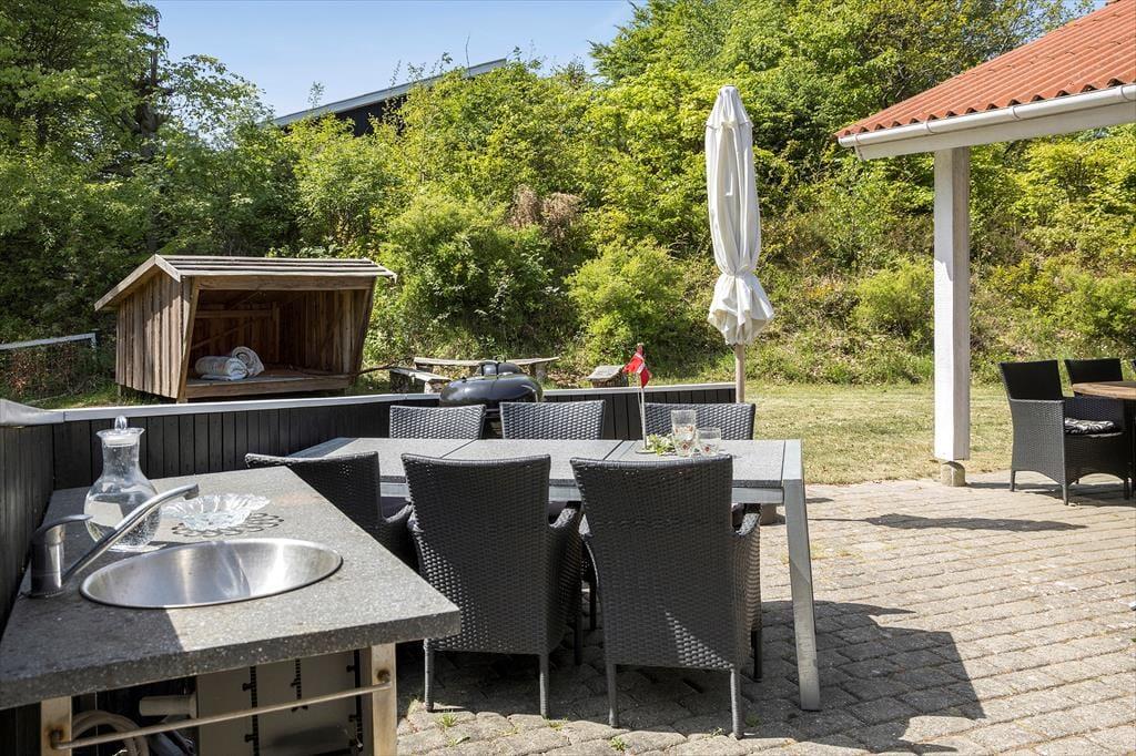 Terrassen er som skabt til lange sommerdage og hyggelige aftener, inddelt i små, charmerende hjørner: et hyggeligt kaffehjørne til dagens første kop i morgensolen, et solhjørne til afslapning med en god bog, et spisehjørne til de fælles måltider, og selvfølgelig et grillhjørne, hvor duften af grillmad sætter gang i feriestemningen. Her er endda en udendørs vask, som gør det ekstra nemt at klare madlavning under åben himmel.