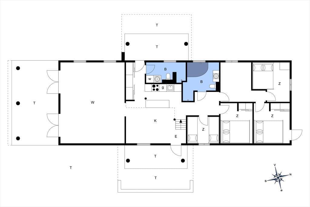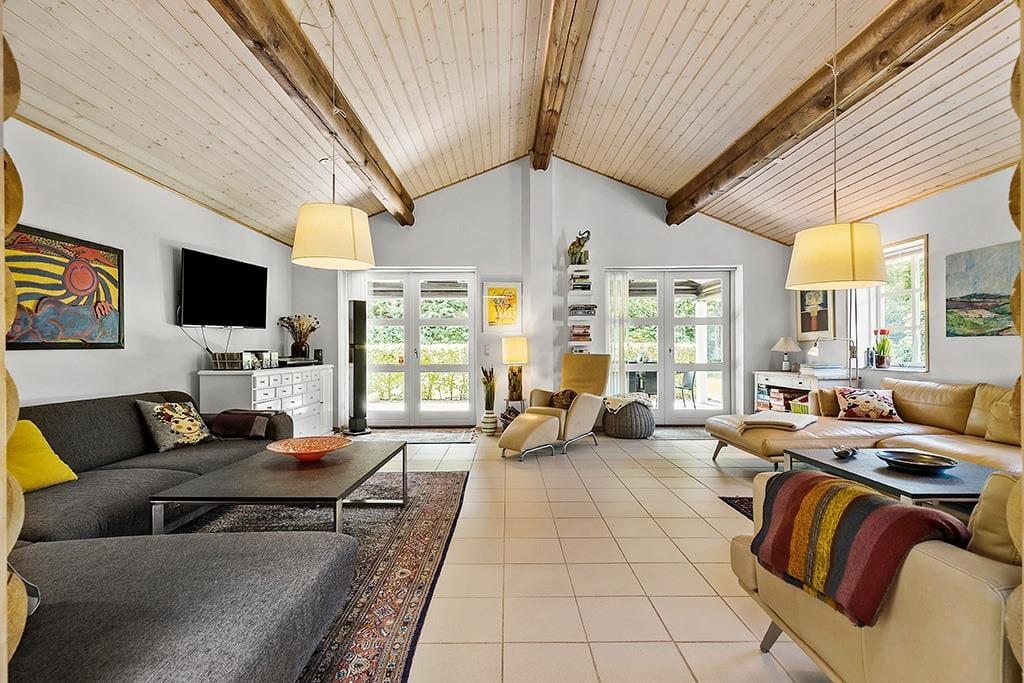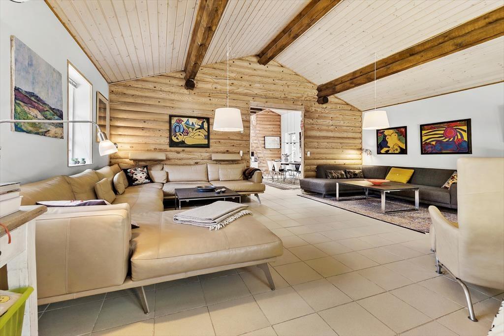 Midt i huset ligger det flotte og funktionelle køkken – perfekt til lange feriemorgener med duften af kaffe og nybagt brød. Ovenover køkkenet gemmer der sig en stor og sjov legehems, som børnene vil elske at indtage som deres helt eget ferieunivers. I den kæmpestore opholdsstue indbyder bløde sofaer til ren afslapning – måske med en god bog, et brætspil eller bare udsigten til naturen udenfor. Herfra er der direkte udgang til en stor, overdækket terrasse, hvor både morgenkaffe og aftenhygge kan nydes i tørvejr. Med to badeværelser – det ene med spa – fire indbydende soveværelser og et aktivitetsrum med bordfodbold, er der masser af plads til både samvær og privatliv.