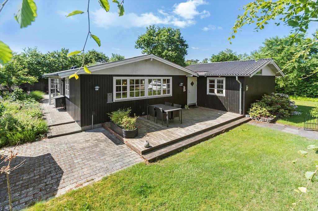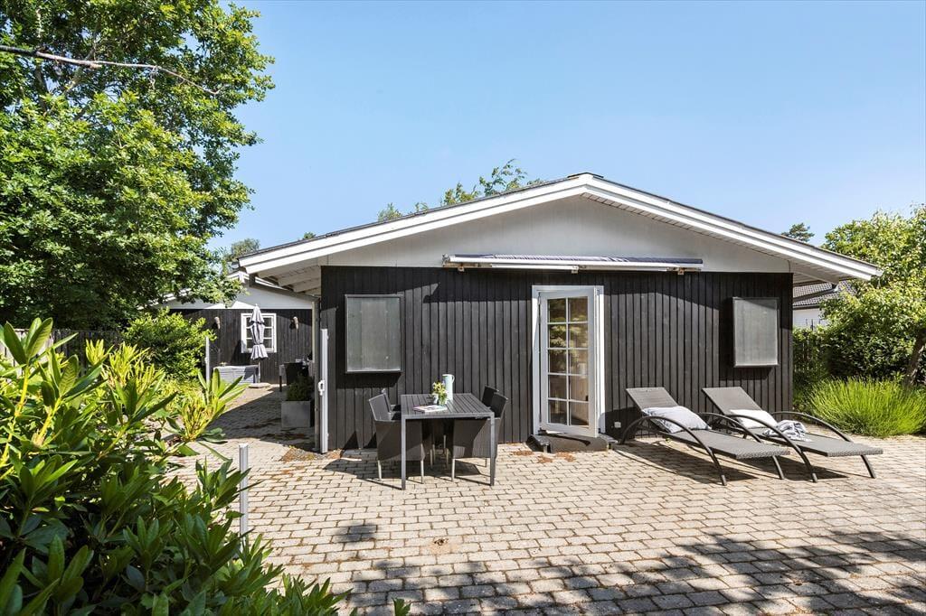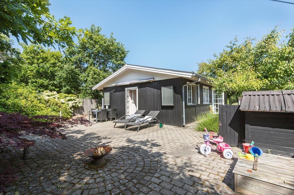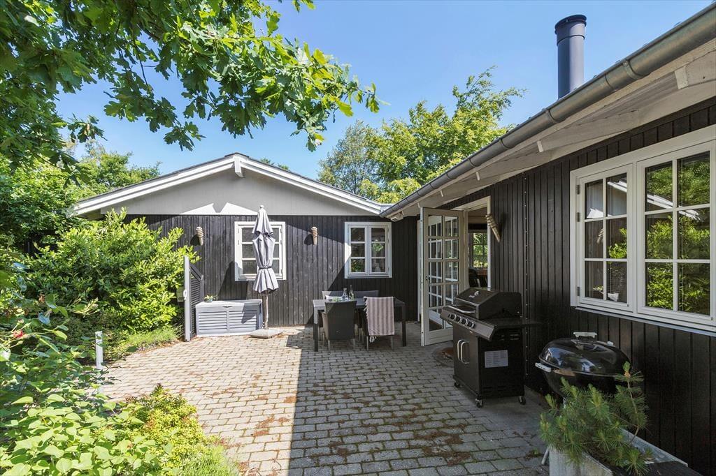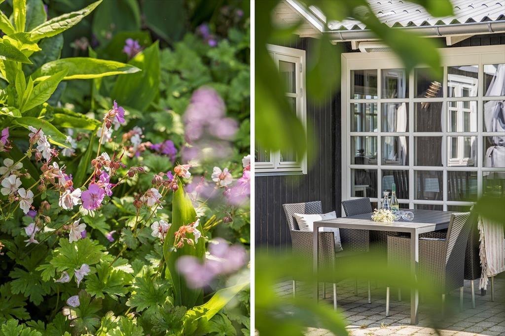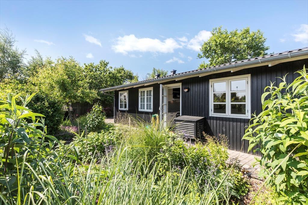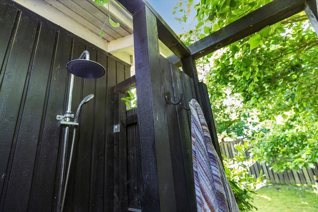 Udenfor er grunden som en lille oase. Her er læ for vinden, små kroge til både leg og ro, og en skøn, sammenhængende fliseterrasse der inviterer til grill, vin i solnedgangen og snakke, der trækker ud. Den lille græsplæne indbyder til bare tæer og eftermiddagshvil i skyggen af træerne. Her er blomster, et smukt, japansk træ, et legehus venter på små gæster – og en udebruser til sandede fødder og sommervarme skuldre efter en dejlig dag ved stranden.