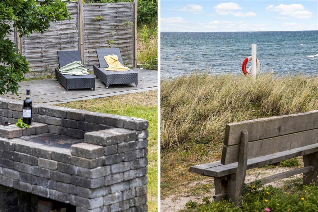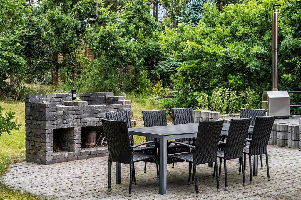 Udendørs venter en skøn have med alt, hvad der hører en rigtig ferie til. I kan slappe af på de dejlige fliseterrasser, grille lækker sommermad ved den murede grill eller nyde et varmt dyp i vildmarksbadet – under stjernerne. Børnene kan lege frit på græsplænen, hoppe løs på trampolinen eller bygge sandslotte i sandkassen, mens der tændes op i bålstedet til snobrød.