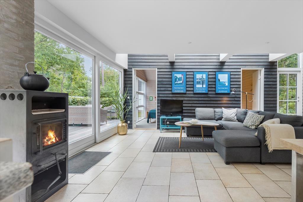 Glæd dig til at træde ind i et helt særligt og arkitekttegnet sommerhus, hvor lys, farver og charme går hånd i hånd. Her er det rart at være – også når I er mange – og planløsningen inviterer til samvær og ro. Det store opholdsrum i husets hjerte er fyldt med lys fra de brede vinduespartier, som smukt trækker naturen med helt ind i stuen. Her finder du både stue, spiseplads og et lækkert, veludstyret køkken – alt sammen stilfuldt indrettet med fokus på hygge og fællesskab. Kække detaljer som den sorte, rustikke trævæg og de flotte, klare farver giver personlighed og kant. På hver side af opholdsrummet finder du to gode soveværelser – ét med dobbeltseng og ét med to enkeltsenge – altså i alt 4 soveværelser. Badeværelset har både spa og sauna, og der er desuden et ekstra gæstetoilet samt et praktisk bryggers til strandtasker og våde håndklæder.