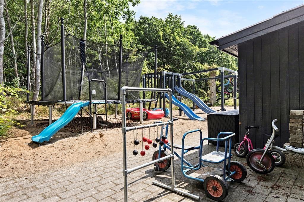 Og så er der legeområdet – et sandt paradis for børnene! Her venter en stor basket gård, trampolin, gynger, rutsjebaner, klatrestativ, legetårn og masser af legetøj. Det hele ligger på blødt sand, som indbyder til timevis af leg og frihed. Små cykler og legebiler står klar til fart over feltet – og du kan roligt nyde kaffen i nærheden, mens legen udfolder sig.