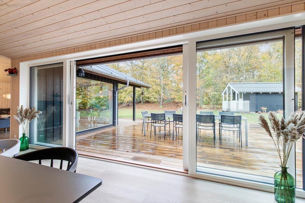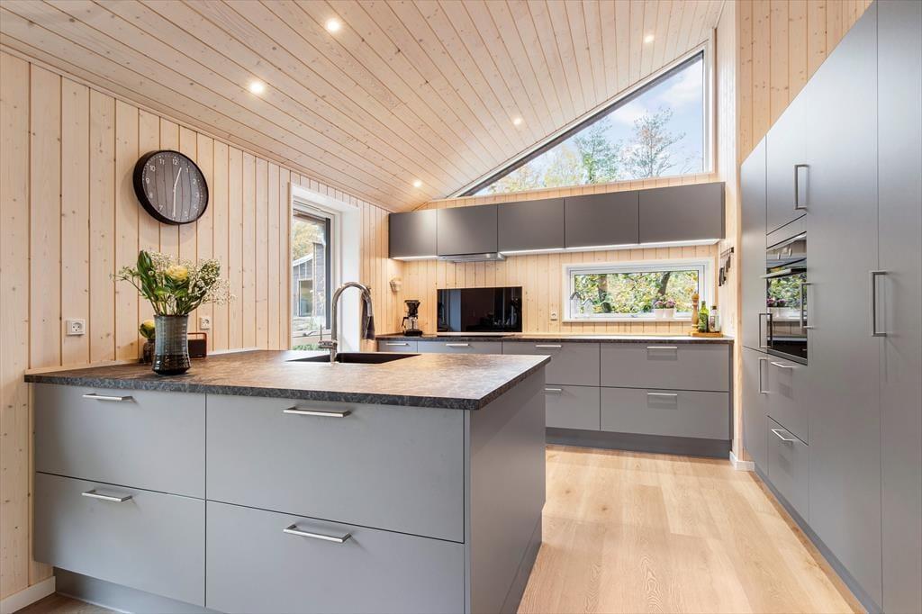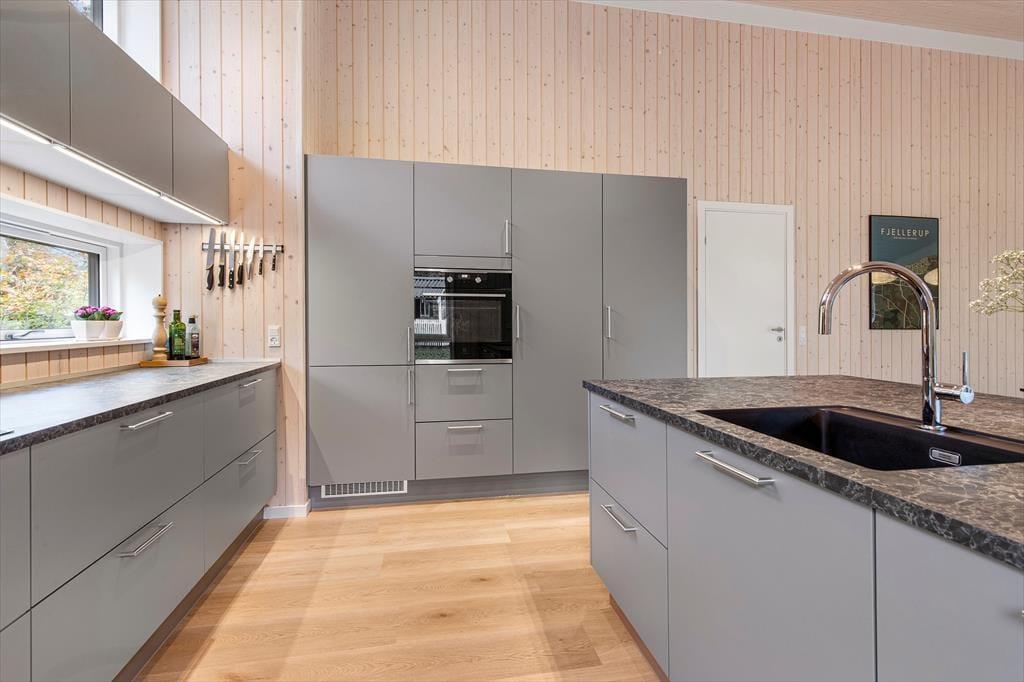 Når I træder ind i det nye og rummelige sommerhus, mødes I af en behagelig atmosfære, hvor kvalitet og komfort er højt prioriteret. Det flotte, veludstyrede køkken samler familien omkring madlavningen, mens snakken flyder og duften af god mad breder sig. Køkkenet ligger i åben forbindelse med indbydende spisestue, hvor lyset strømmer ind gennem de dobbelte glasskydedøre. Herfra går I direkte ud på den store træterrasse, hvor I kan nyde frisk luft og leg på græsplænen, måltider og hyggestunder – også på de dage, hvor den overdækkede del giver læ.