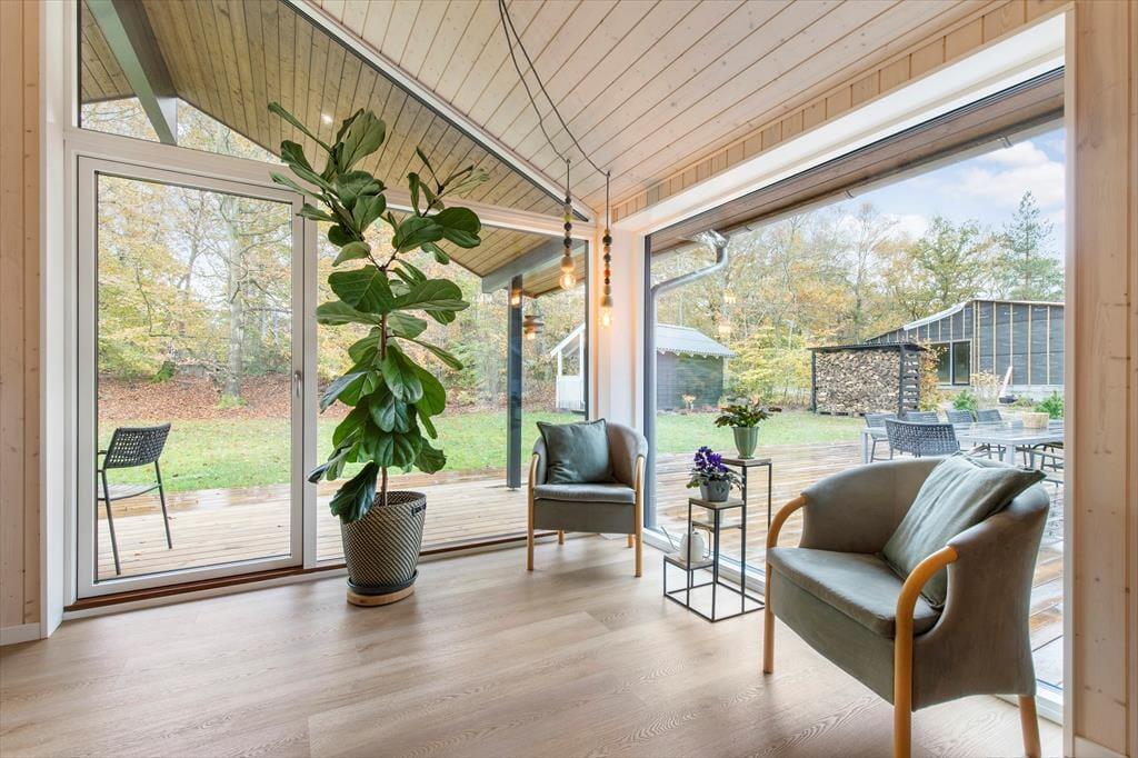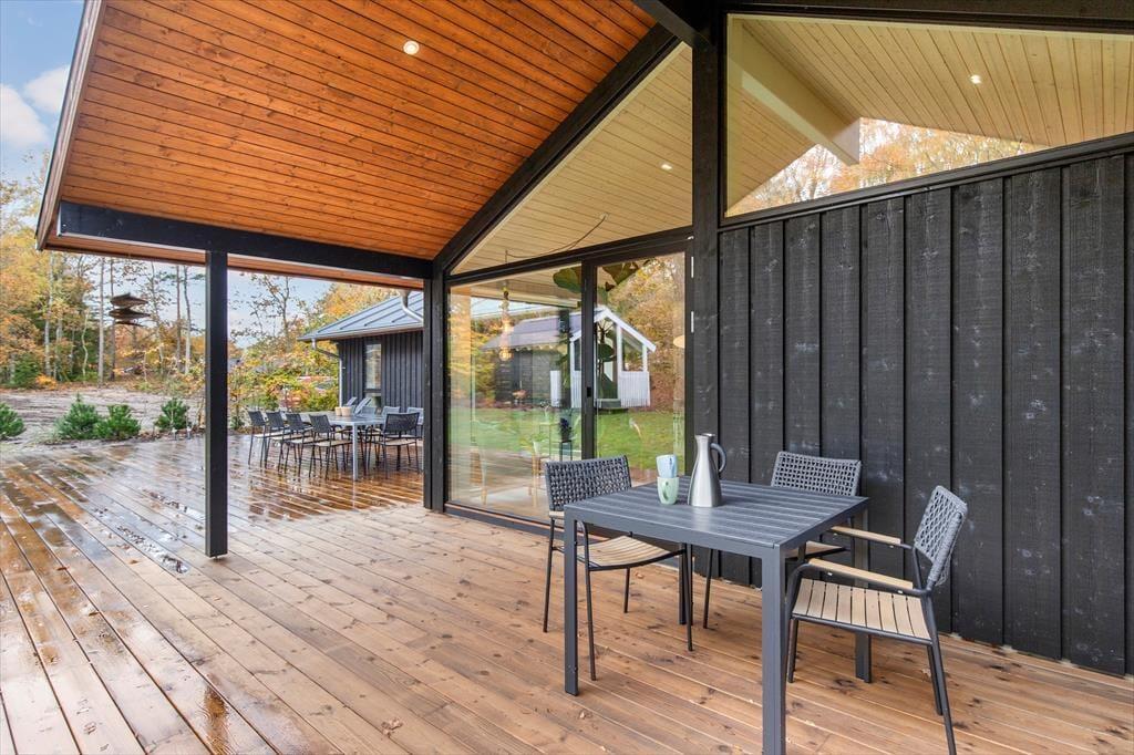 Hjemme igen kan I nyde udelivet på den store træterrasse på hele 116 kvm. Her er masser af plads til både fælles måltider, solbadning og hyggestunder. Den delvist overdækkede del og solsejlet giver mulighed for at være ude i al slags vejr, mens hængekøjen inviterer til ro og en god bog i træernes skygge.