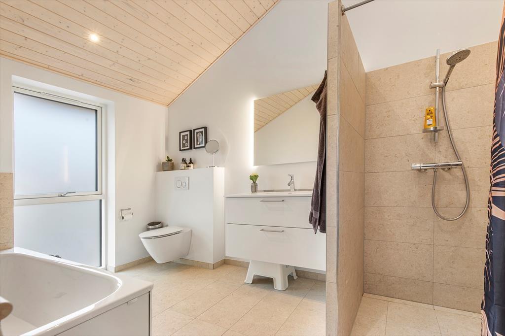 Med to flotte badeværelser glider morgen- og aftenrutinerne let. Det ene har badekar, perfekt til afslapning eller børneleg. I entréen er der både garderobe og vaskesøjle, så I nemt kan holde styr på tøj og overtøj året rundt.