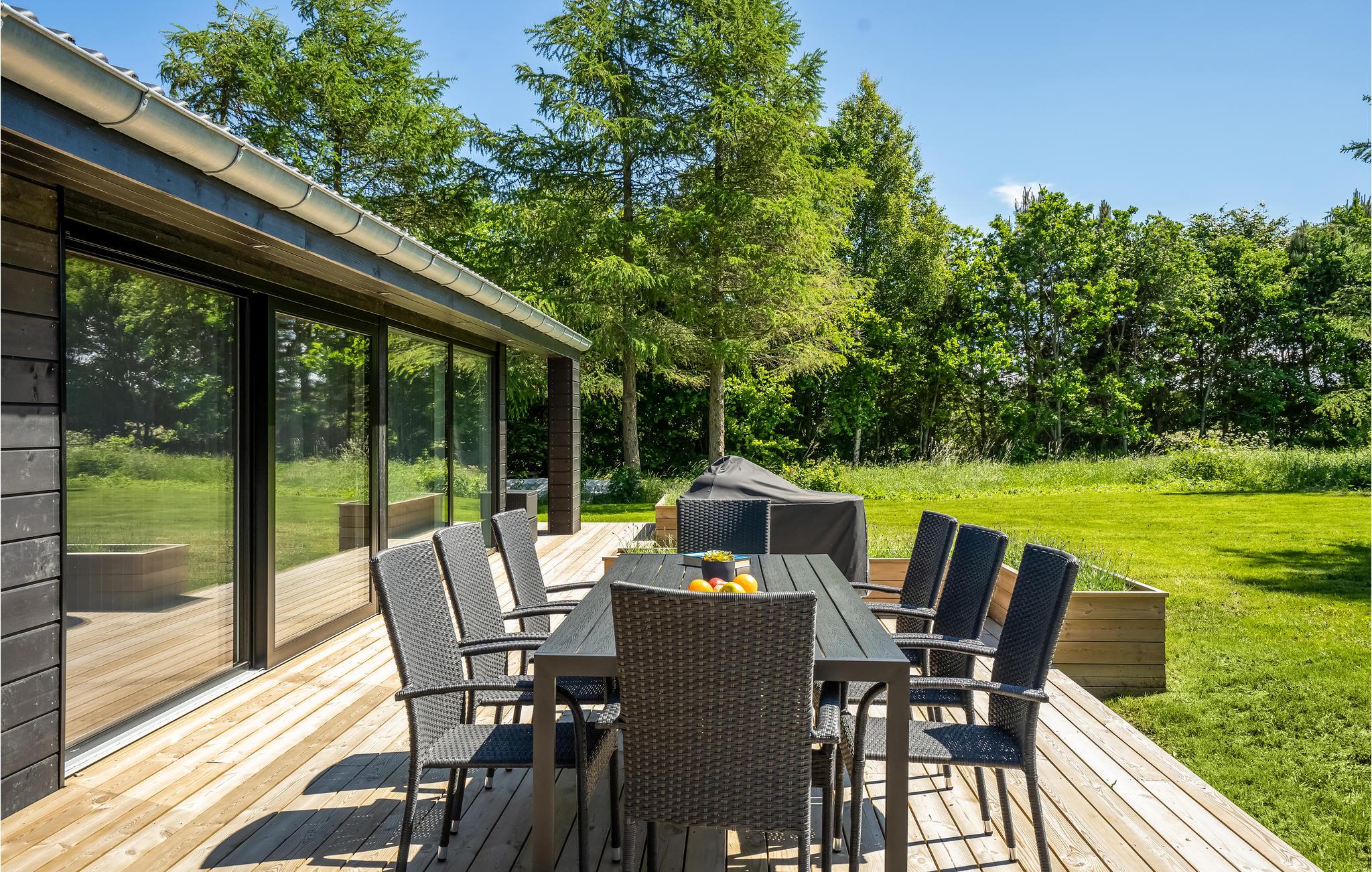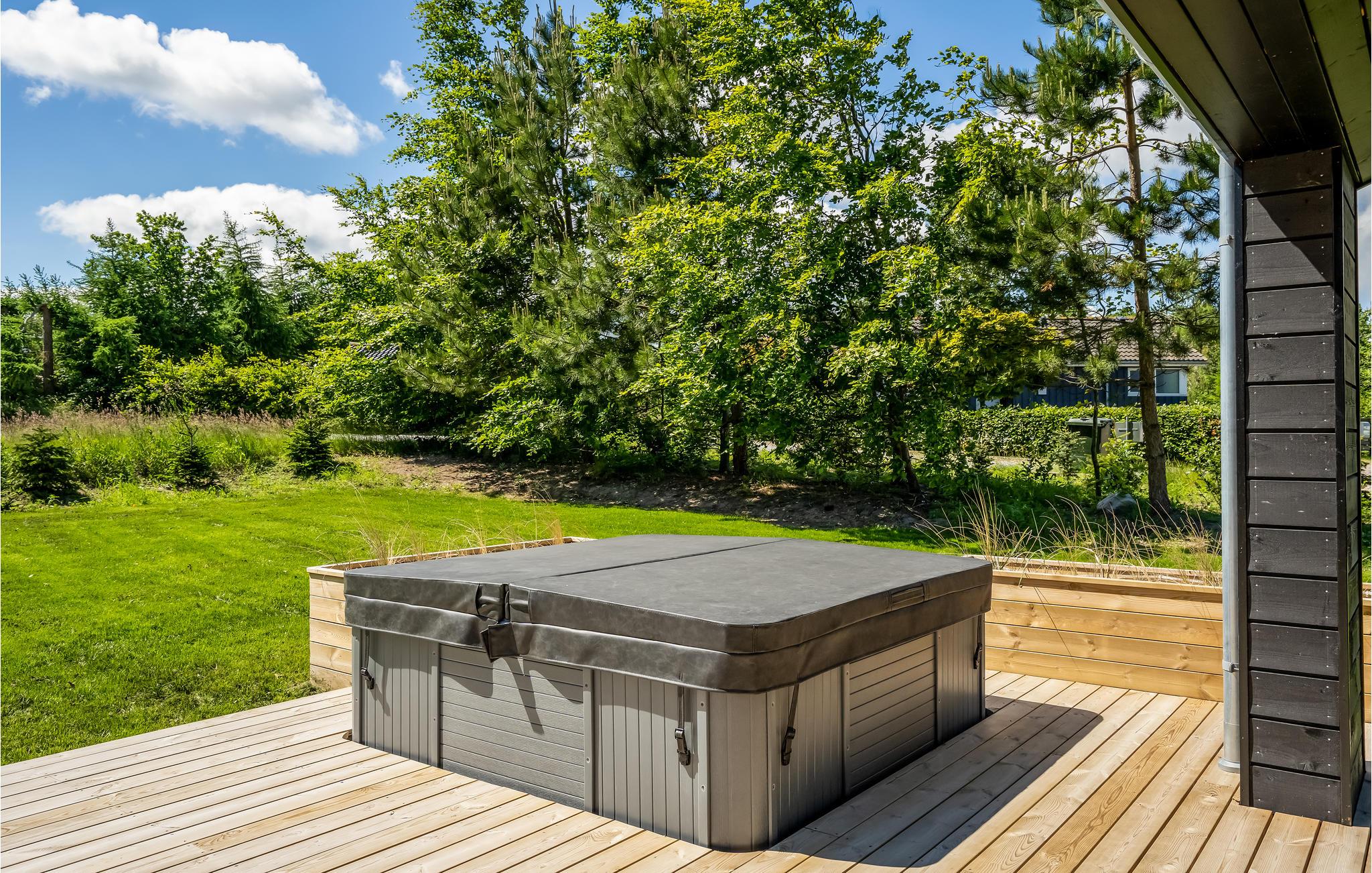 Til huset hører en kæmpestor træterrasse, hvor I kan nyde solen og ferien i fulde drag. Her finder I også et udendørs spabad - det perfekte sted at nyde en drink om aftenen. Huset ligger på en stor naturgrund, hvor jeres børn kan lege og boltre sig.