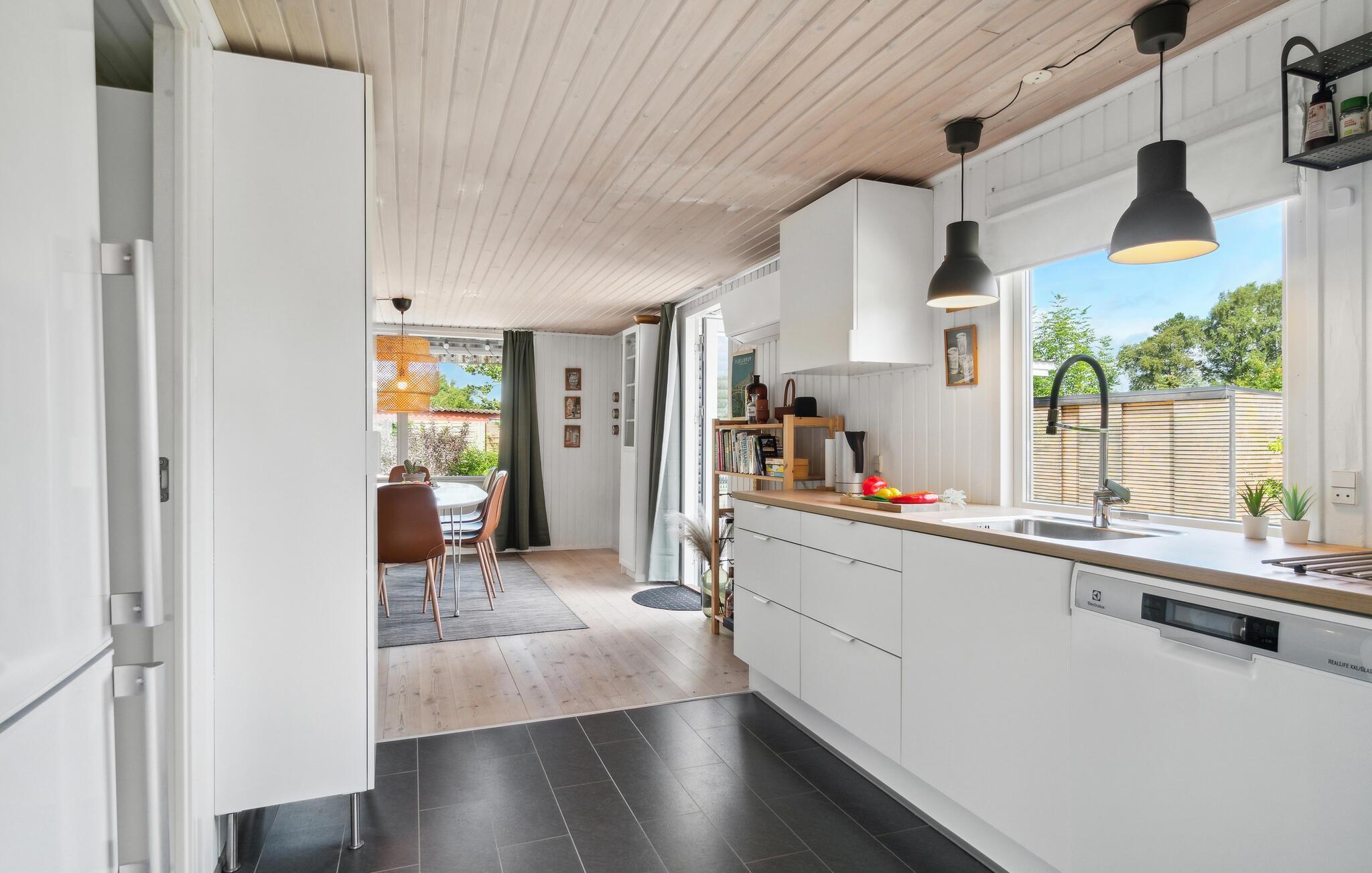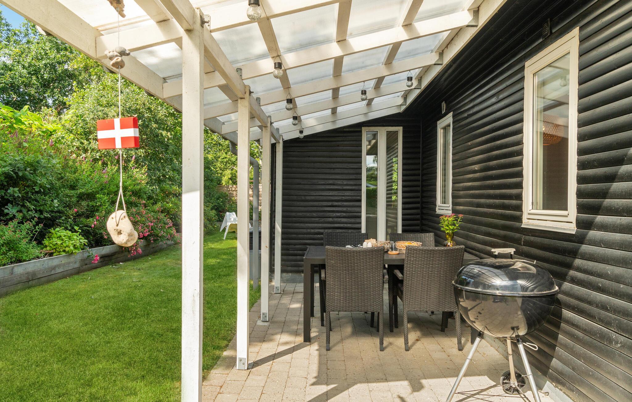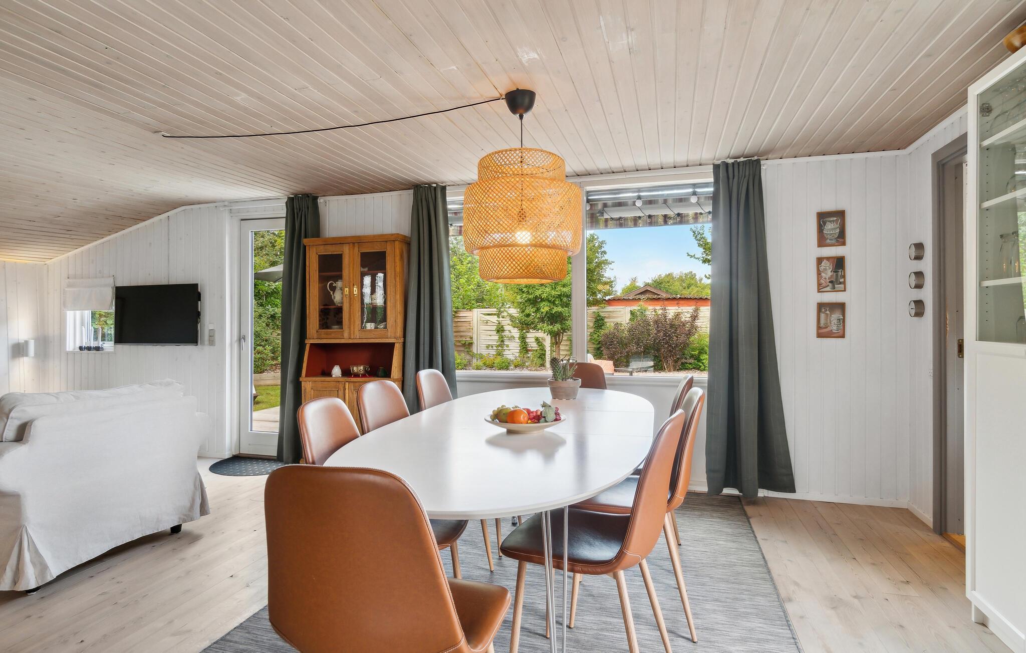 Velkommen til dette flotte feriehus, der danner om en fantastisk ferie tæt på smuk natur og den skønne strand. Indretningen fremstår lys, komfortabel og hyggelig med de tydelige træpaneler i varme farver, og hele huset emmer simpelthen af hygge. Køkkenet er veludstyret, så amatørkokkene kan folde sig ud og tage sig god tid til at sammensætte familiens livretter. Måltiderne kan nydes ved spisebordet eller på en af husets tre terrasser. Når aftendugegen lægger sig, kan I finde et tørt og lækkert spot i drivhuset med et godt glas vin, efter I har puttet børnene i hovedhuset og annekset.