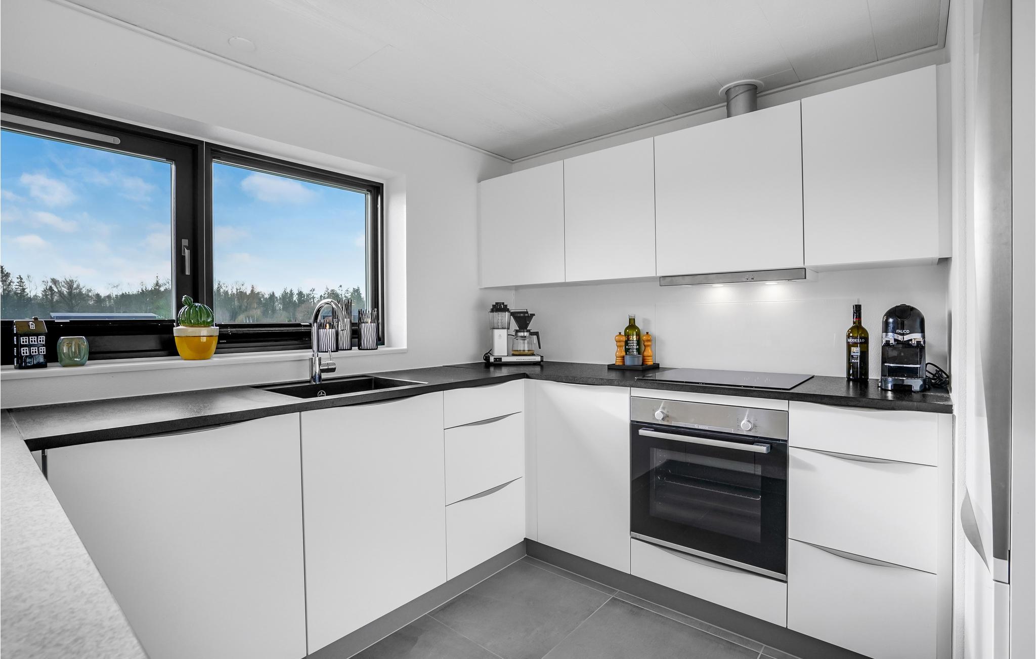 Der venter jer nogle fantastiske feriedage i dette indbydende hus, som ligger i gåafstand fra kysten på Djurslands nordside. Her kan I tilbringe nogle herlige dage i det østjyske og køre et fuldt program - godt afbrudt af pauser i denne flotte oase. De store gulv til loft-vinduer giver jer frit udsyn til de grønne omgivelser, og interiøret er holdt i lyse, rolige farver, så her kan man ikke undgå, at pulsen falder, og skuldrene sænkes.