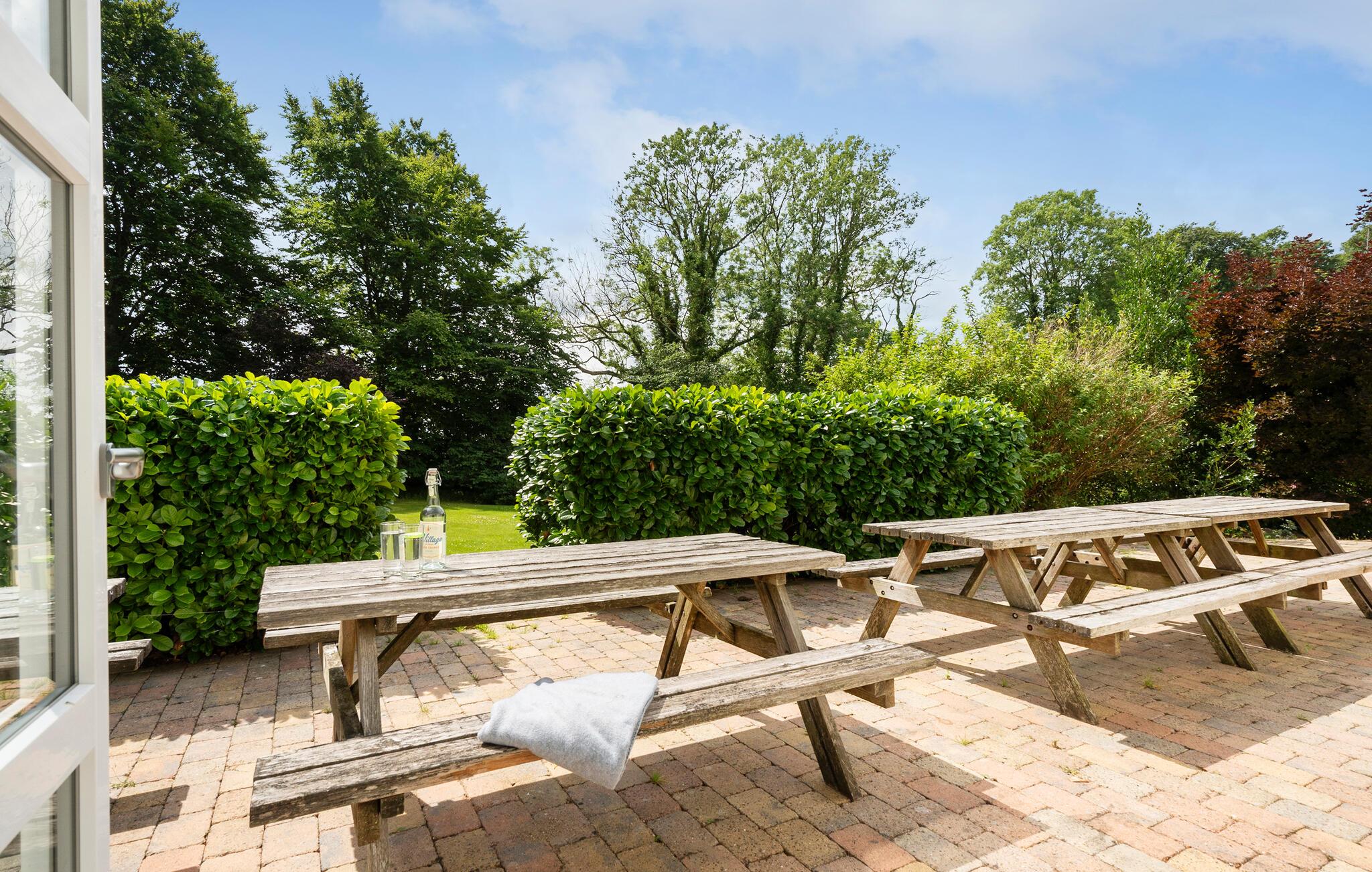 Tilbring solrige timer i det rummelige udendørsområde. Brug terrassen med træbænke til fælles morgenmad eller nyd hyggelige aftener i det overdækkede område. Den rummelige græsplæne med fodboldmål lægger op til at spille spil og deltage i sportsaktiviteter.