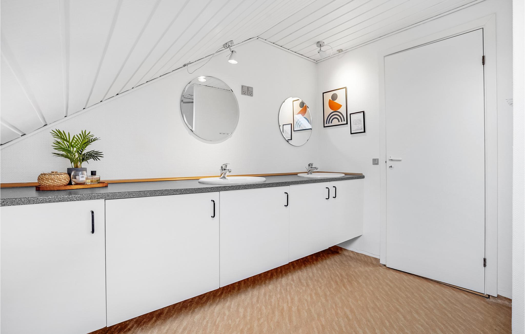 Ikke langt fra den gode strand ved Fjellerup ligger dette meget rummelige swimmingpoolhus. Huset byder på seks soverum og to badeværelser, helt ideelt til to familier, der gerne vil holde ferie sammen. I poolafdelingen har I adgang til swimmingpool med modstrømsanlæg, spabad samt sauna, her ligger også husets ene badeværelse. På den store terrasse kan I sidde og nyde en kop kaffe, mens I venter på, at grillen bliver klar til aftensmaden. Den store naturgrund er god til boldspil og leg. I nærheden har I muligheder for at spille minigolf, tennis og golf. Kør evt. en tur til Djurs Sommerland.
