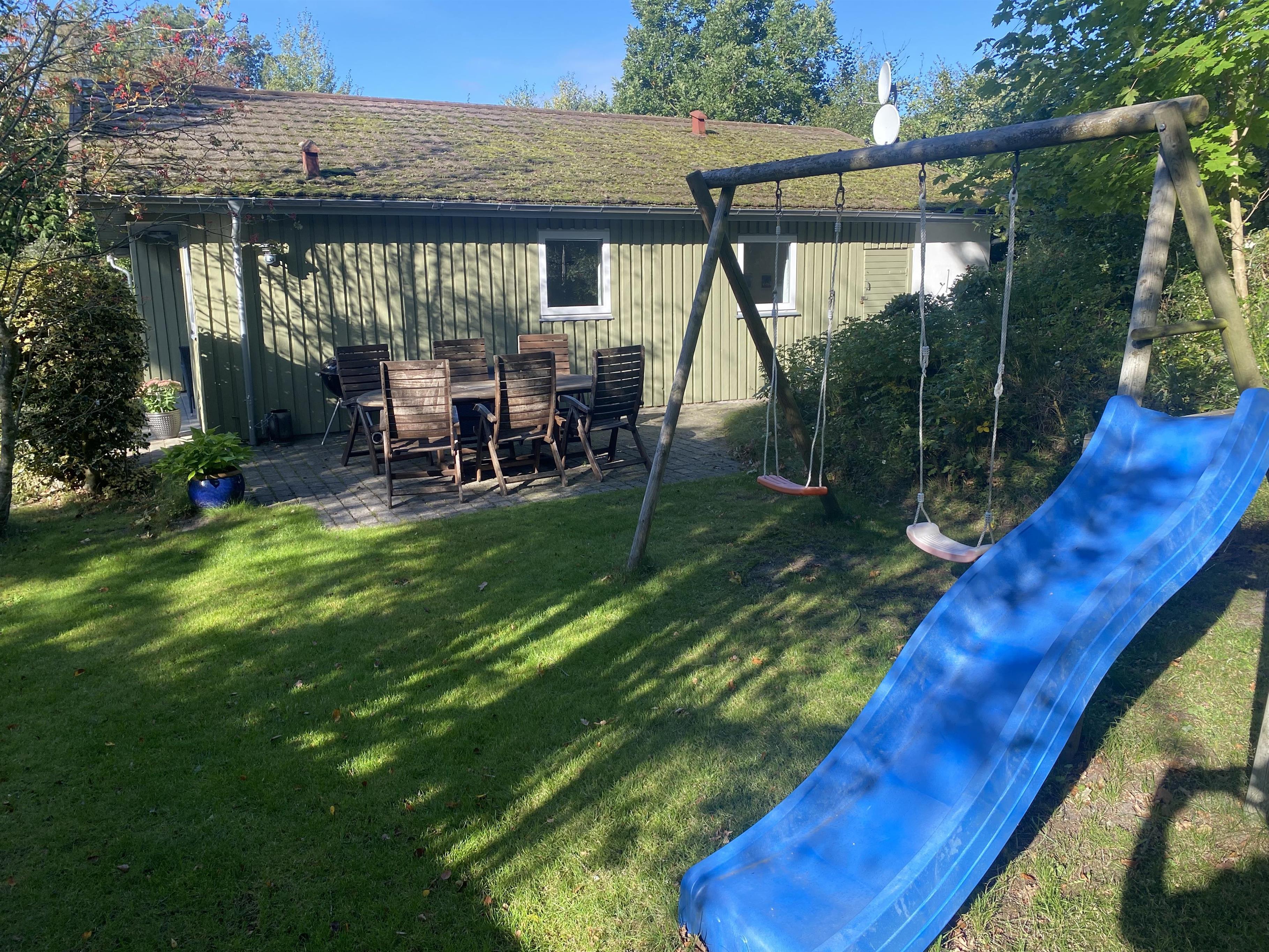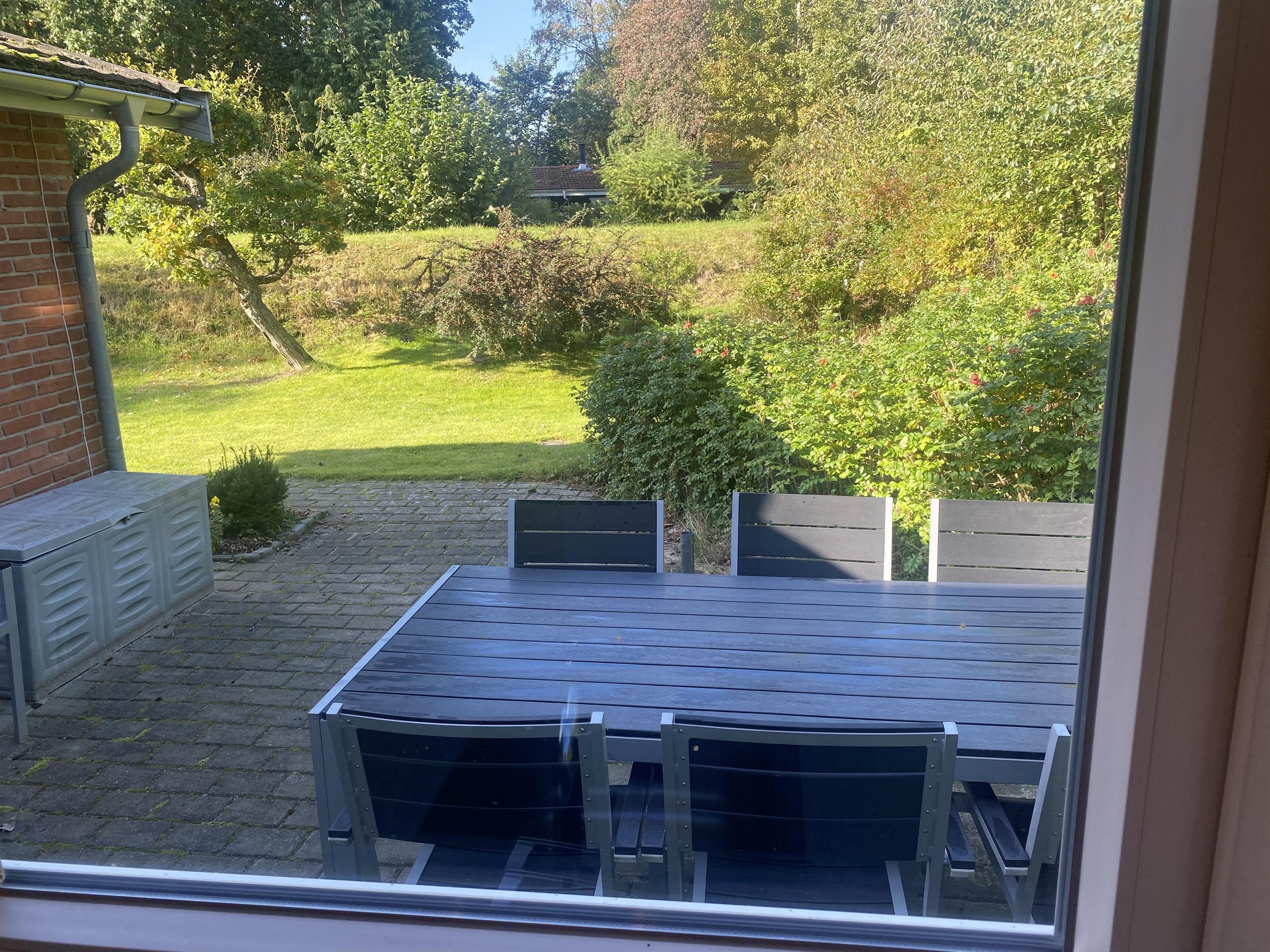 I haven står der et kæmpestort og smukt egetræ. Der er en skøn, stor åben terrasse med havemøbler, kulgrill, to liggestole og to sol-vogne. Der er også en overdækket terrasse, hvor man kan sidde og nyde den velholdte have, selv om solen måske ikke står højt på himlen.