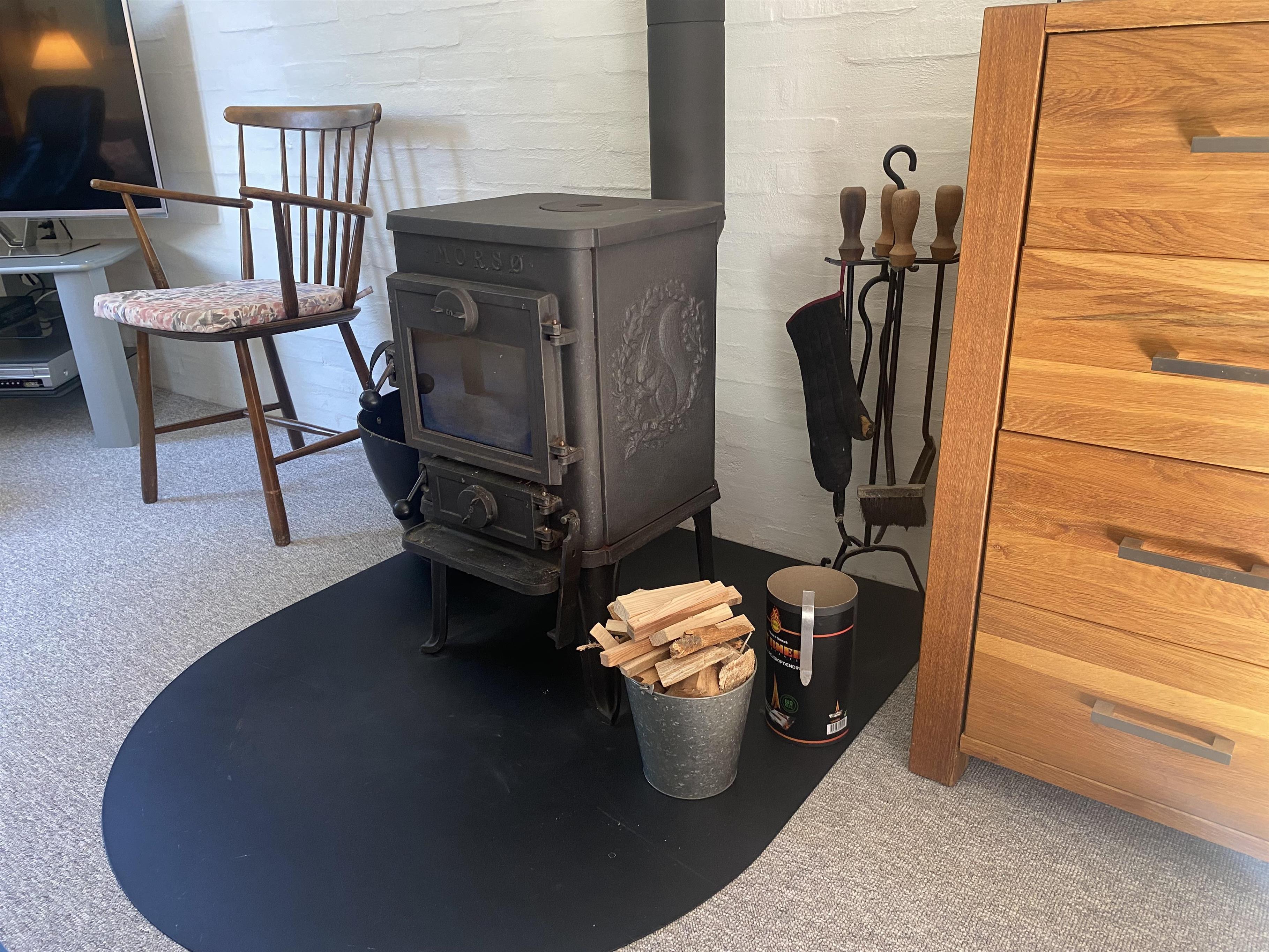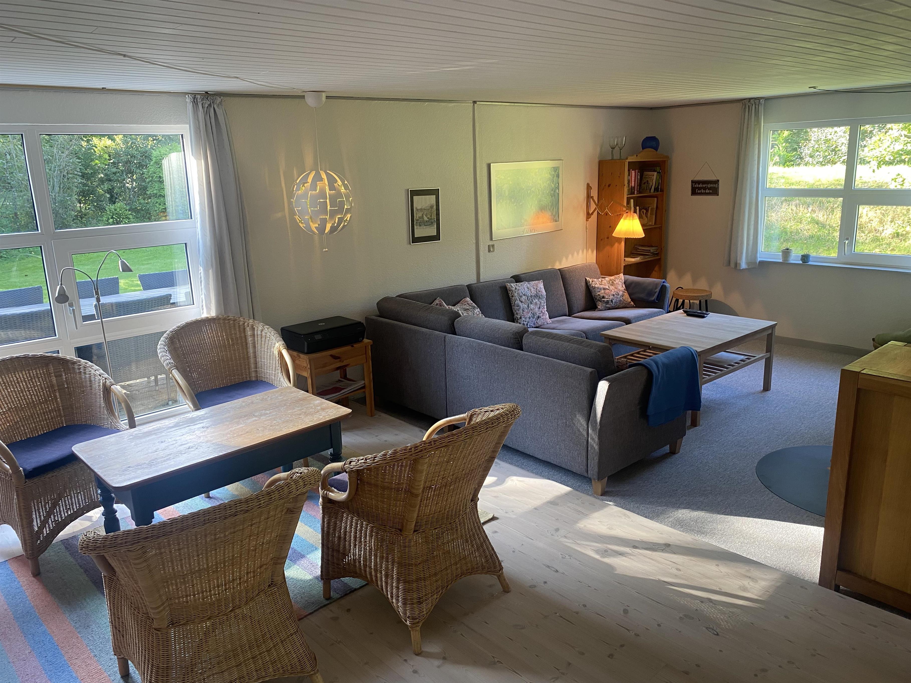 Huset har et dejligt køkken med opvaskemaskine i åben forbindelse med en praktisk spiseplads og med stuen, der er indrettet med en stor hjørnesofa, som familien kan hygge sig i foran fjernsynet. Skal der spilles brætspil, er der også et ”spillebord” med kurvestole omkring. Så kan familien være sammen, også selv om de laver forskellige aktiviteter. Der er brændeovn og også varmepumpe.