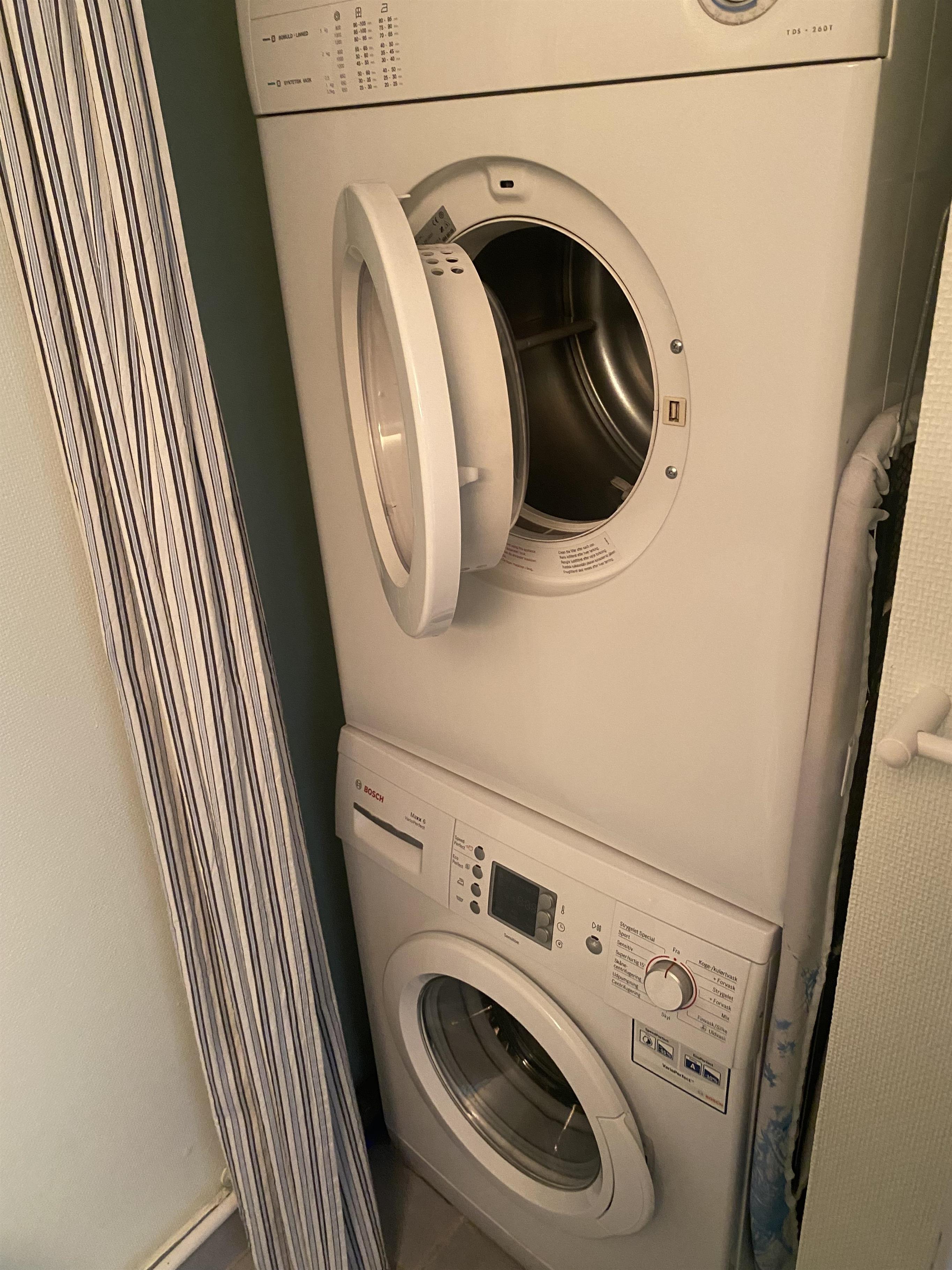 Der er et badeværelse med skabsmiljø, brusebad og toilet samt et ekstra toilet med håndvask. Her er også vaskemaskine og tørretumbler.