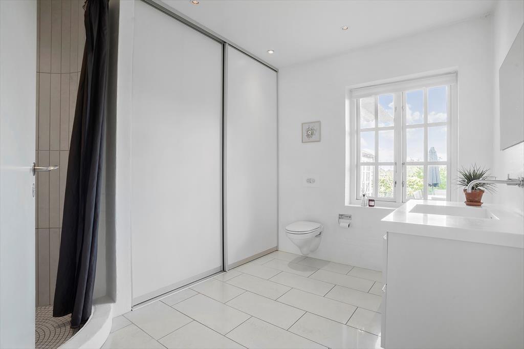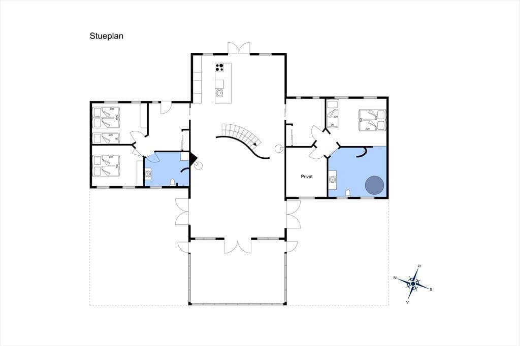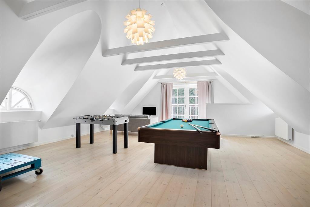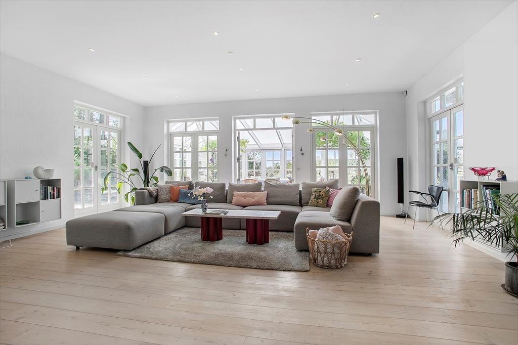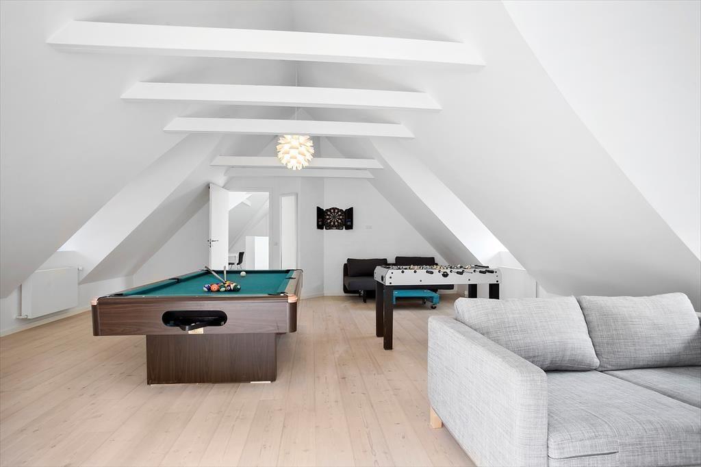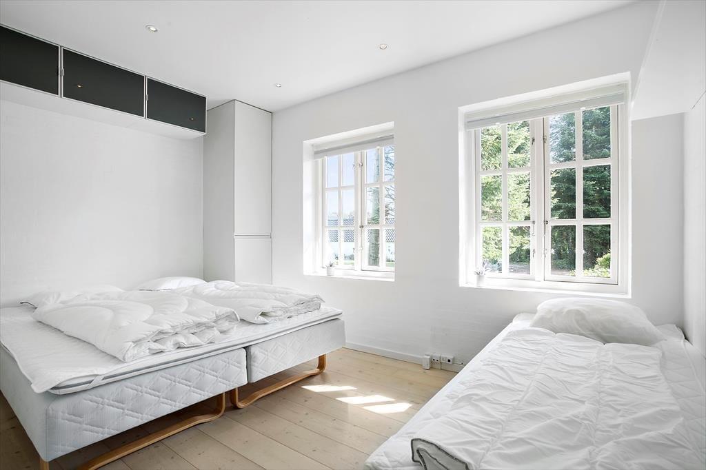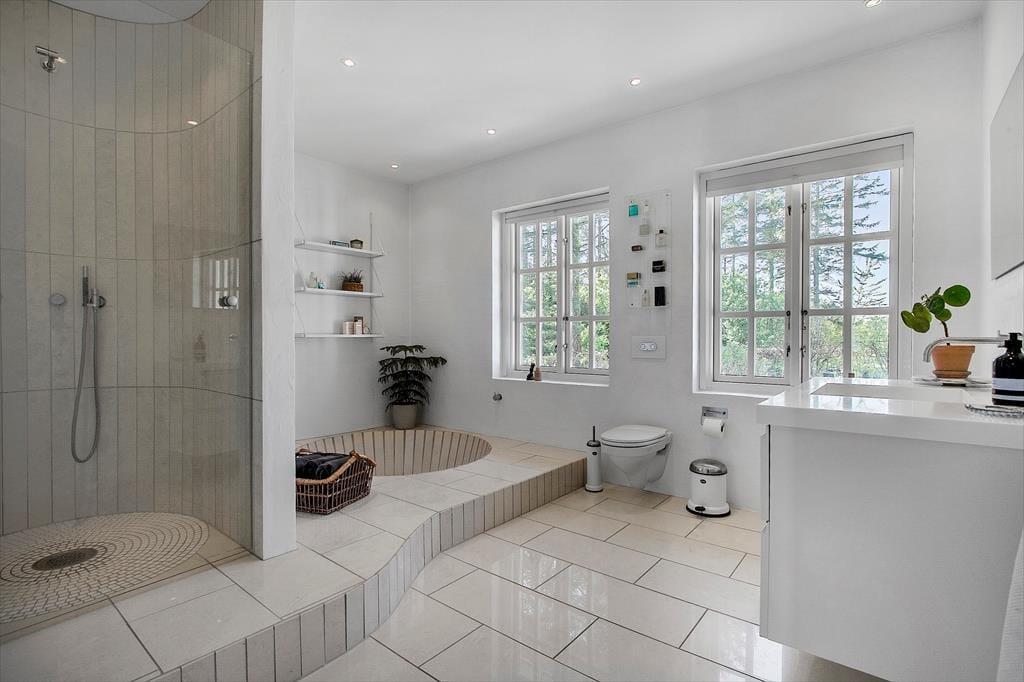 Sommerhusets stråtag og hvide facade vækker minder om klassiske landejendomme. Der er dog tale om et nyere byggeri fra 2007, og inden døre har I hele 350 m2 til rådighed fordelt på stueetagen og førstesalen. Atmosfæren er lys og luftig, og som billederne afslører, er rummene indrettet på udsøgt vis med materialer og møblement af højeste klasse. Fem værelser er fordelt i tre soveafsnit – to i stueplan og et på førstesalen. Soveafsnittene har hver sit badeværelse, hvoraf det ene har et elegant nedsænket badekar. Som supplement til soveværelserne står der en dobbelt sovesofa i aktivitetsrummet, som derudover er udstyret med poolbord, elektronisk dart og bordfodbold. Når I ikke dyster om at blive feriens champion, har I to flotte stuer og et højloftet køkken-alrum at samles i – foruden en vestvendt udestue, der inviterer til idylliske middage og hyggestunder under den klatrende vin.