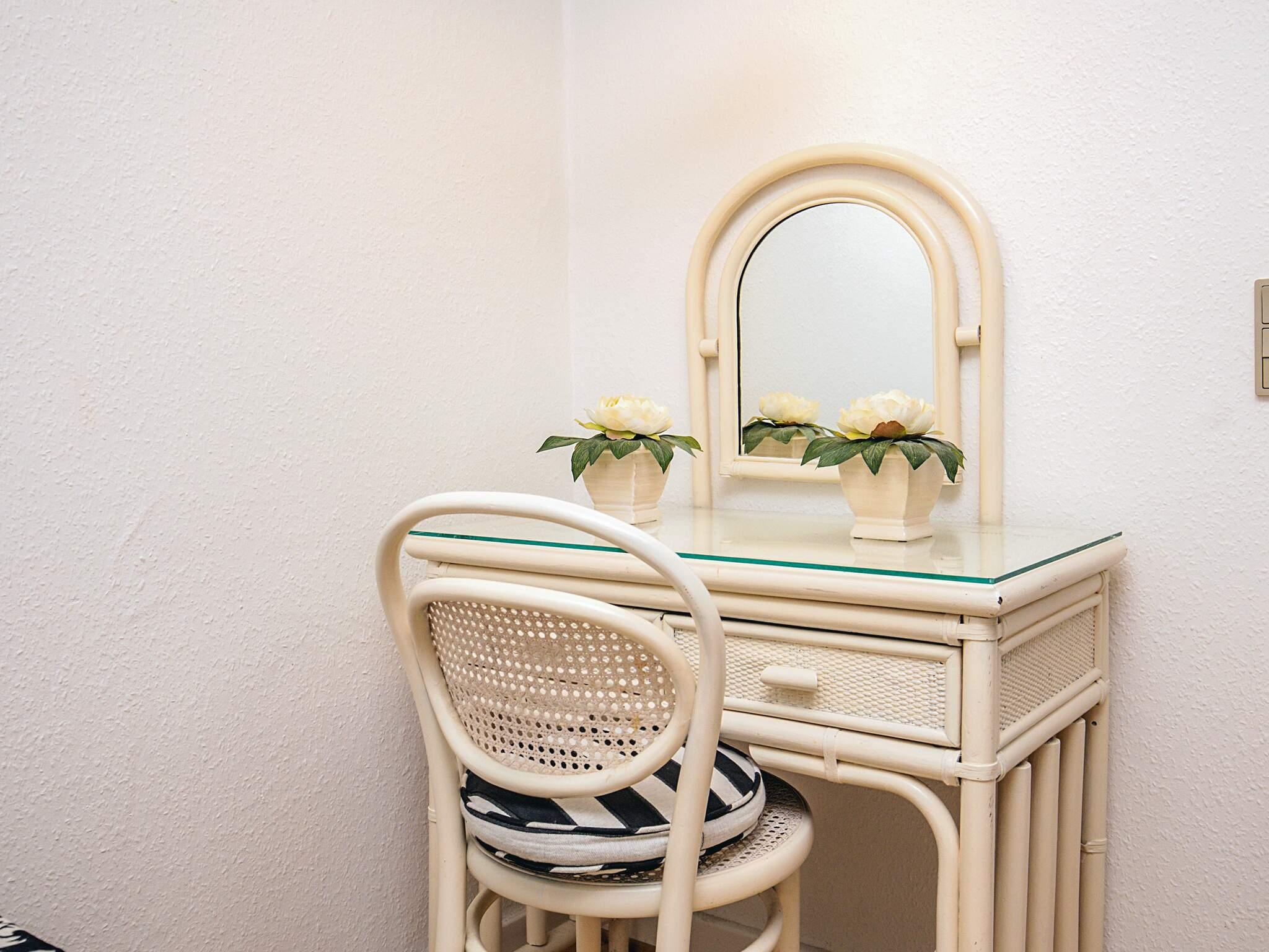 Lejligheden har egen terrasse, hvor du kan nyde morgensolen, slappe af med en god bog eller blot lade blikket glide ud over det grønne område. Atmosfæren er afslappet, stilfuld og ideel til både par, små familier og solo-rejsende, der ønsker at komme helt ned i gear.