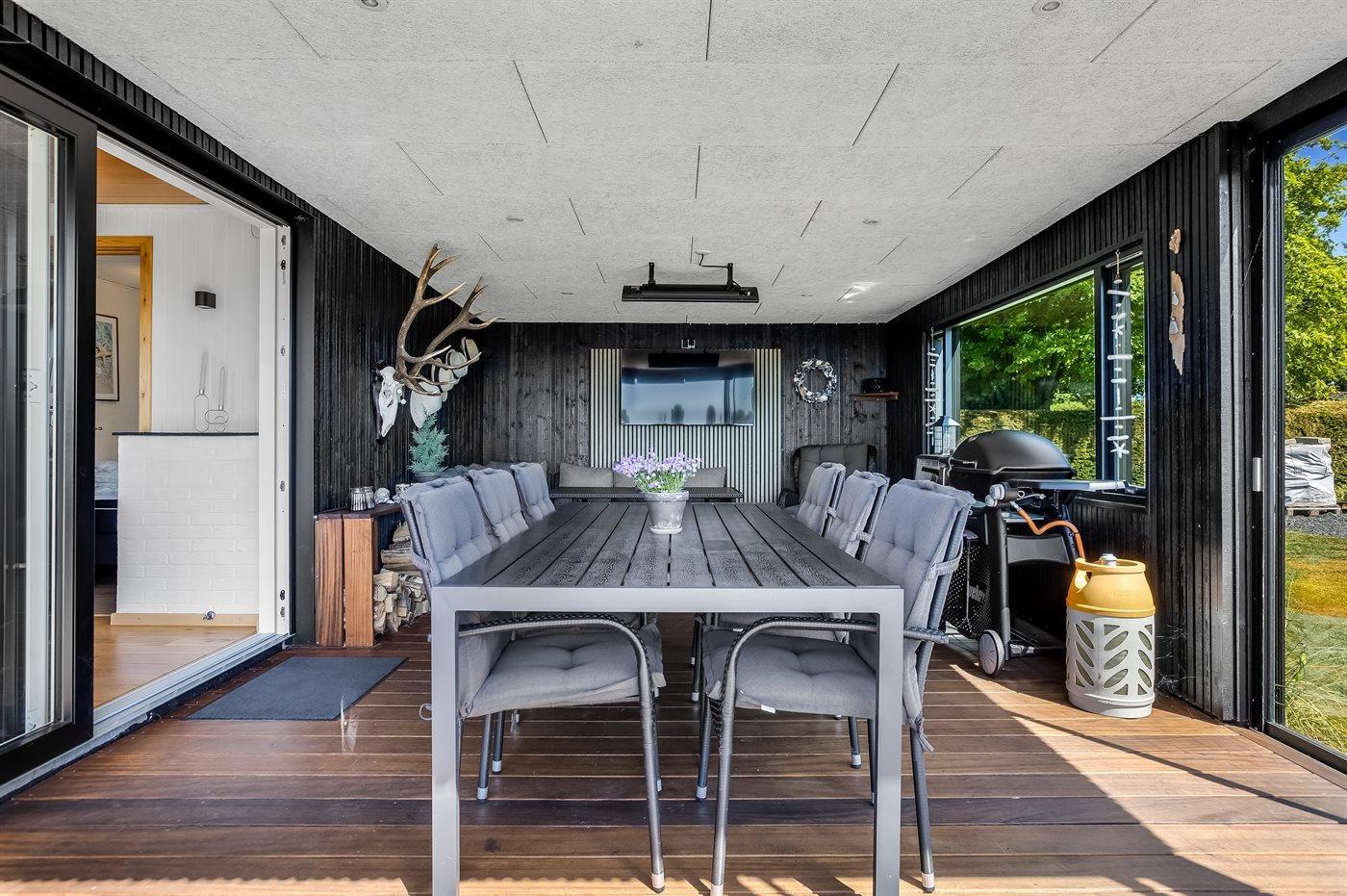 Køkkenet er udstyret med 1 køleskab. Der er 4 keramiske kogeplader, varmluftovn, mikrobølgeovn, Airfryer samt opvaskemaskine.