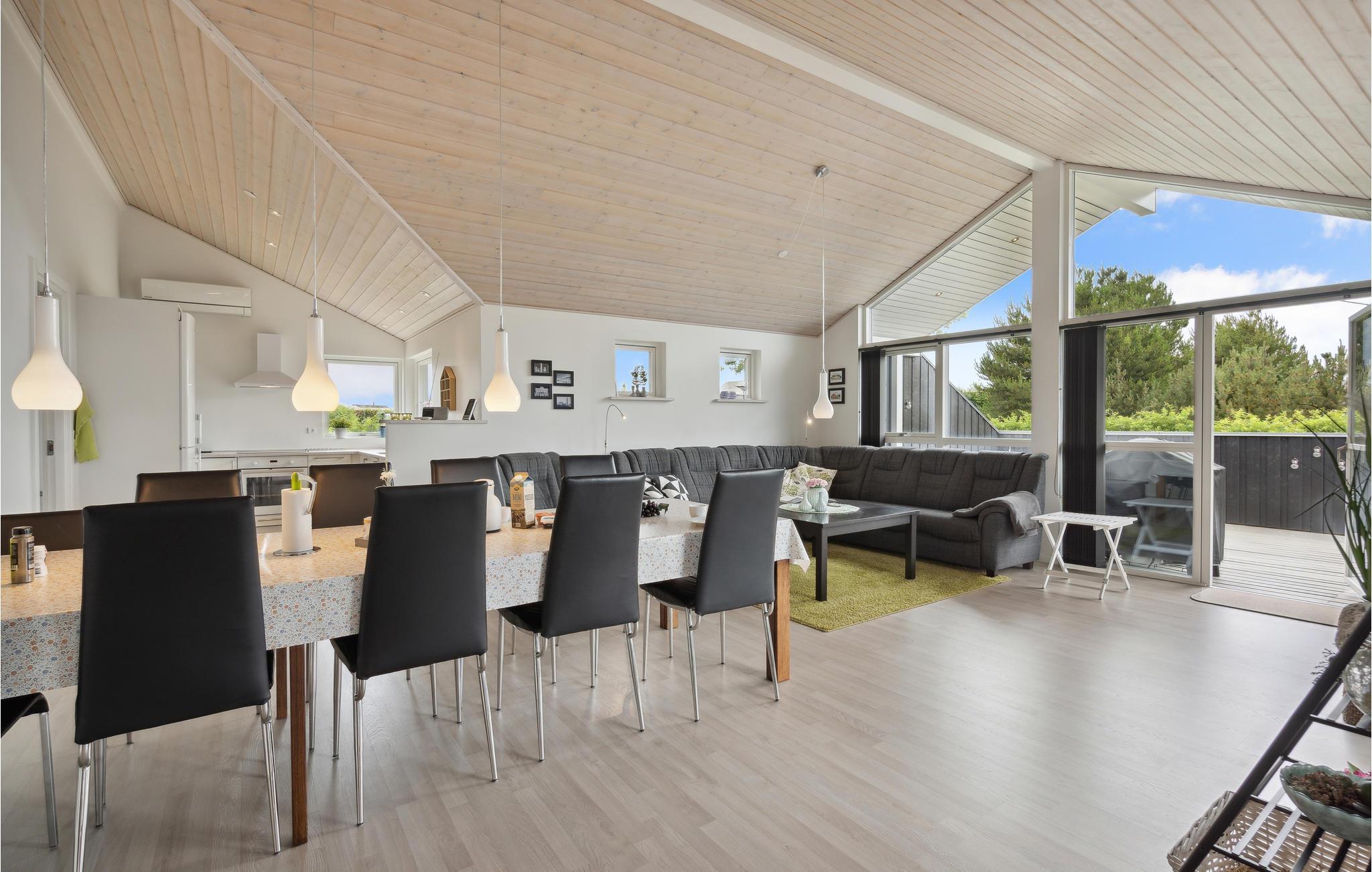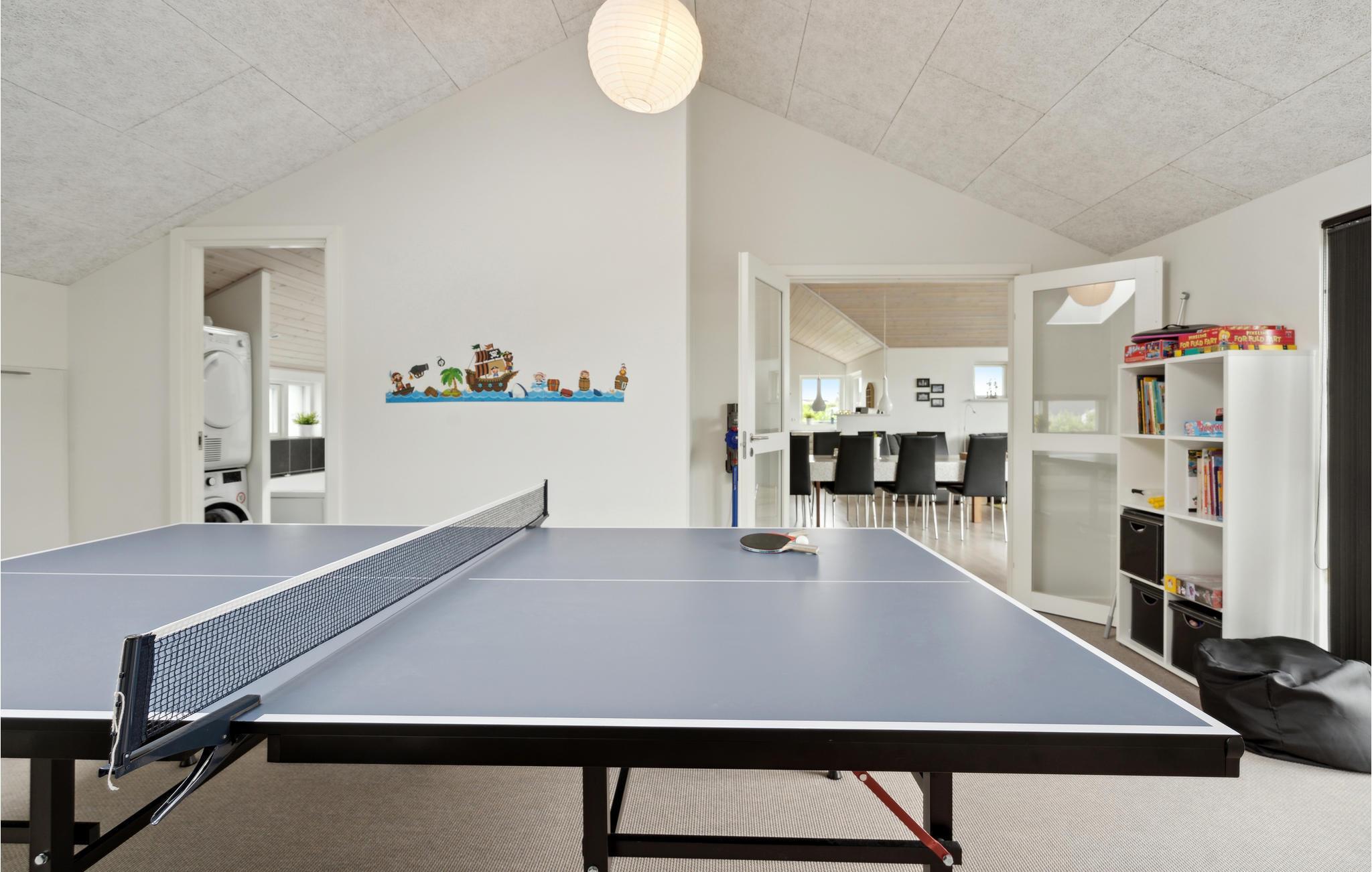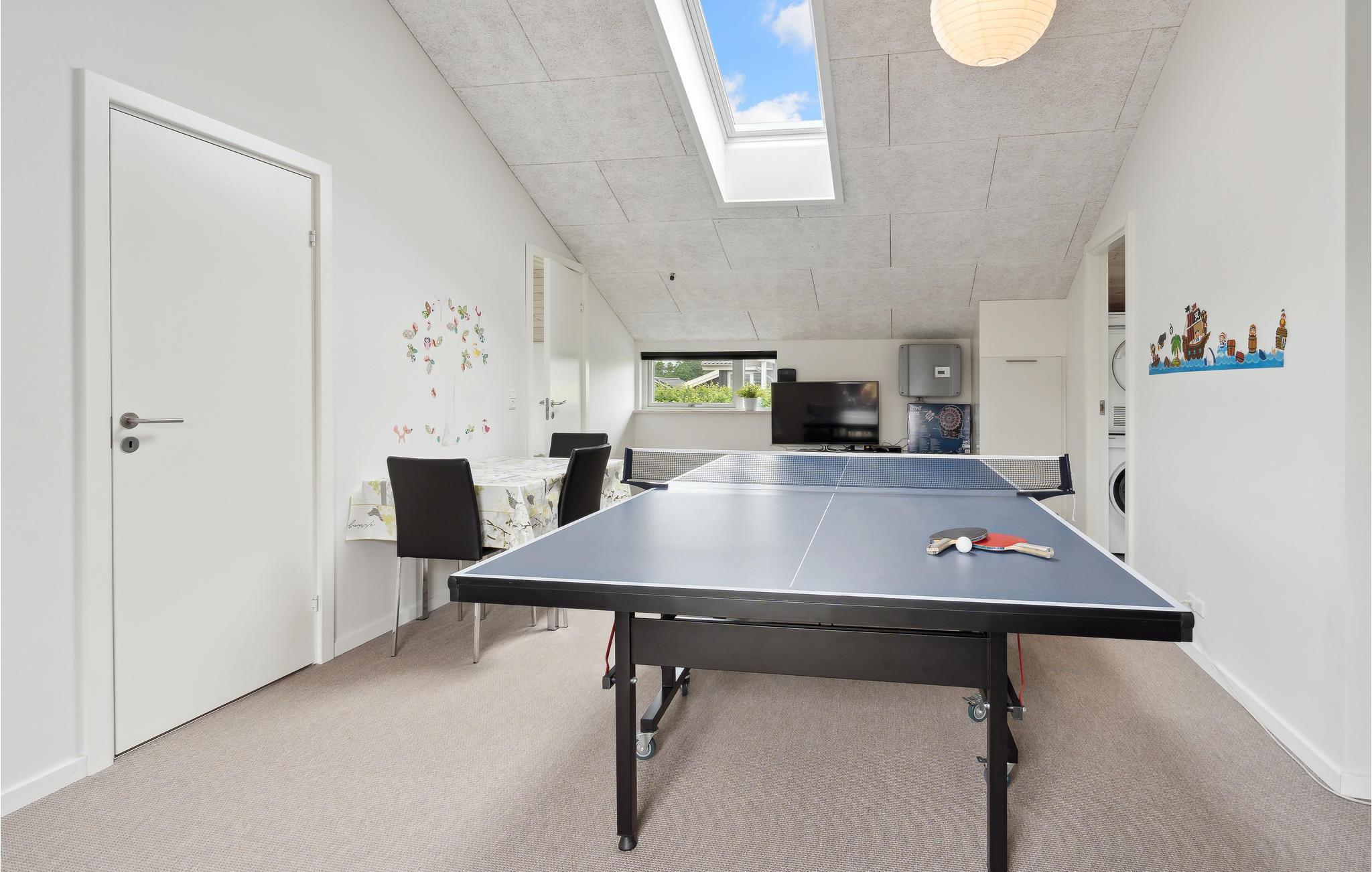 Dette skønne feriehus ligger i et sommerhusområde ved Flovt Strand, som indbyder til en dejlig ferie med sin smukke natur og dejlige sandstrand. Store vinduer oplyser stuen med et naturligt lys og bidrager til en behagelig atmosfære. Hyg jer med fælles madlavning og kæmp imod hinanden i familiens yndlingsbrætspil. Mens de små tegner eller lægger puslespil, kan de større spille bordtennis. Efter en dejlig dag på stranden kan I forkæle jer selv i spabadet eller slappe af i husets sauna. Flyt alle måltiderne udenfor på varme dage. På terrassen kan I tilbringe mange hyggelige timer under åben himmel. Glæd hele familien med bål og snobrød.