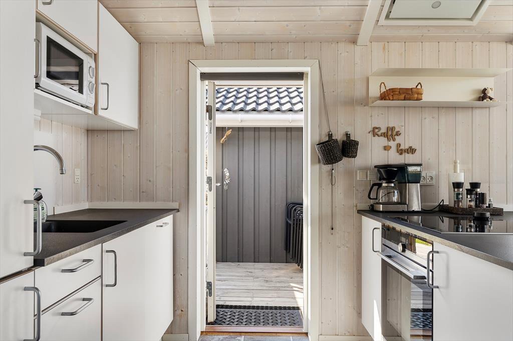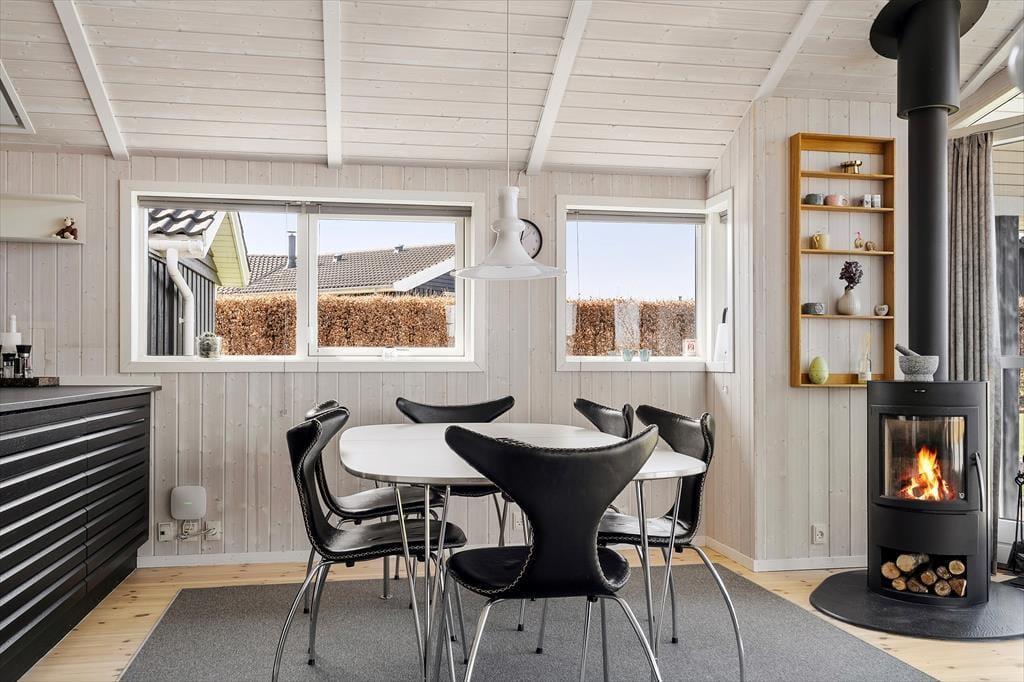 Når du træder ind i sommerhuset, mødes du af en lys og imødekommende atmosfære med loft til kip og store vinduespartier, der lader lyset strømme ind. Indretningen er hyggelig og funktionel – her kan hele familien samles om madlavningen i det åbne køkken, mens snakken går ved spisebordet. Stuen indbyder til afslapning med bløde møbler og et dejligt kig ud til den grønne have. Badeværelset er et kapitel for sig: Her kan du sænke skuldrene i spaen efter en frisk gåtur langs stranden eller en stille stund på terrassen. Huset er skabt til ro og nærvær – og til at give dig den ferie, du længes efter.