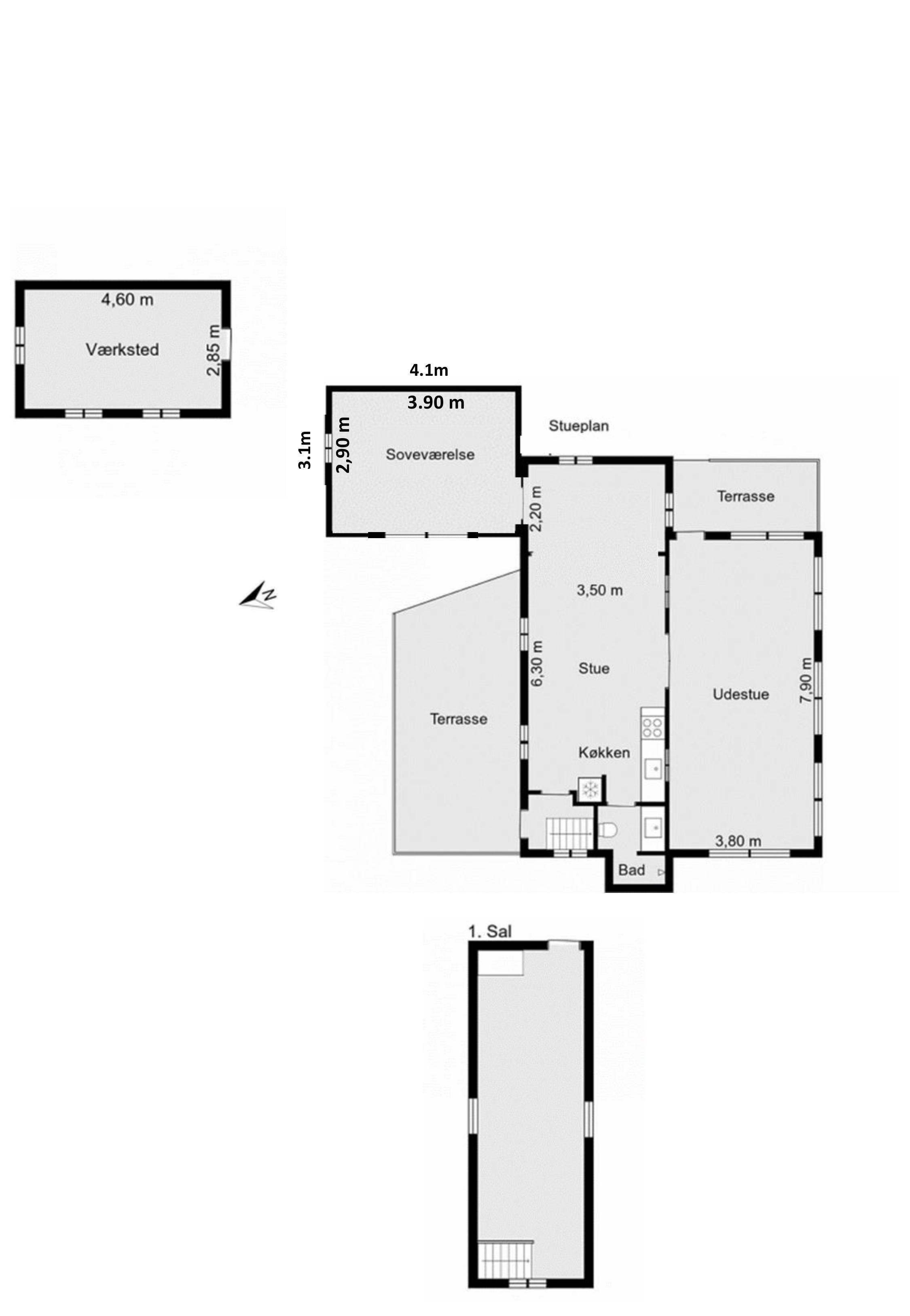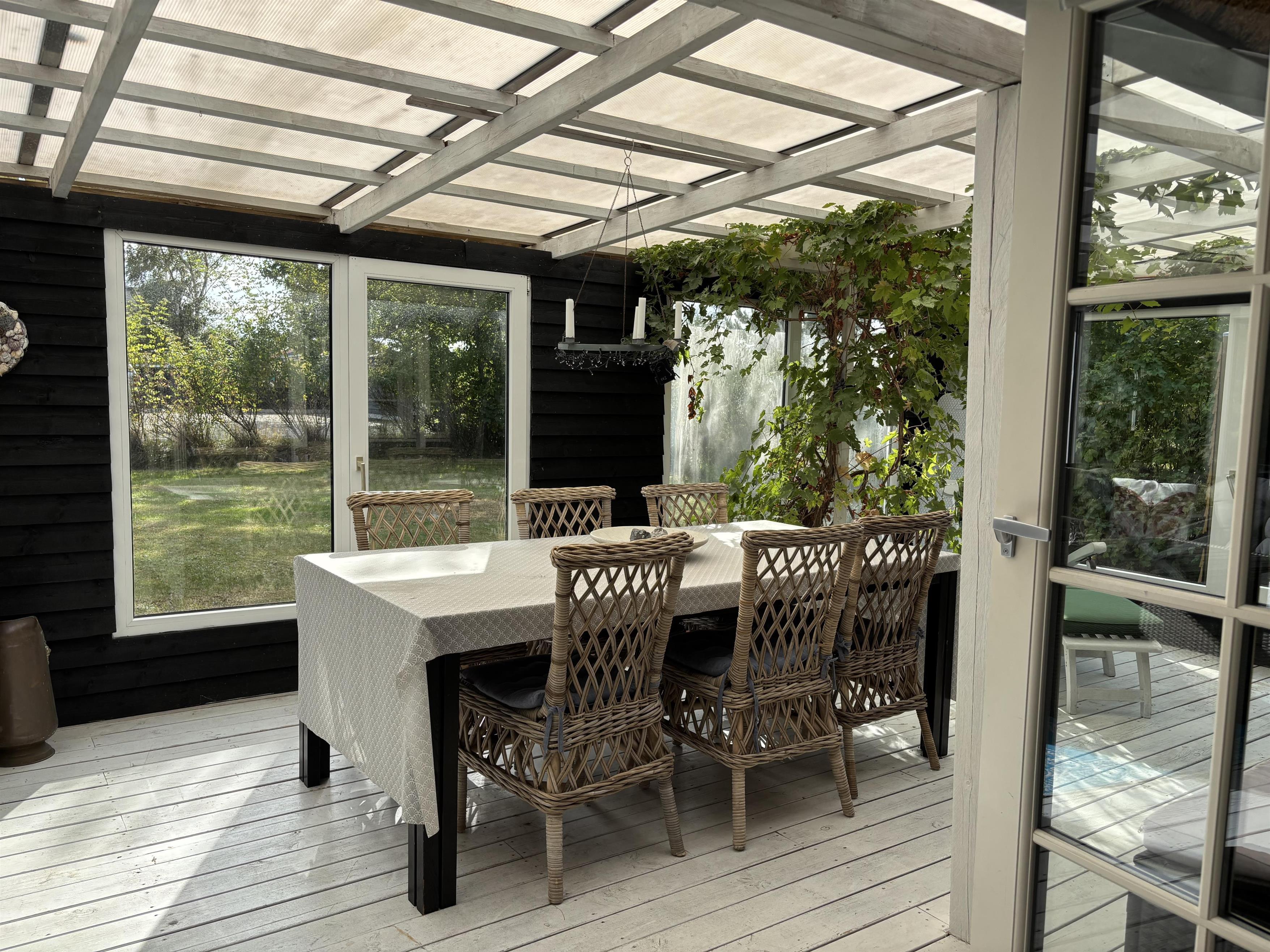 Fra stuen træder du ud i en skøn, lys udestue med spiseplads til 6 personer. Her kan familien nyde lange sommeraftener, hygge sig med brætspil eller slappe af i loungesofaen med en god bog. Den frodige vinduesplante, der slynger sig op langs taget, skaber en helt særlig stemning.