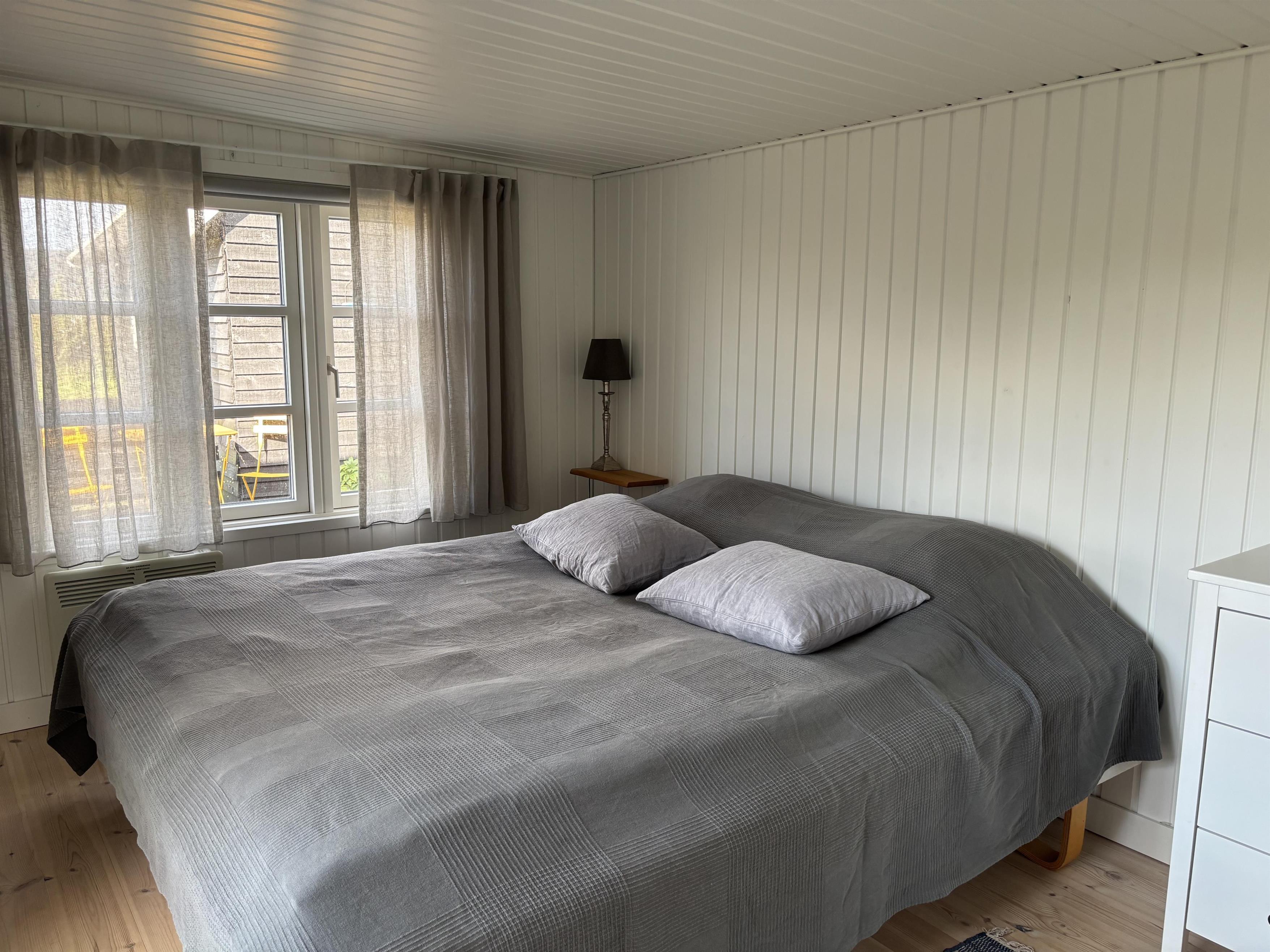 Udenfor venter flere hyggelige opholdsområder: En mindre terrasse med spiseplads, en stor træterrasse med bålplads og små kroge til afslapning. Den grønne plæne giver masser af plads til leg og udendørs aktiviteter for både børn og voksne. Ydermere bydes der også på en udebruser, så man nemt kan skylde sandet af, efter en tur ved stranden.