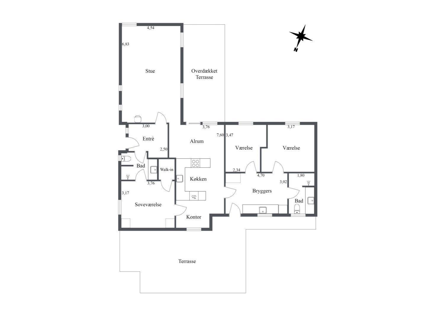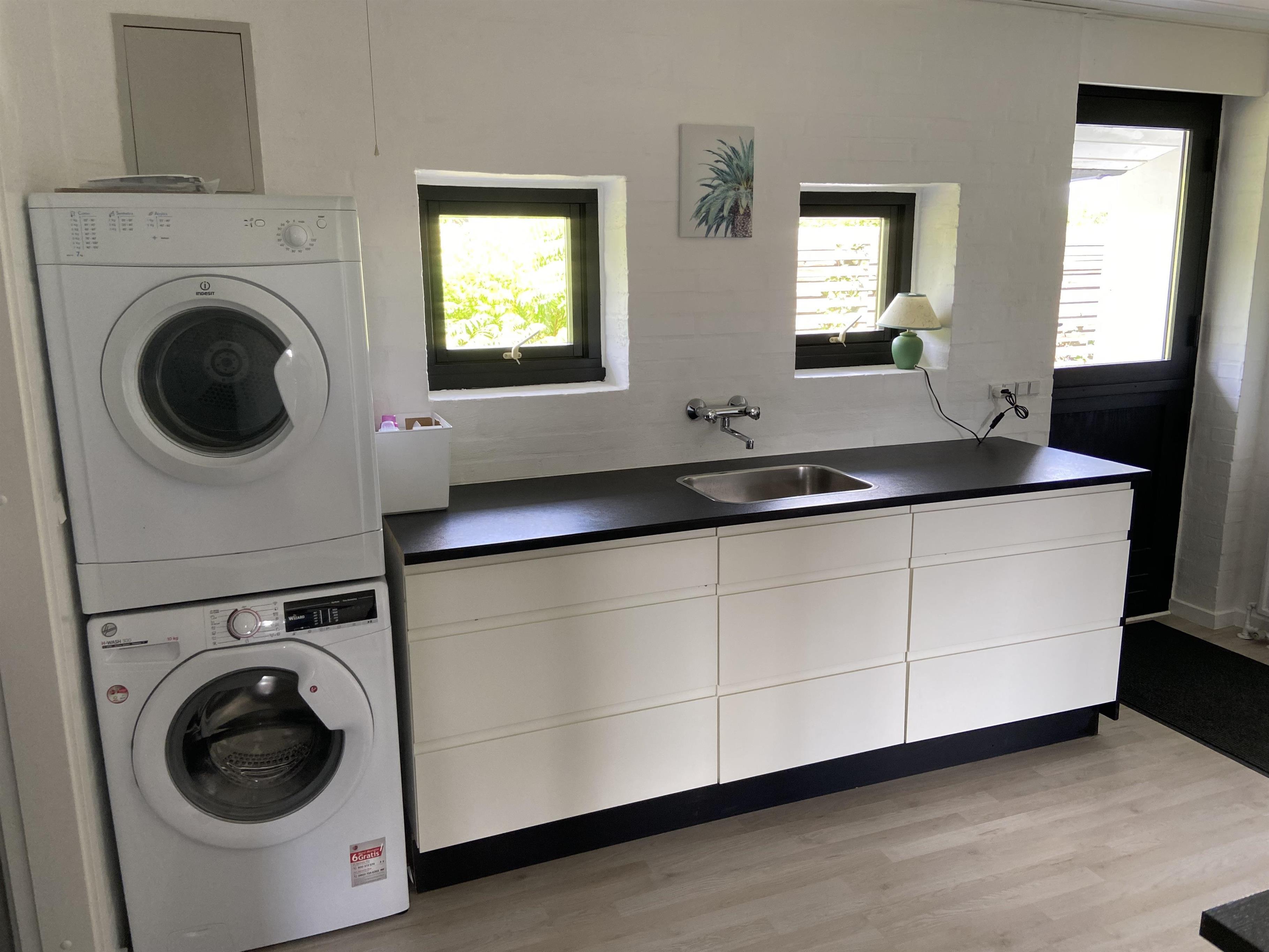 Fra køkkenen er der udgang til terrasse og den afskærmet have, hvor de lyse aftner kan nydes. Græsplænen ligger op til boldspil, kongespil og leg