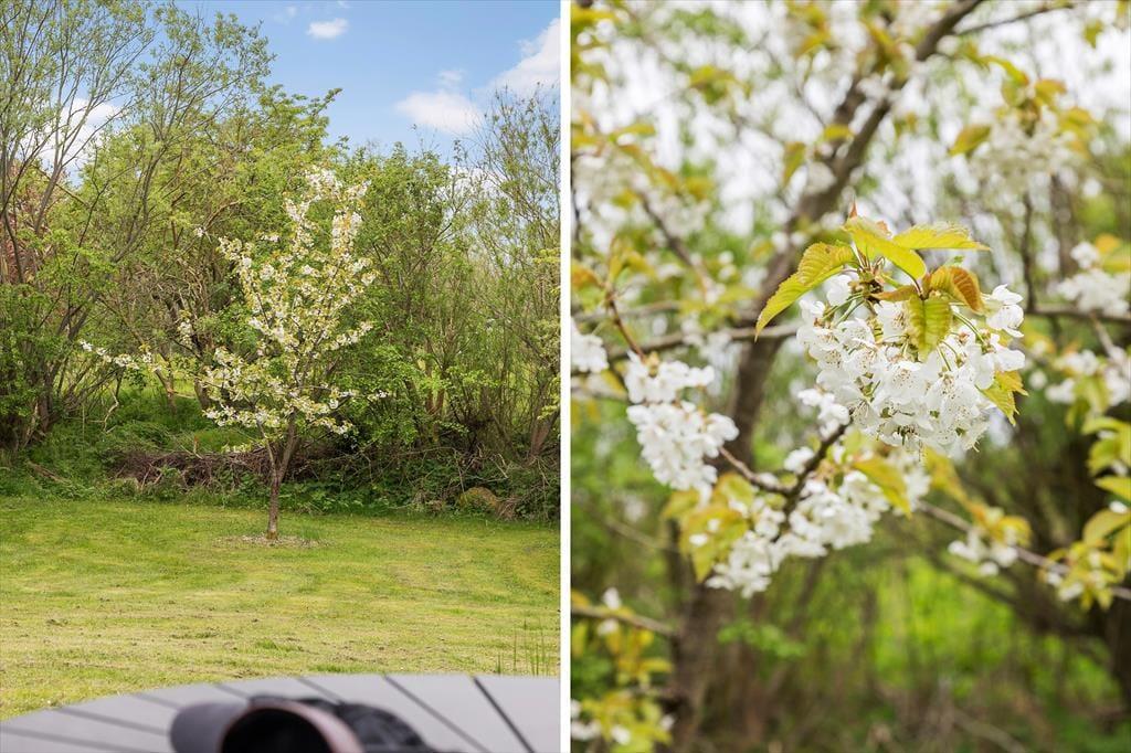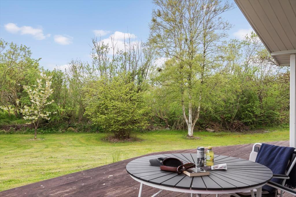 Naturgrunden er stor og grøn, og randbeplantningen skærmer udearealerne godt af, så det er et dejligt sted at være, når solen skinner fra oven, og du har en kølig forfriskning ved din side. Husets træterrasse er stor, så der er flere steder, du kan slå dig ned – inklusiv et overdækket areal, hvis du vil blive ude, selvom tusmørket breder sig, og duggen snart vil falde. Børn og barnlige sjæle vil elske at have plads til at spille bold og dyste i havespil på græsplænen, og mon ikke, at luften føles ekstra ren og frisk, når du bor bare 200 meter fra kysten?