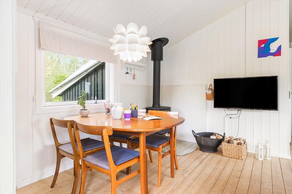 Sommerhusets 60 m2 er godt udnyttede, og du og dine kære kan se frem til at slappe af i lyse og stemningsfulde omgivelser. Planløsningen byder på en rummelig entré, to gode soveværelser og et badeværelse med bruseniche, men de fleste af dagens vågne stunder kommer sikkert til at udspille sig i opholdsrummet, hvor stuen og køkkenet er forenet. Hvis det ikke er dig, der har madtjansen, kan du eventuelt sætte dig på en af barstolene for at holde kokken med selskab, og du har selvfølgelig også mulighed for at slænge dig i sofahjørnet med en krydsogtværs eller en god bog – og udsigt til den hyggeskabende brændeovn.