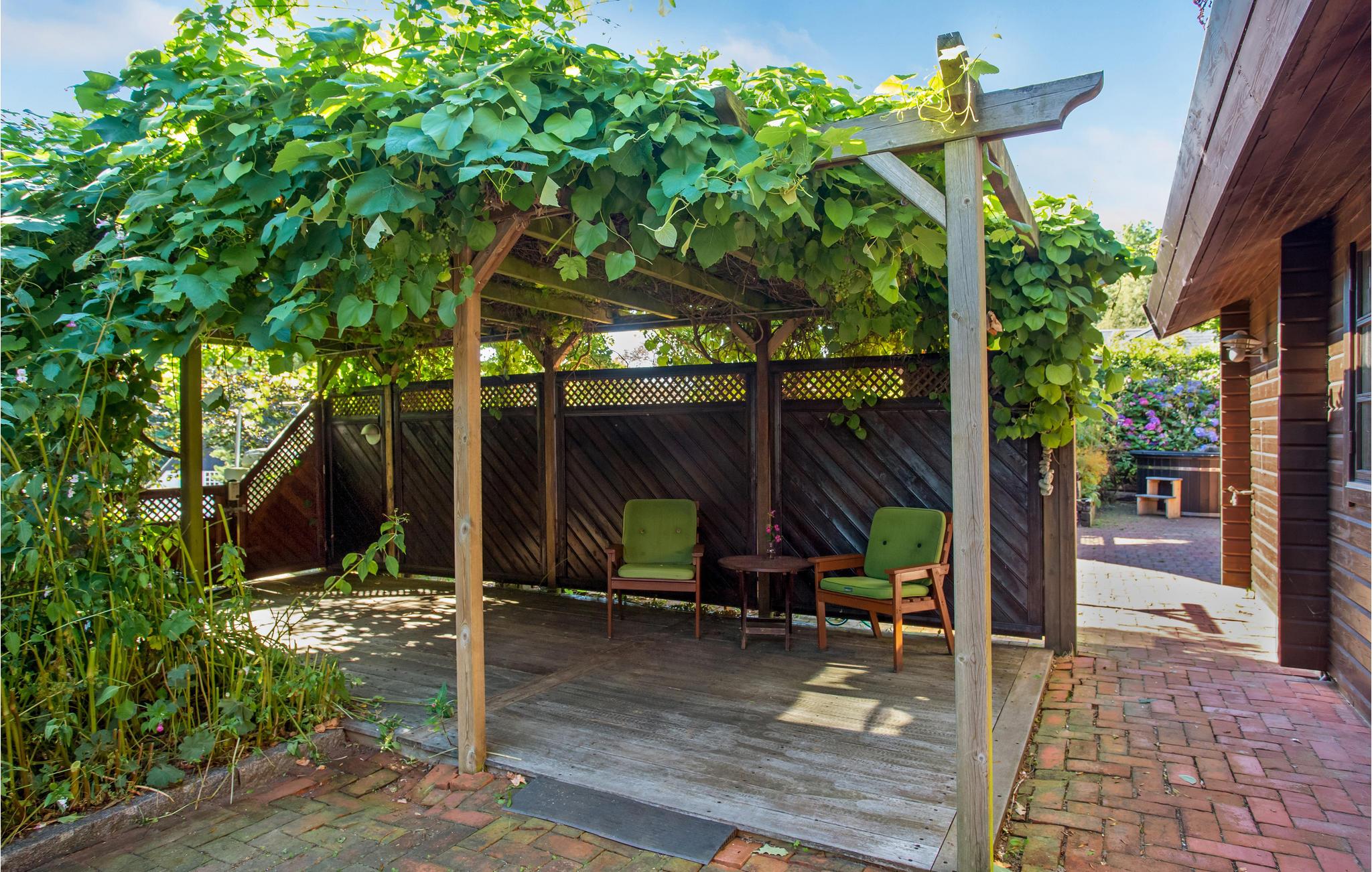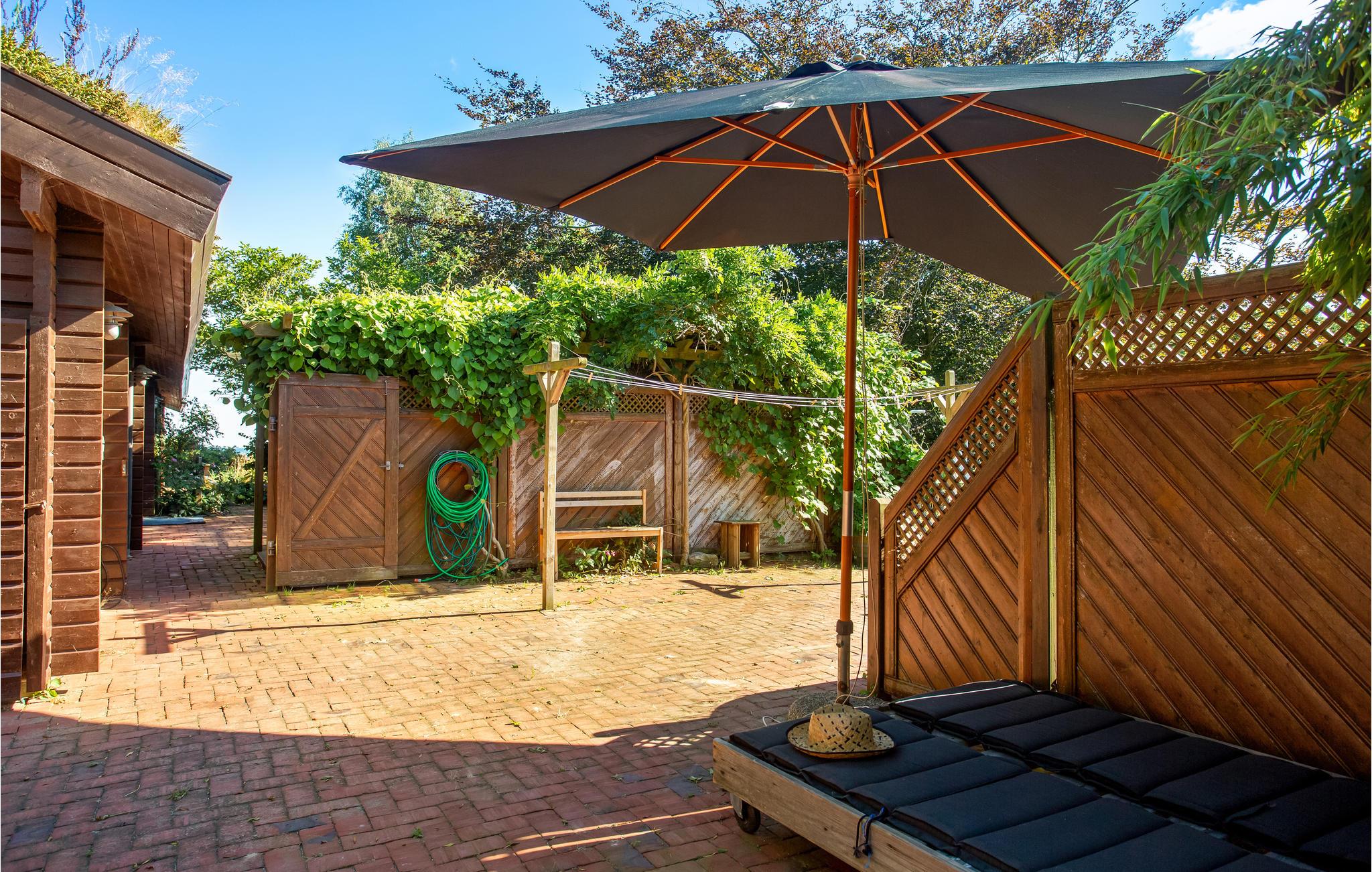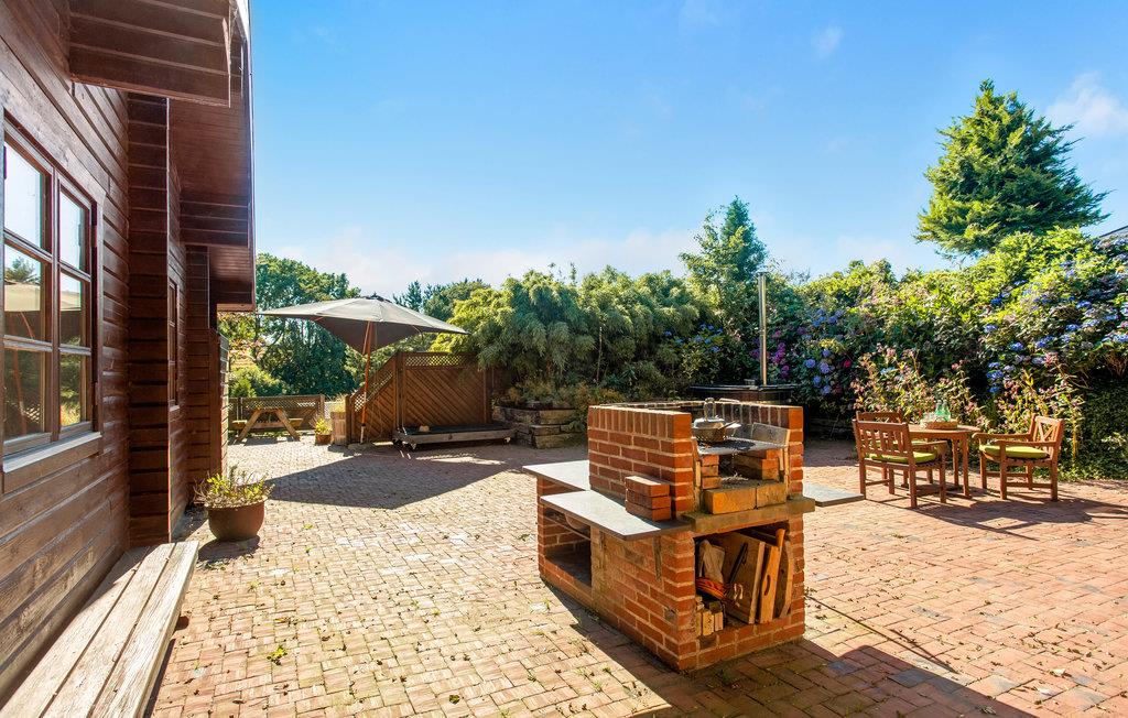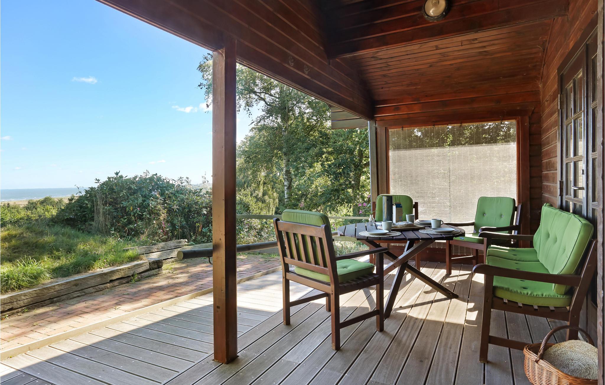 Med til huset hører en stor grund med gårdhave, mange gode solkroge, udekøkken og naturligvis det lækre vildmarksbad. På en af terrasserne kan I nyde morgenkaffen med udsigt til Kattegat og Læsø og tilbringe de lange, lyse sommeraftener med at grille, mens I lytter til fuglefløjt. Skoven er meget tæt på, så I vil tit opleve løvfald i haven og på terrassen. I har også adgang til et stort, aflåseligt depotrum til opbevaring af cykler, fiskegrej m.m.