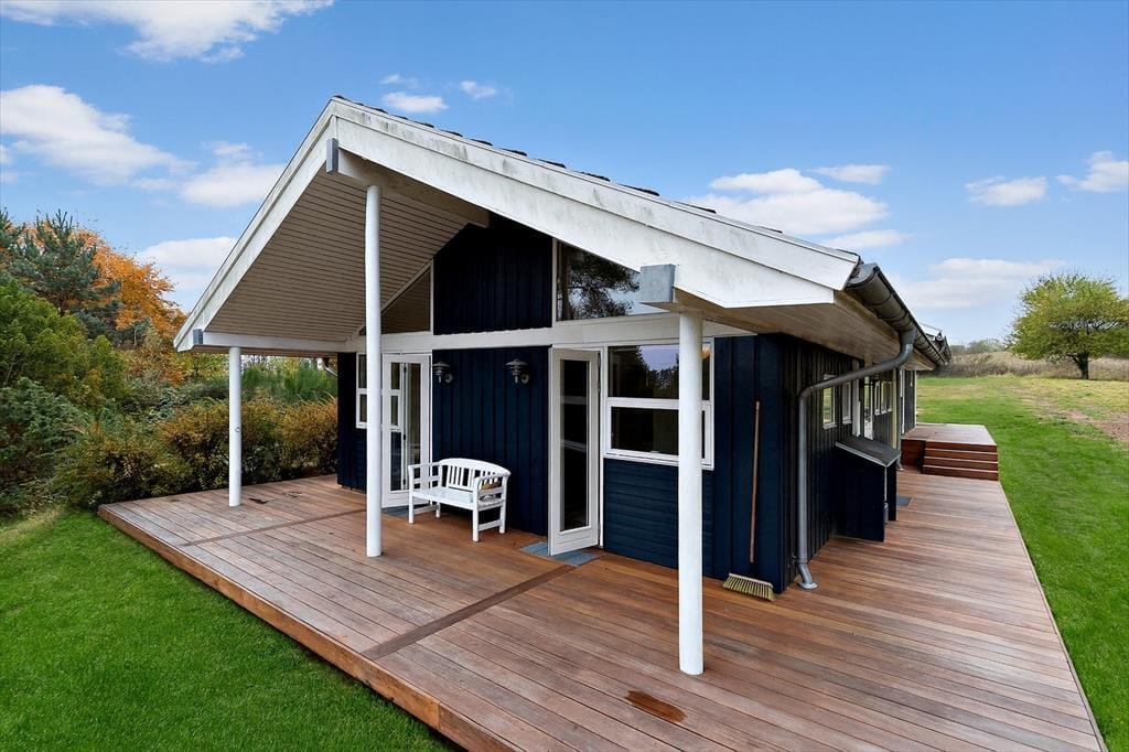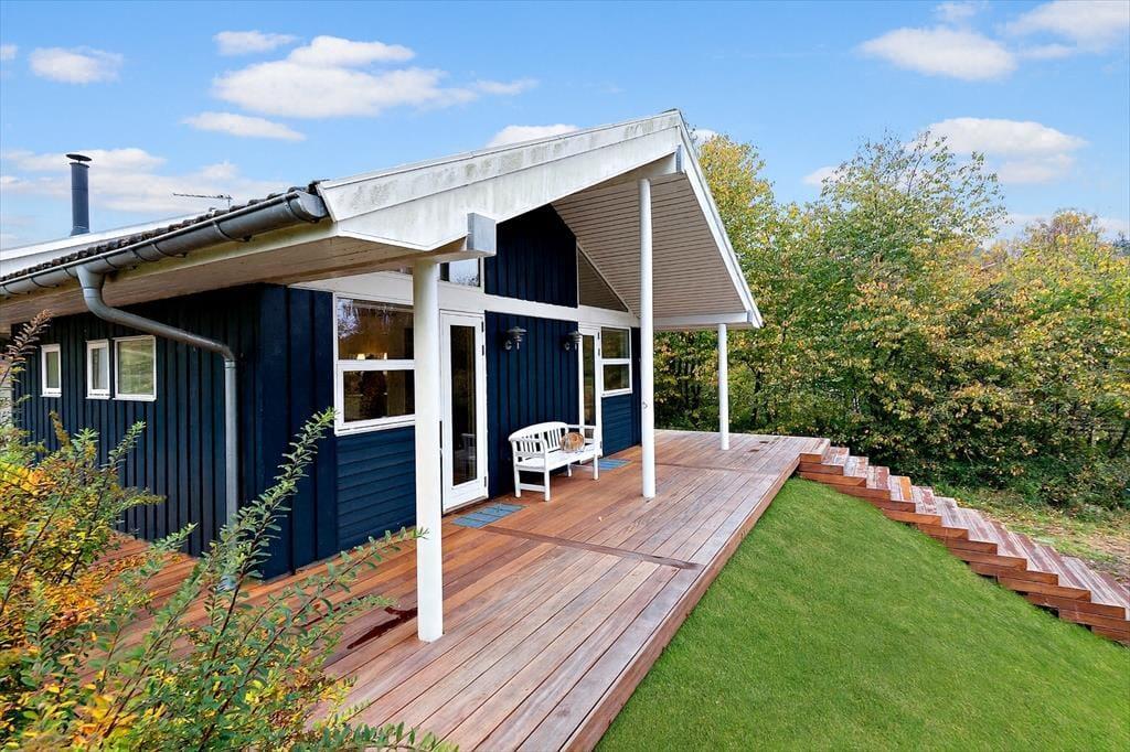 Den store nye træterrasse, som er delvist overdækket, gør det nemt at nyde udendørslivet uanset vejret. Her kan I samles omkring de smukke havemøbler og nyde fælles måltider eller en stille stund med en god bog. Terrassen indbyder til hygge og afslapning, mens børnene trygt kan lege omkring huset. Der er Weber kuglegrill i haveskuret, og fin ny flise-terrasse ved siden af, som er anlagt mhp. grill aktivitet under trygge forhold. Når mørket falder på, skaber den lune aftens luft og naturens lyde en rolig afslutning på dagen.