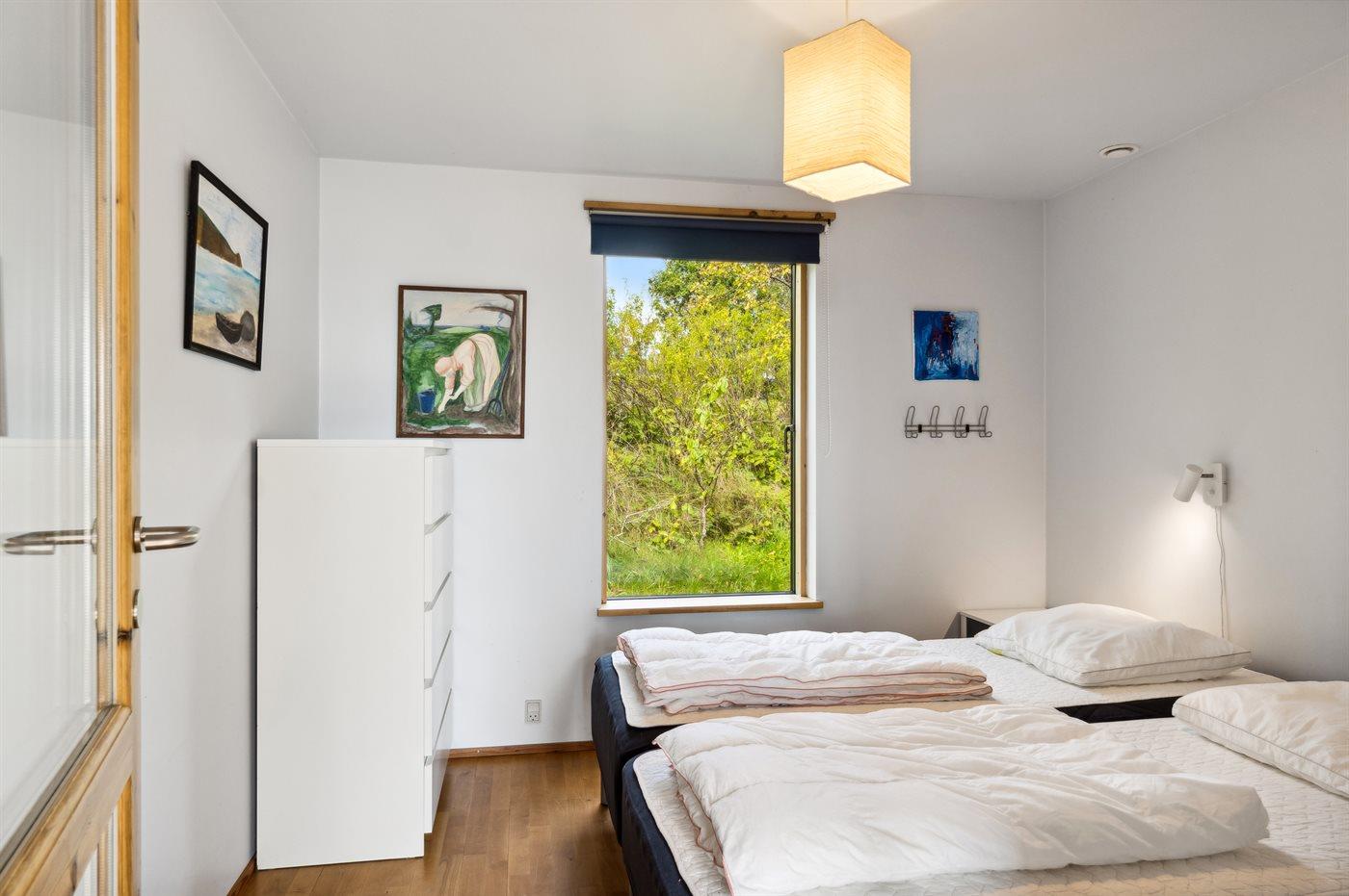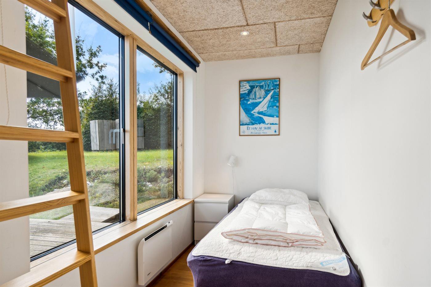 Der er i alt 3 soveværelser. Sovepladserne fordeler sig på: 4 sovepladser i dobbeltsenge. 1 soveplads i enkeltseng. 2 sovepladser på madrasser. 2 af disse sovepladser befinder sig på husets hems. Derudover er der 1 stk. barneseng.