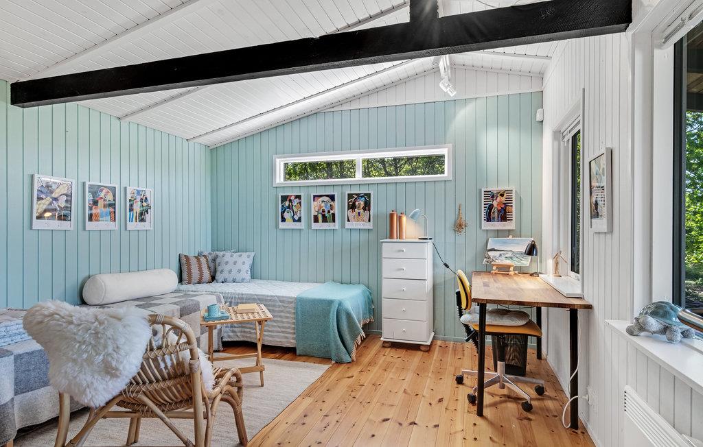 Her kan I nyde lyset og naturen, også på gråvejrsdage med ild i brændeovnen. Huset er hyggeligt udformet med et stort, åbent fællesareal, hvor I kan samles til rolige stunder efter en lang dag med oplevelser. Træværket er malet i behagelige farver, og boligen emmer af ro og afslapning.