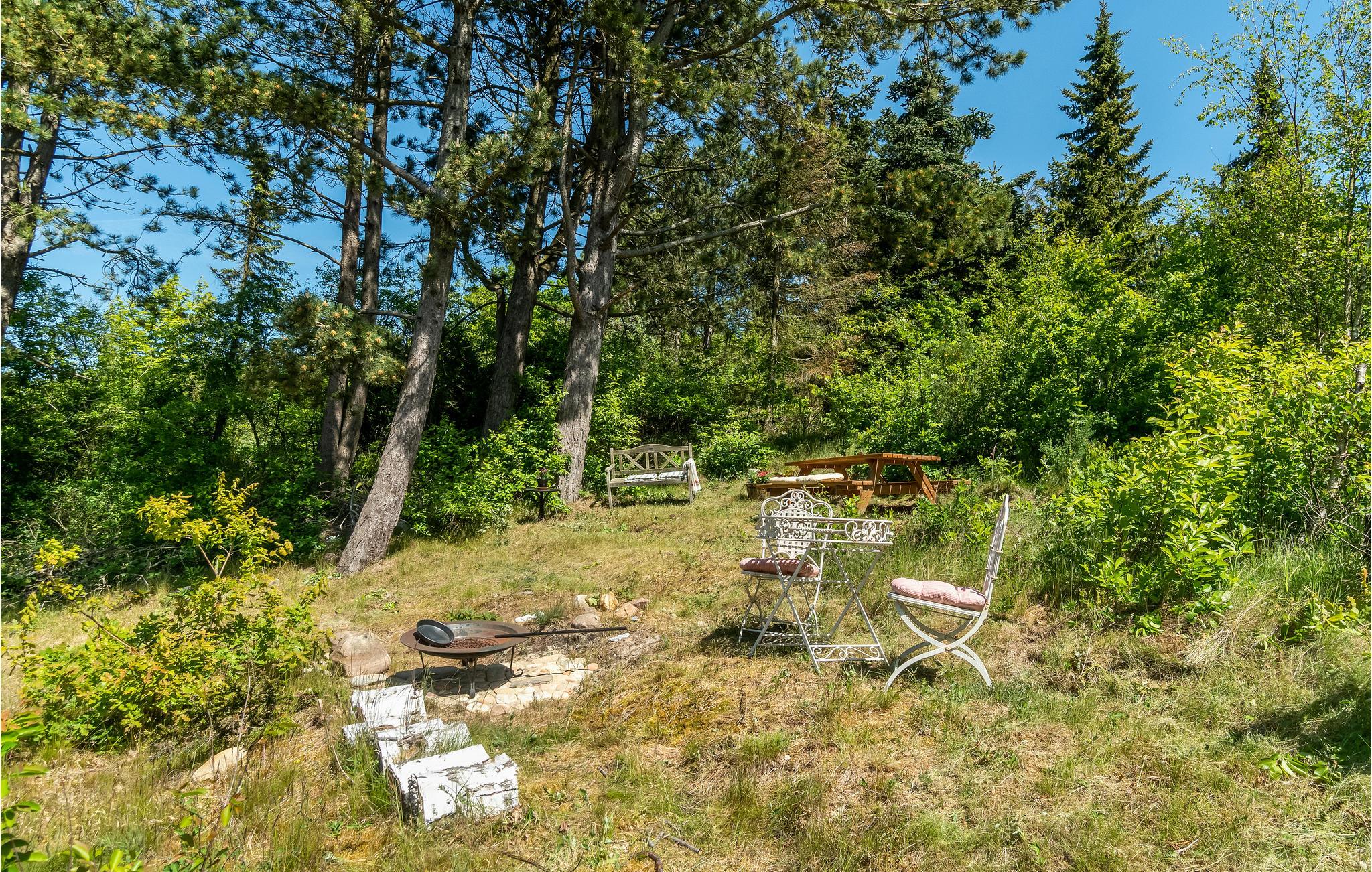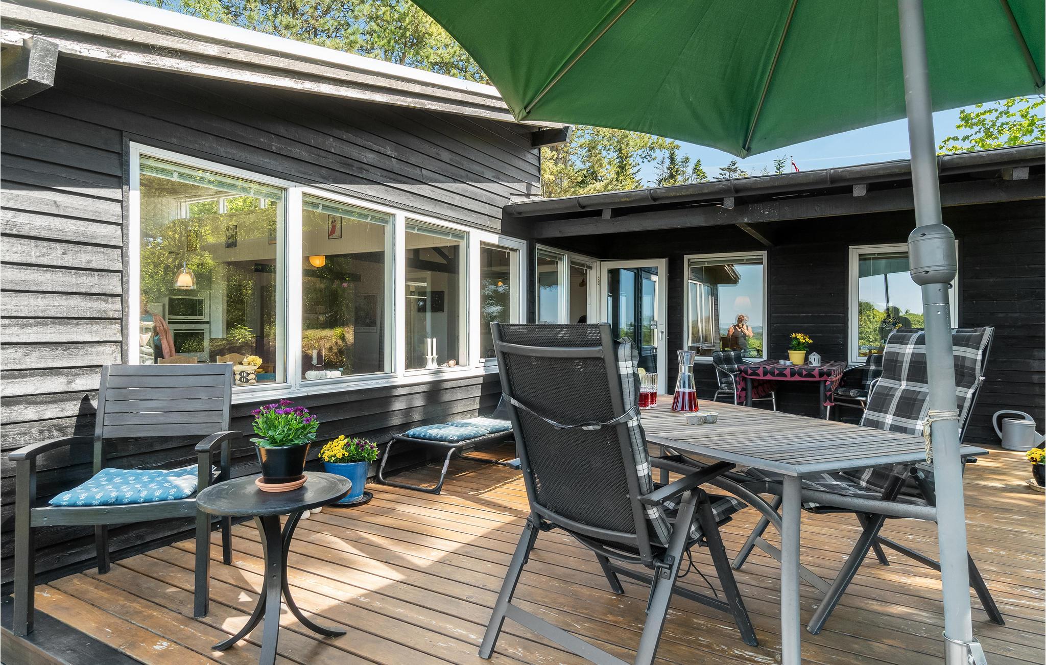 Huset ligger ugenert på en stor grund på en bakke skrånende mod vest, så man kan se ud over Begtrup Vig, Knebel Vig og Aarhusbugten. Bag huset er der desuden en bålplads, hvor I kan samles til aftenhygge i de lyse sommernætter. I kan begynde dagene med en kop kaffe på husets charmerende terrasse med morgensol, hvor I sidder helt i læ. Dæk op til sommerens måltider i det fri og tag ferieplanlægningen med ud, så I kan nyde rammerne imens.